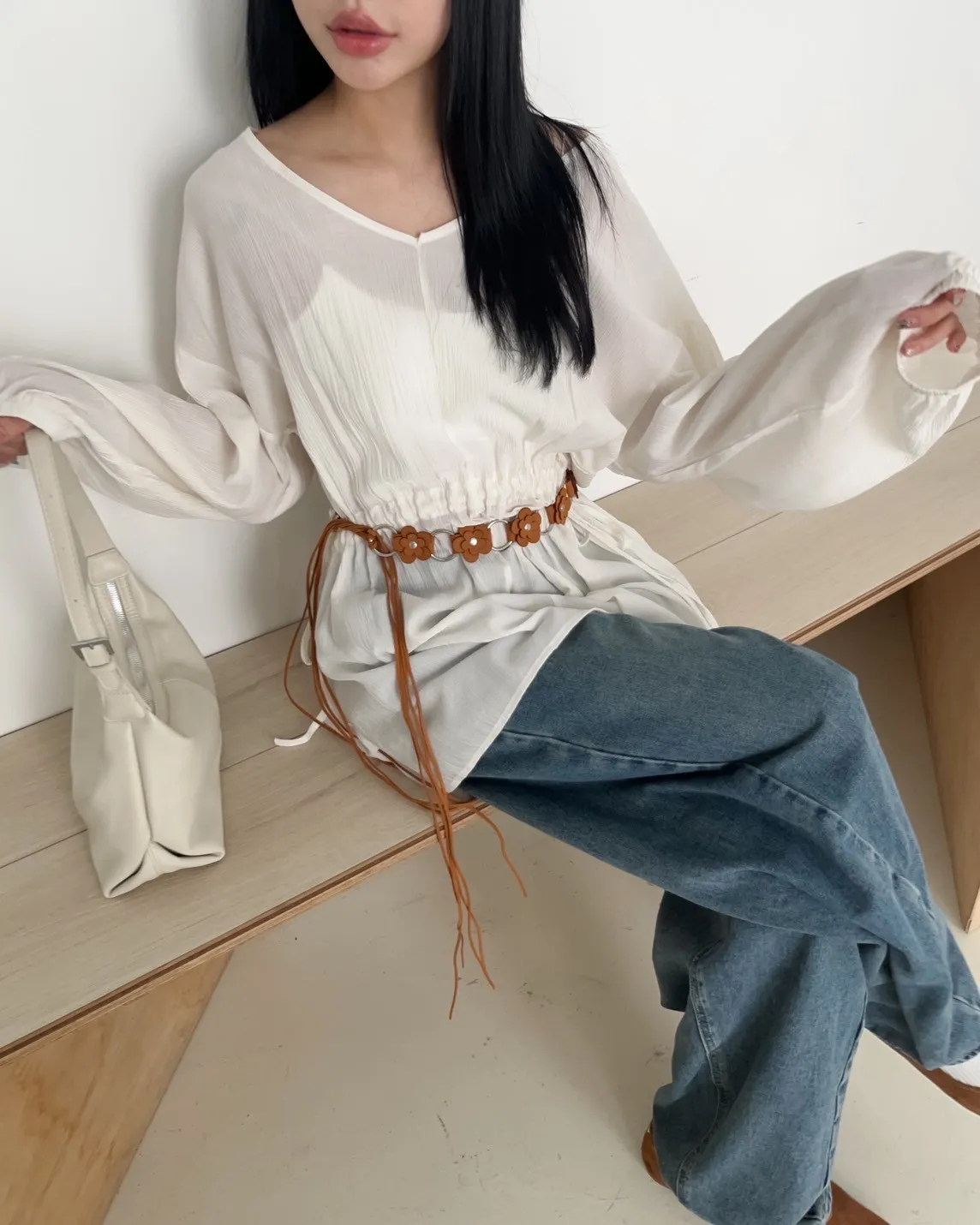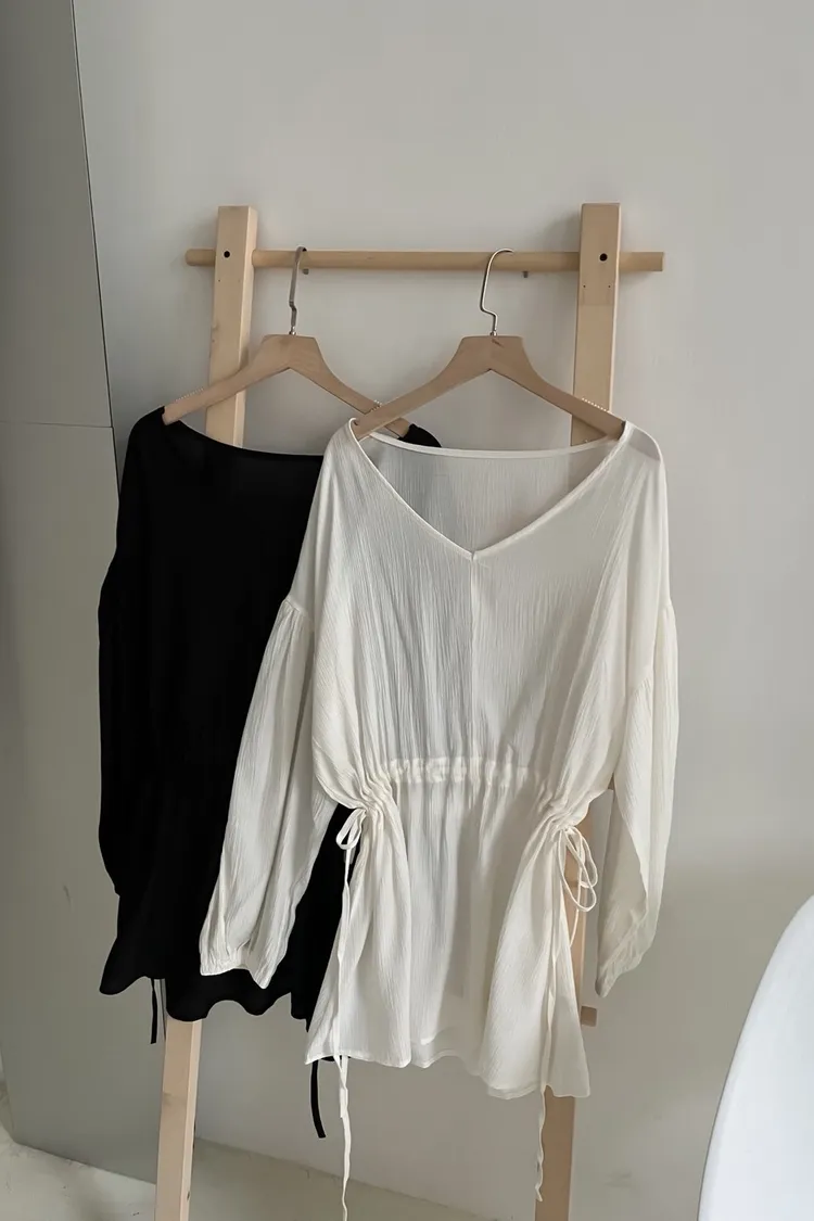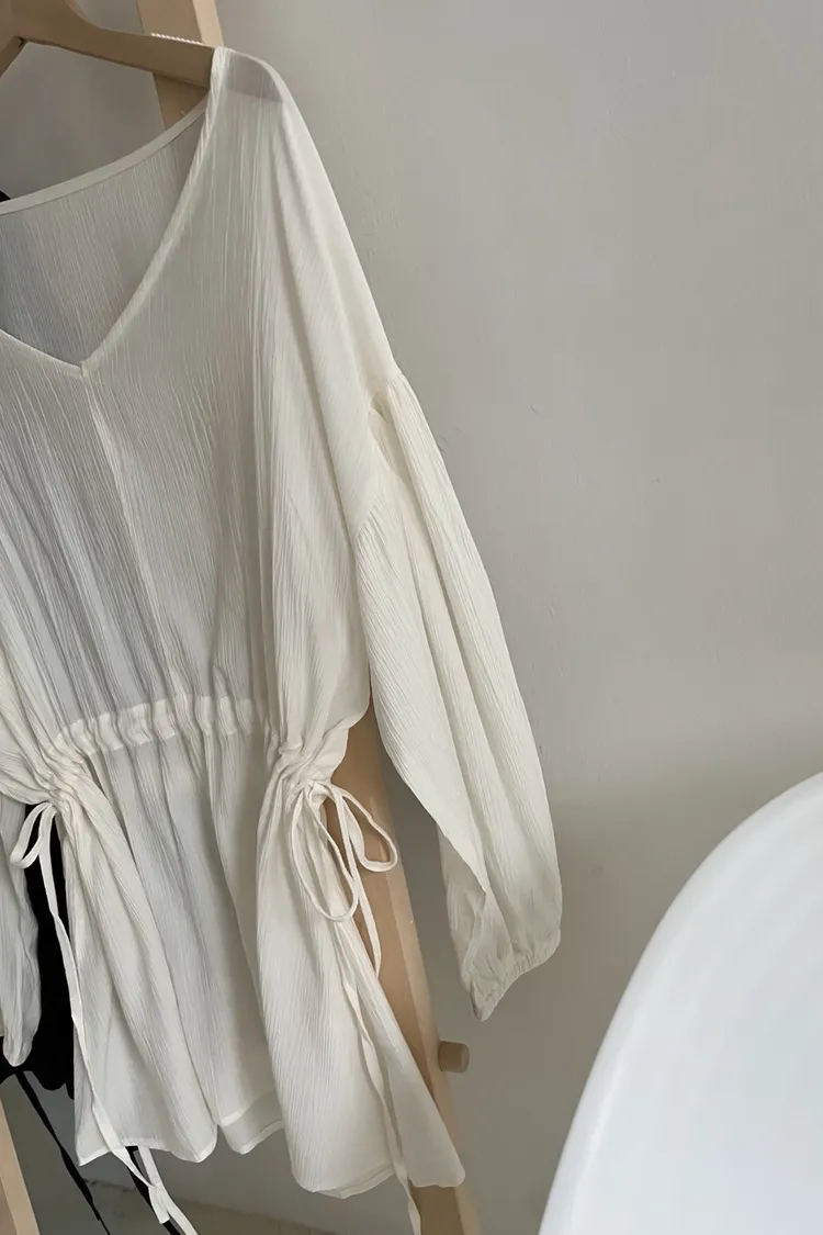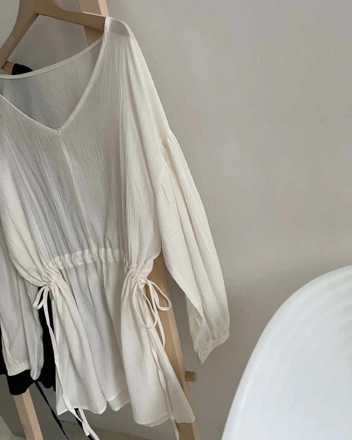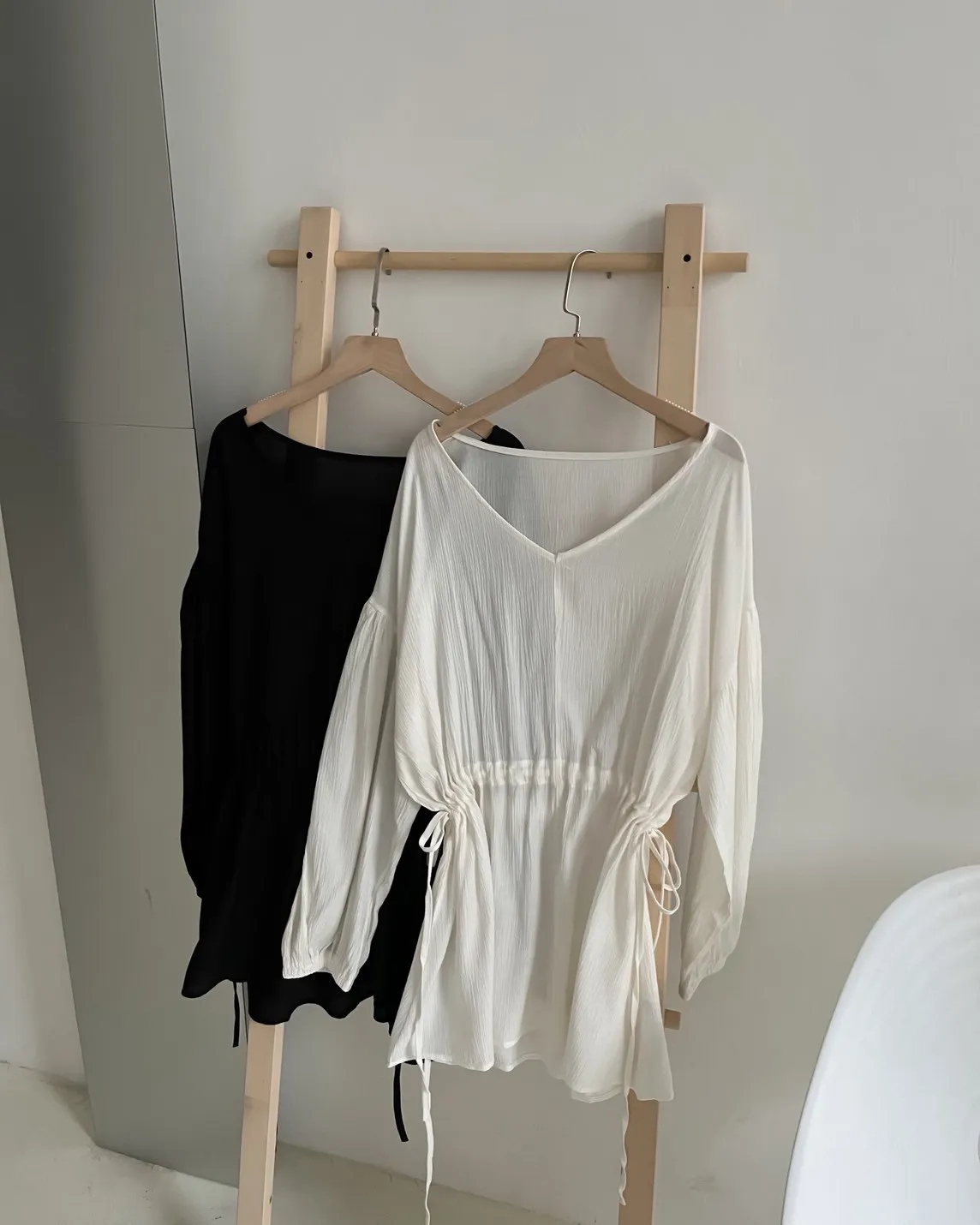 V領 微微透膚 腰部抽繩 裙襬下擺