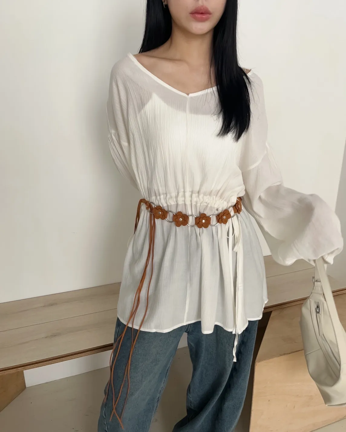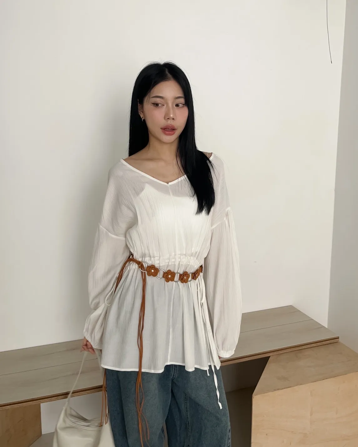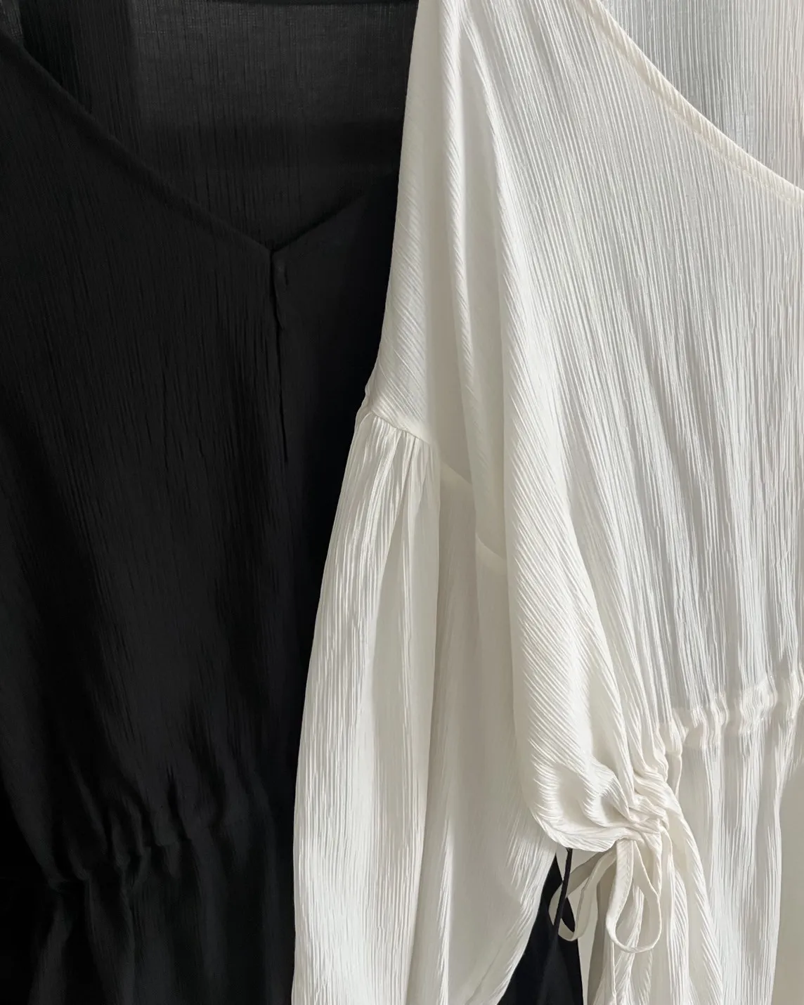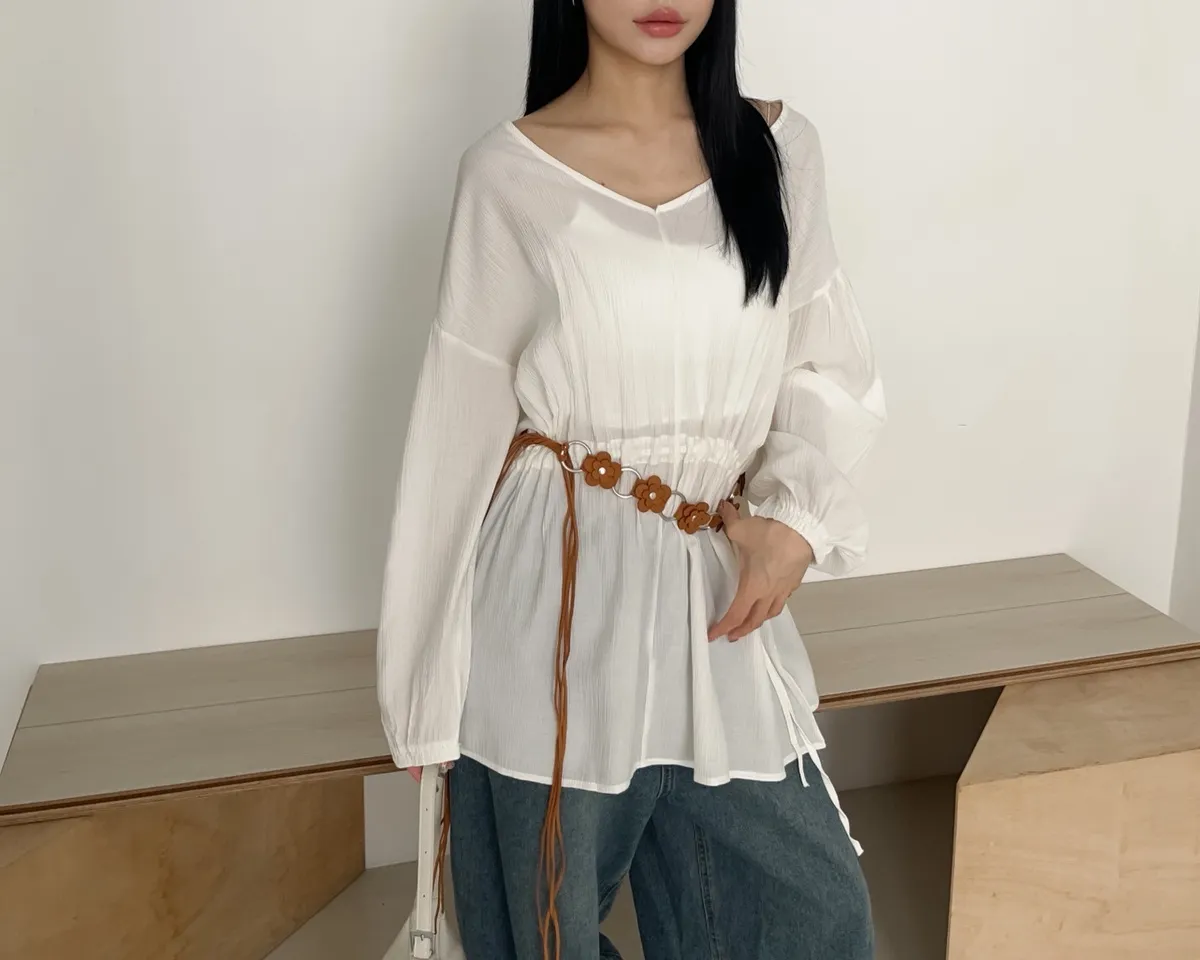 V領 微微透膚 腰部抽繩 裙襬下擺