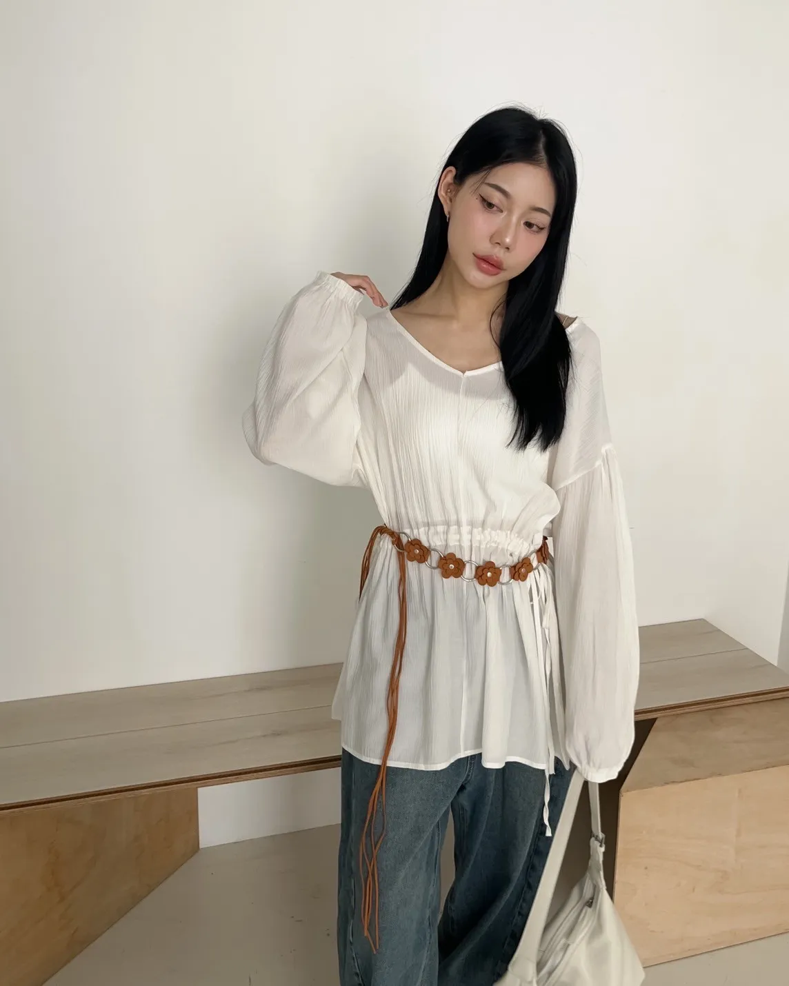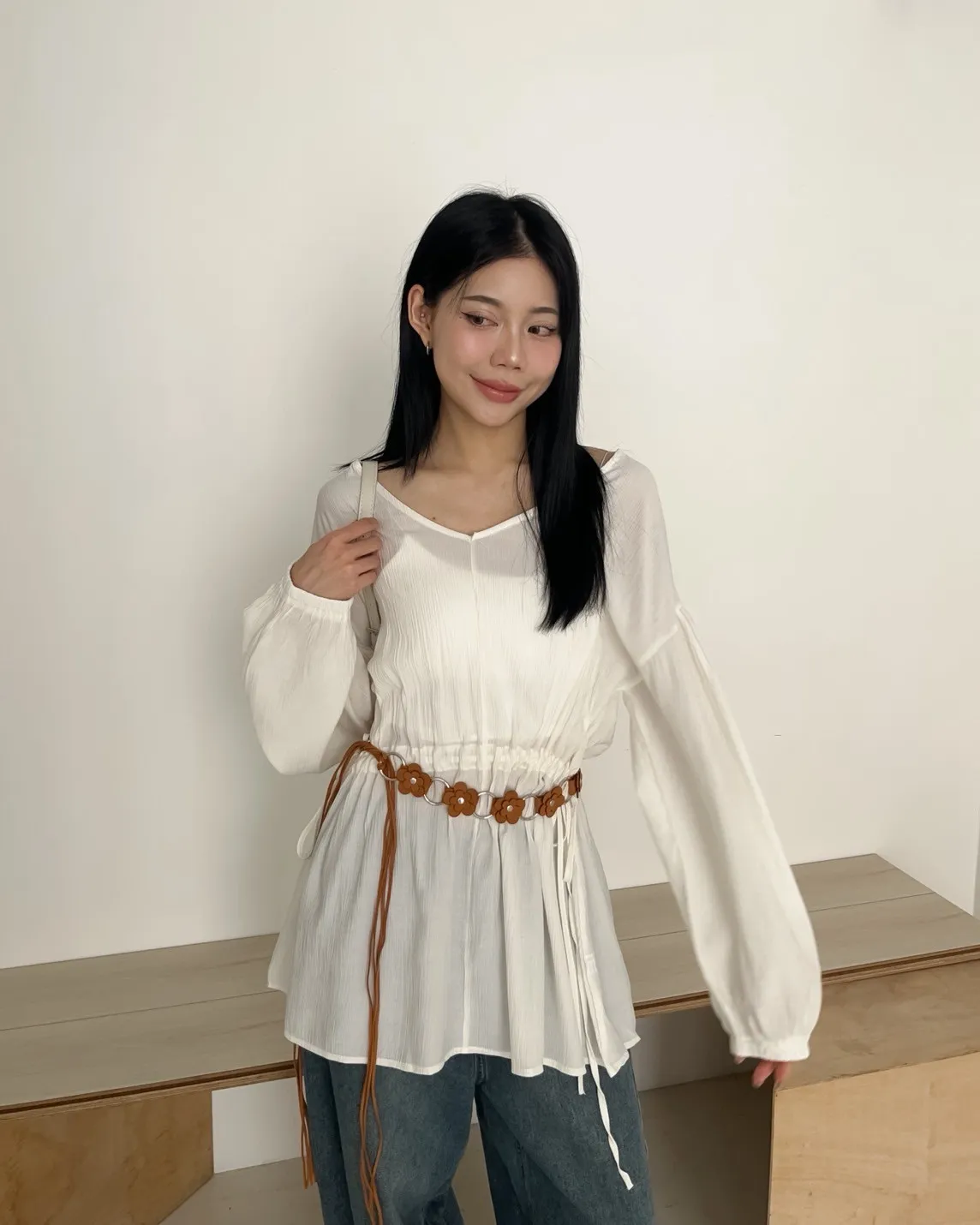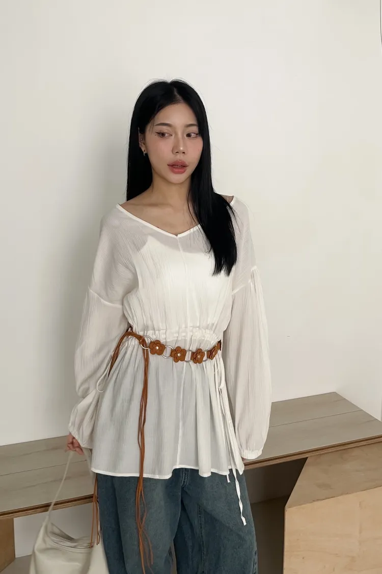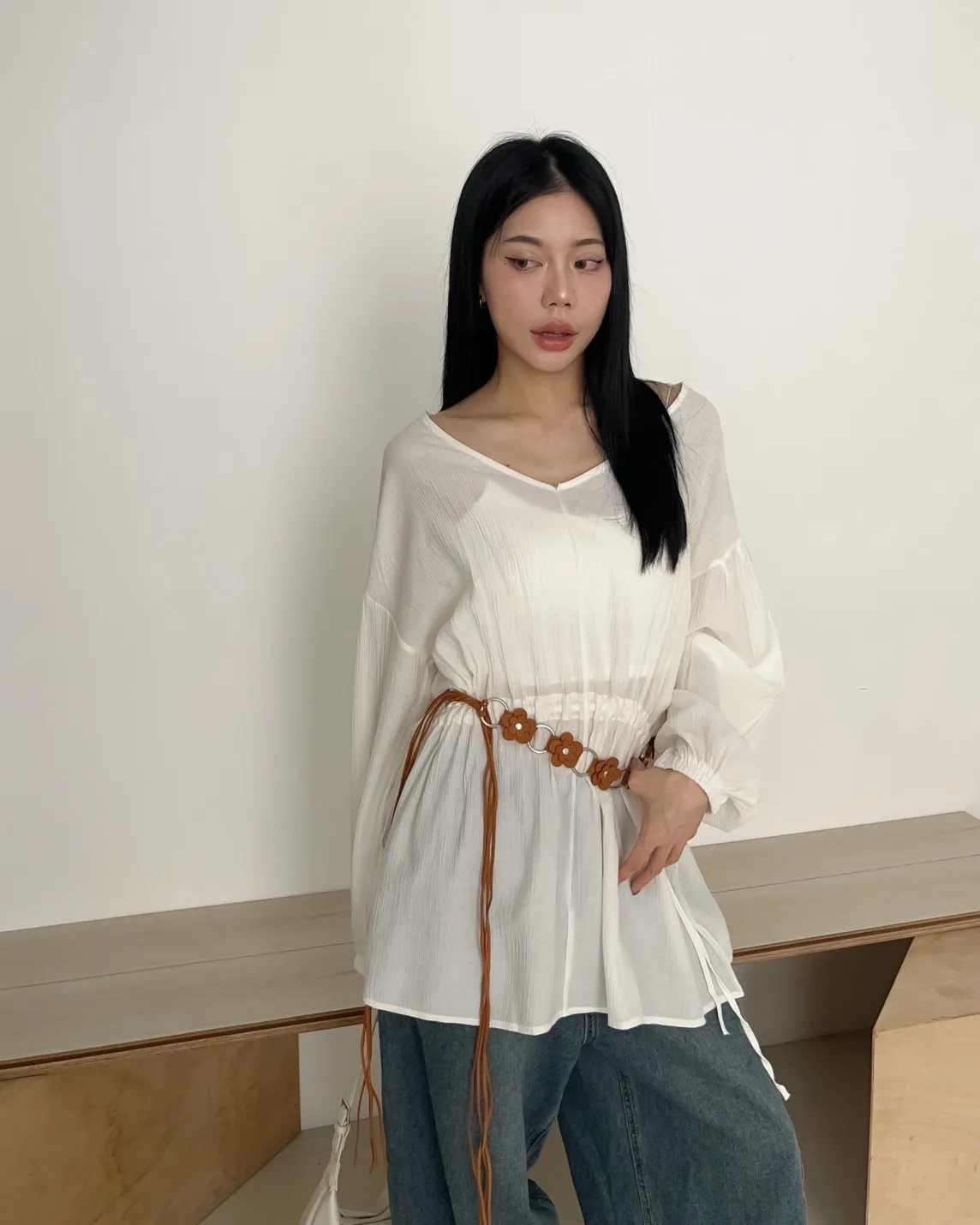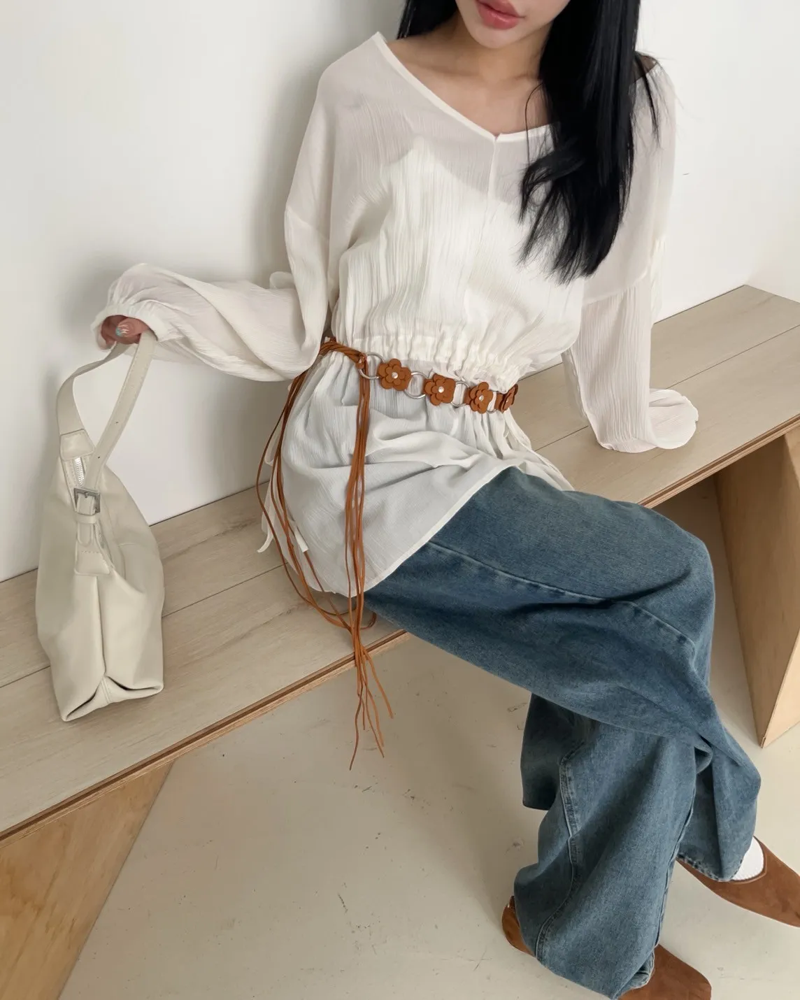 V領 微微透膚 腰部抽繩 裙襬下擺