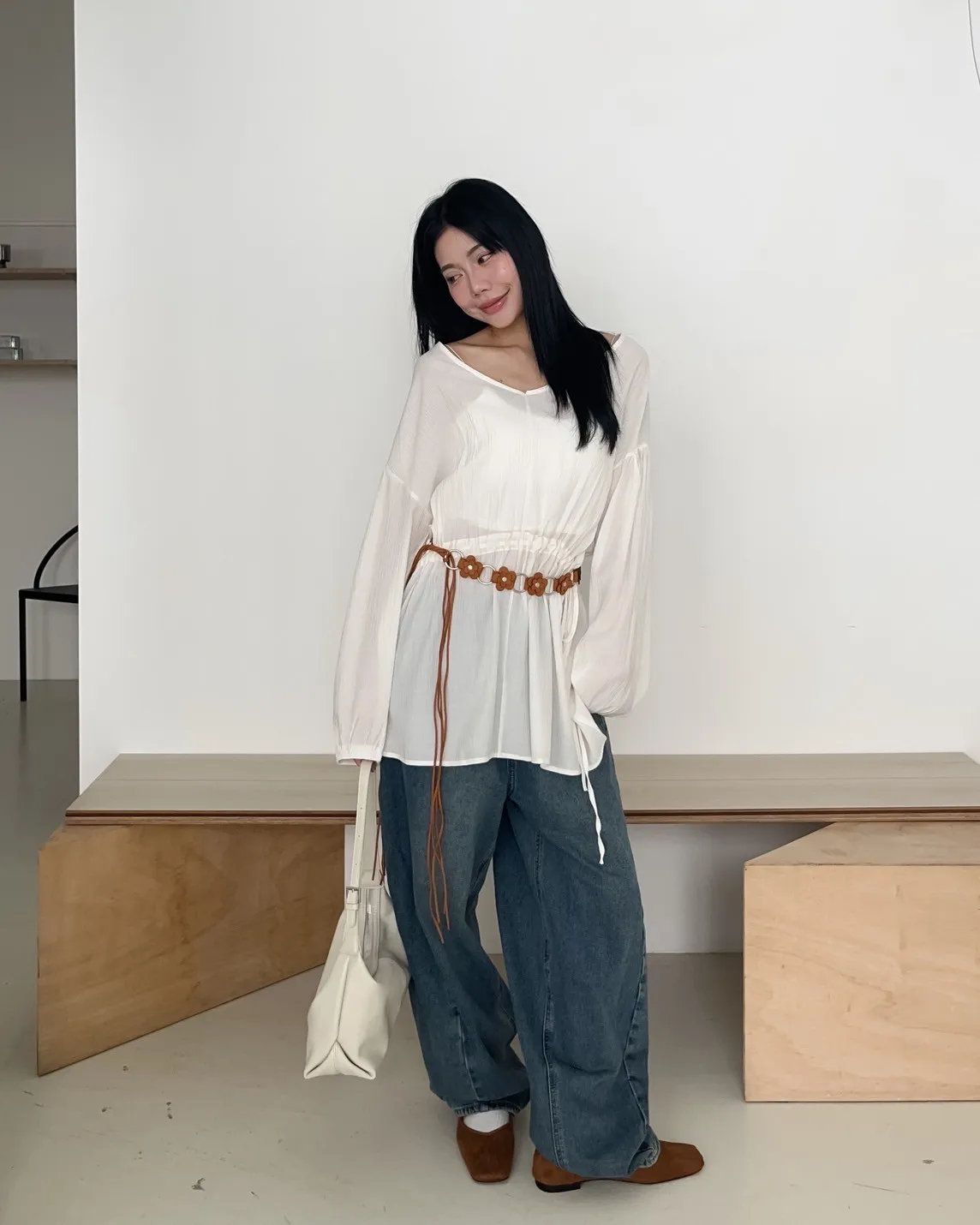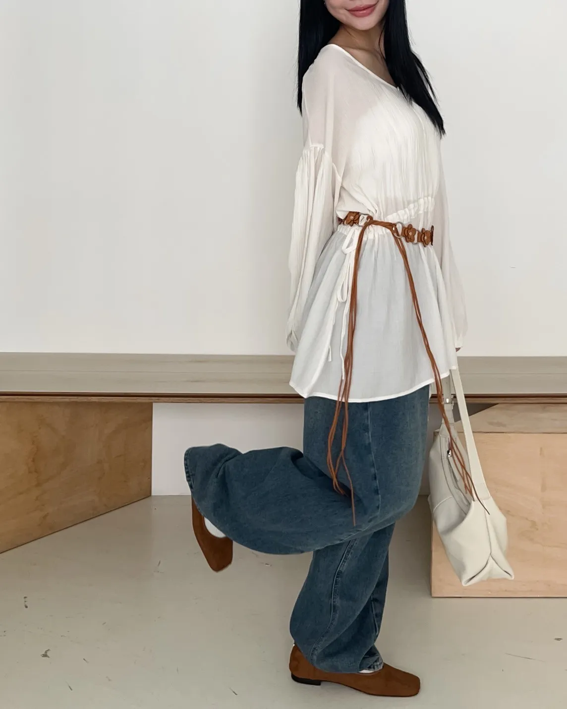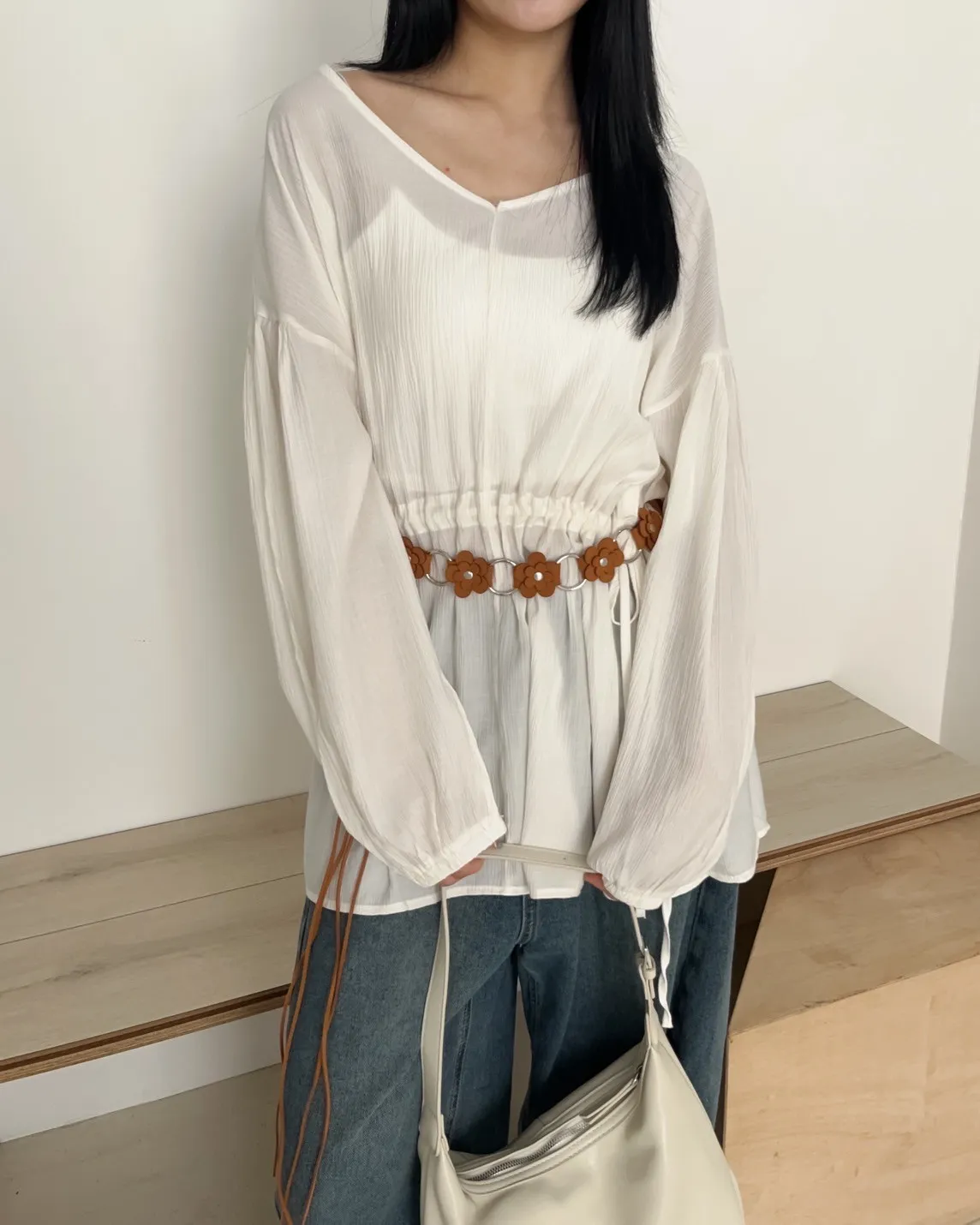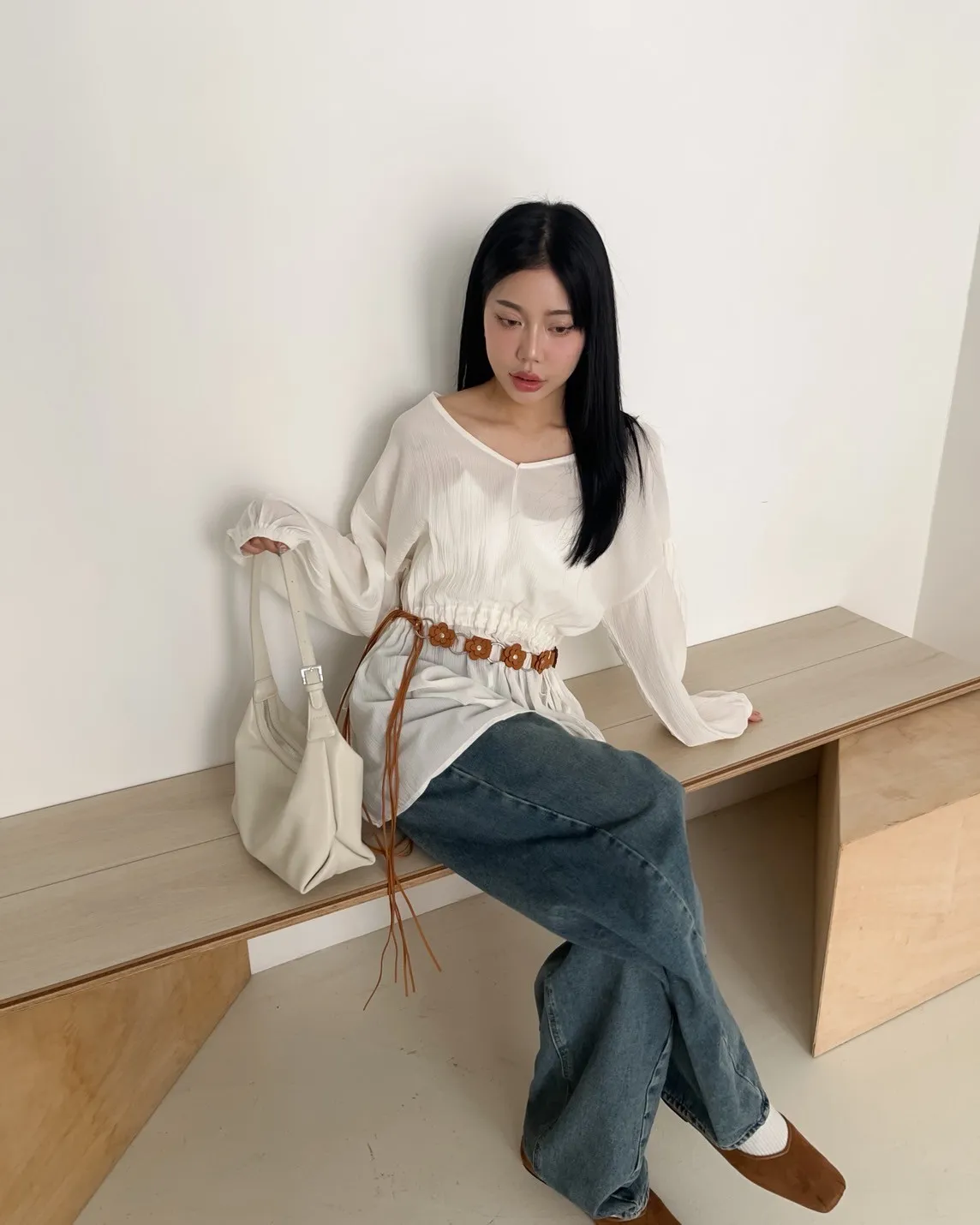 V領 微微透膚 腰部抽繩 裙襬下擺