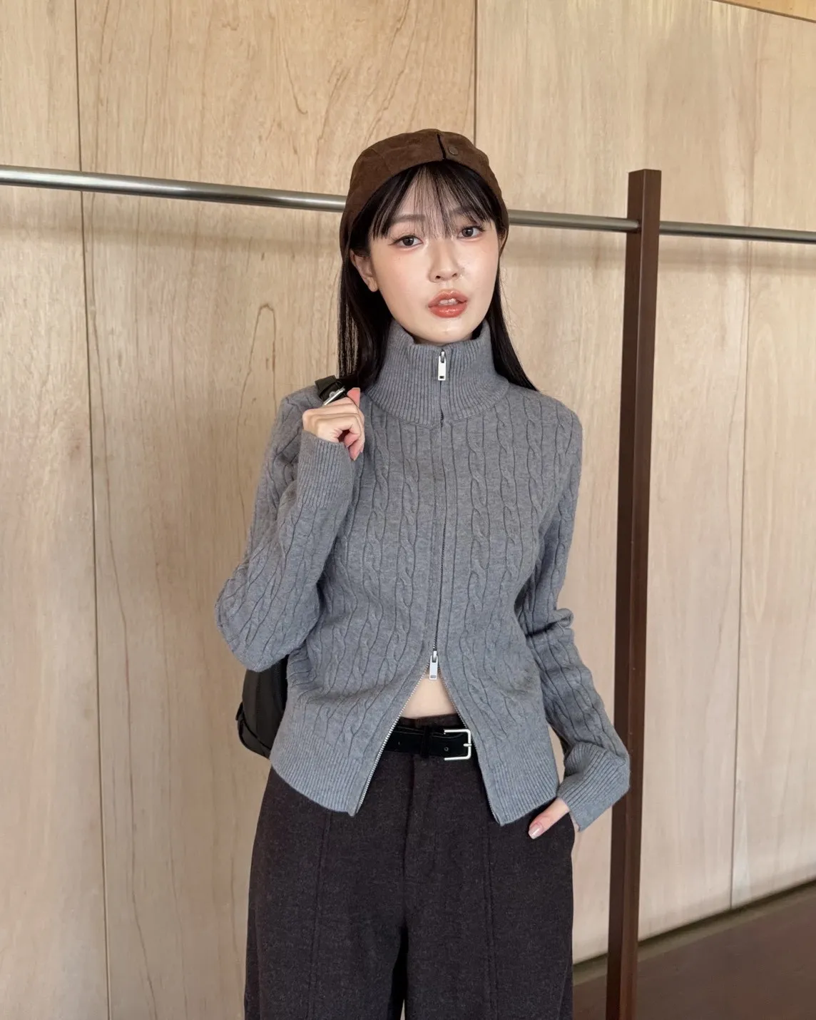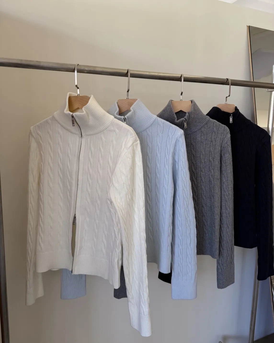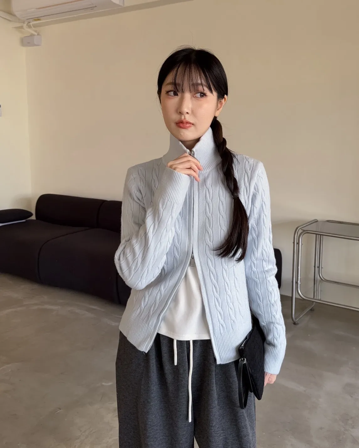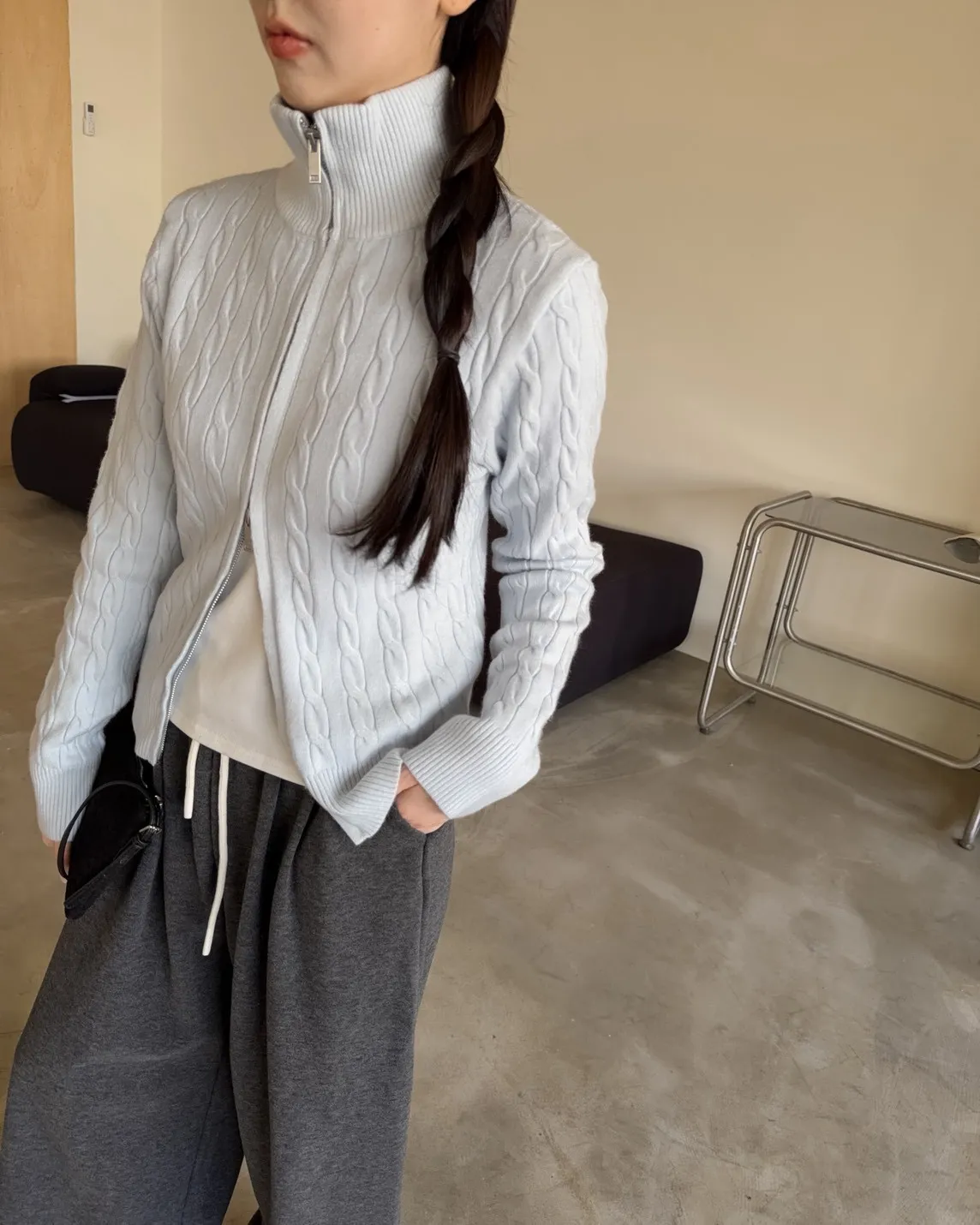 X0024高冷感麻花立領雙拉鍊毛衣(米白/淺藍/深藍/灰)