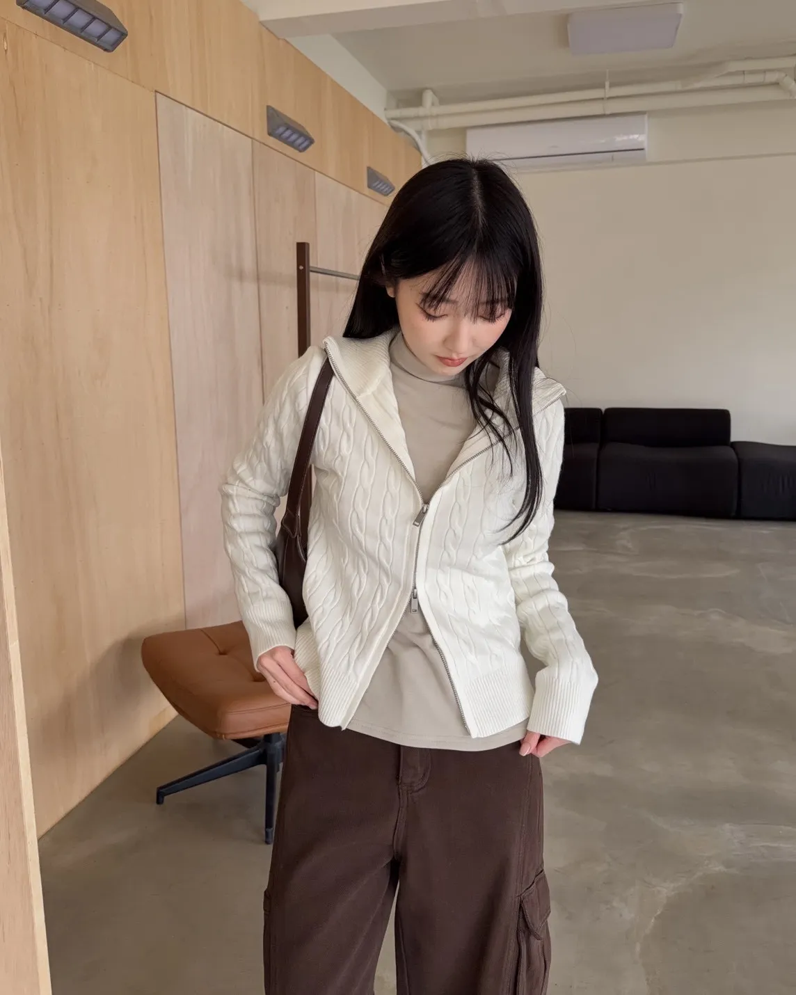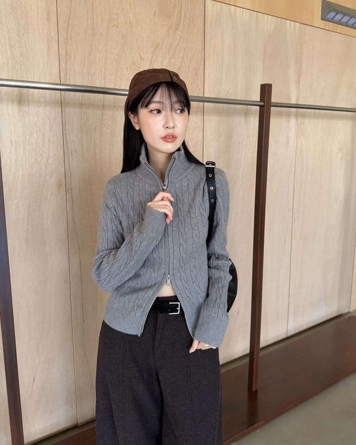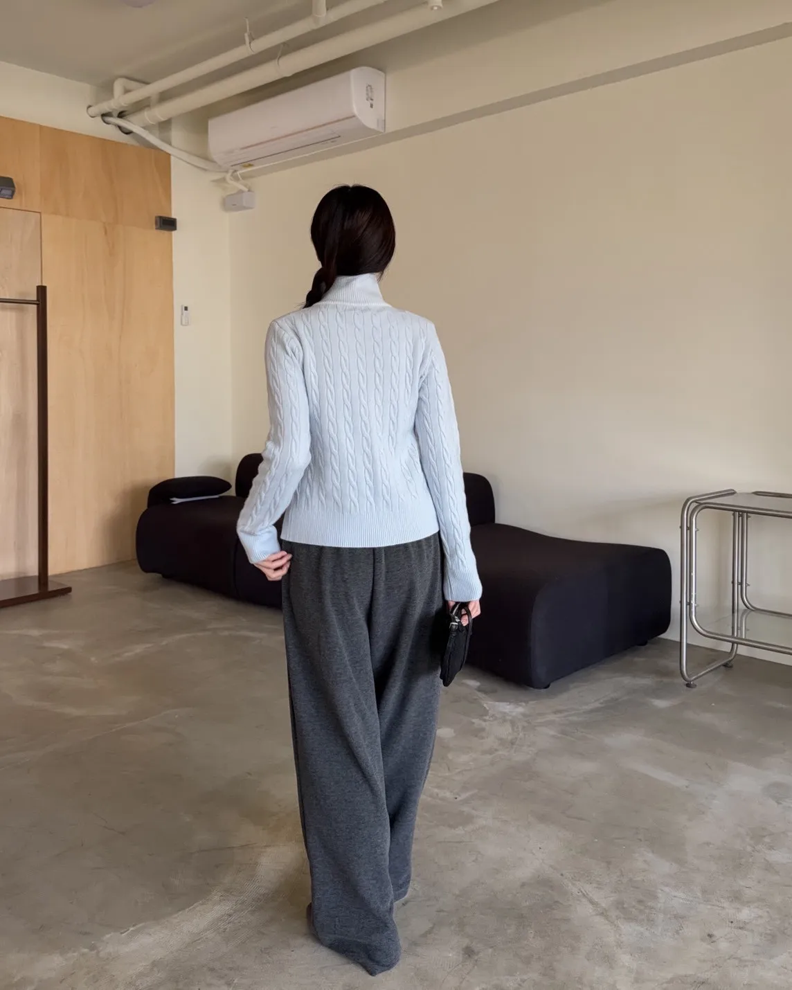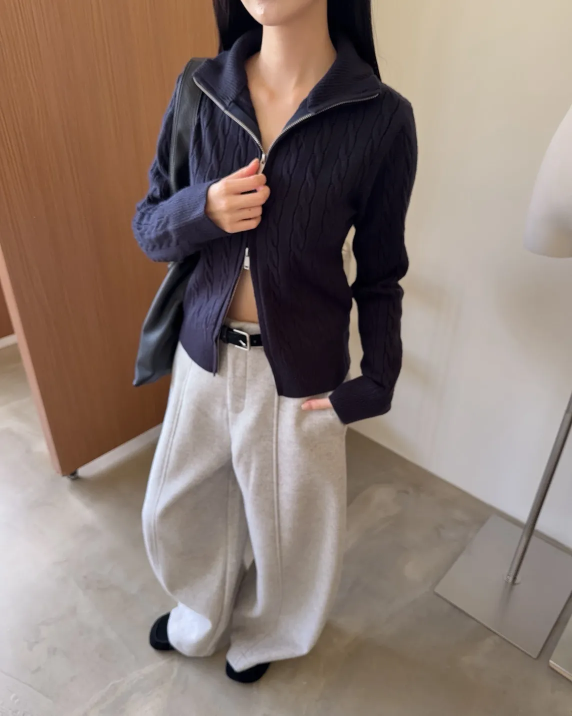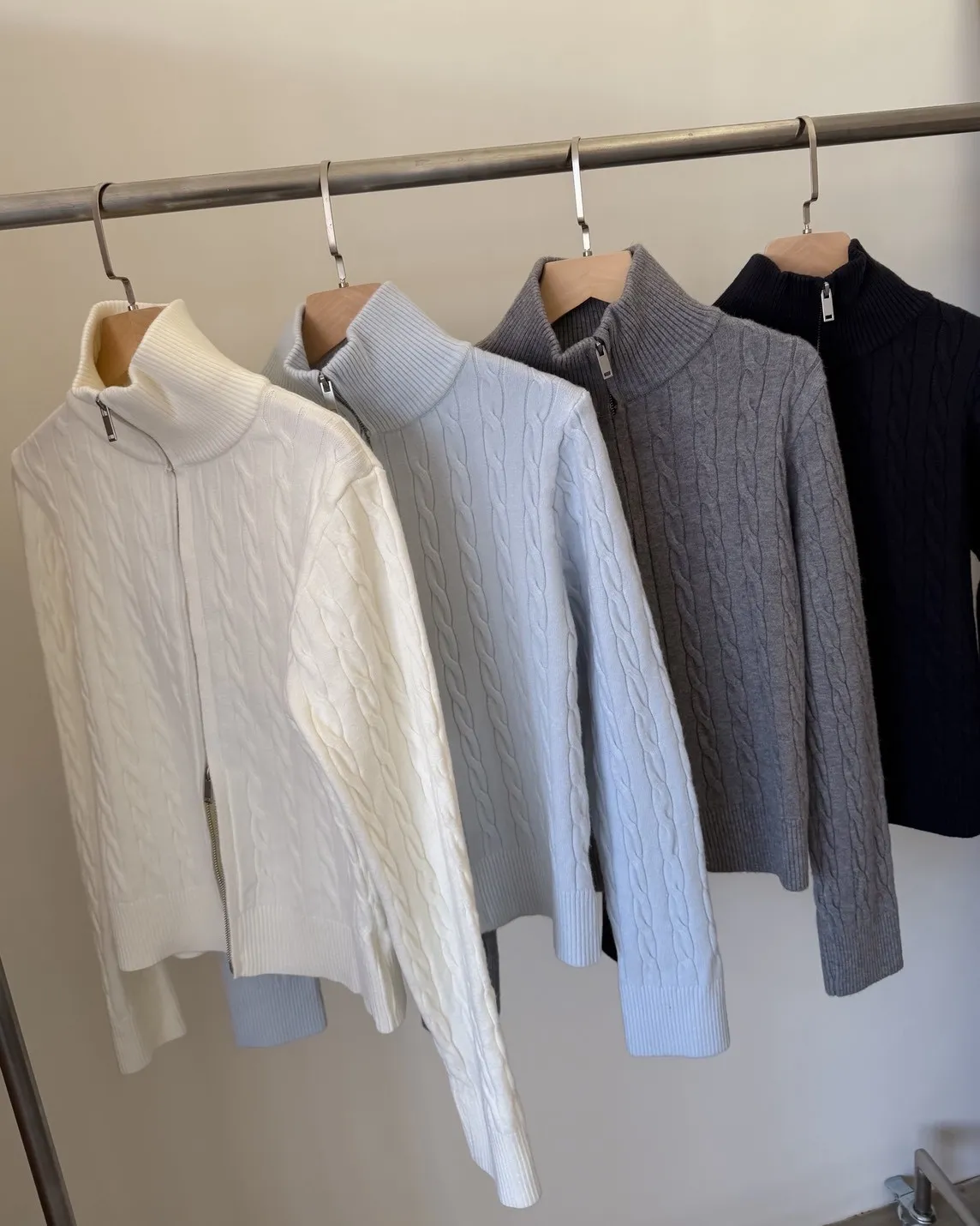 X0024高冷感麻花立領雙拉鍊毛衣(米白/淺藍/深藍/灰)