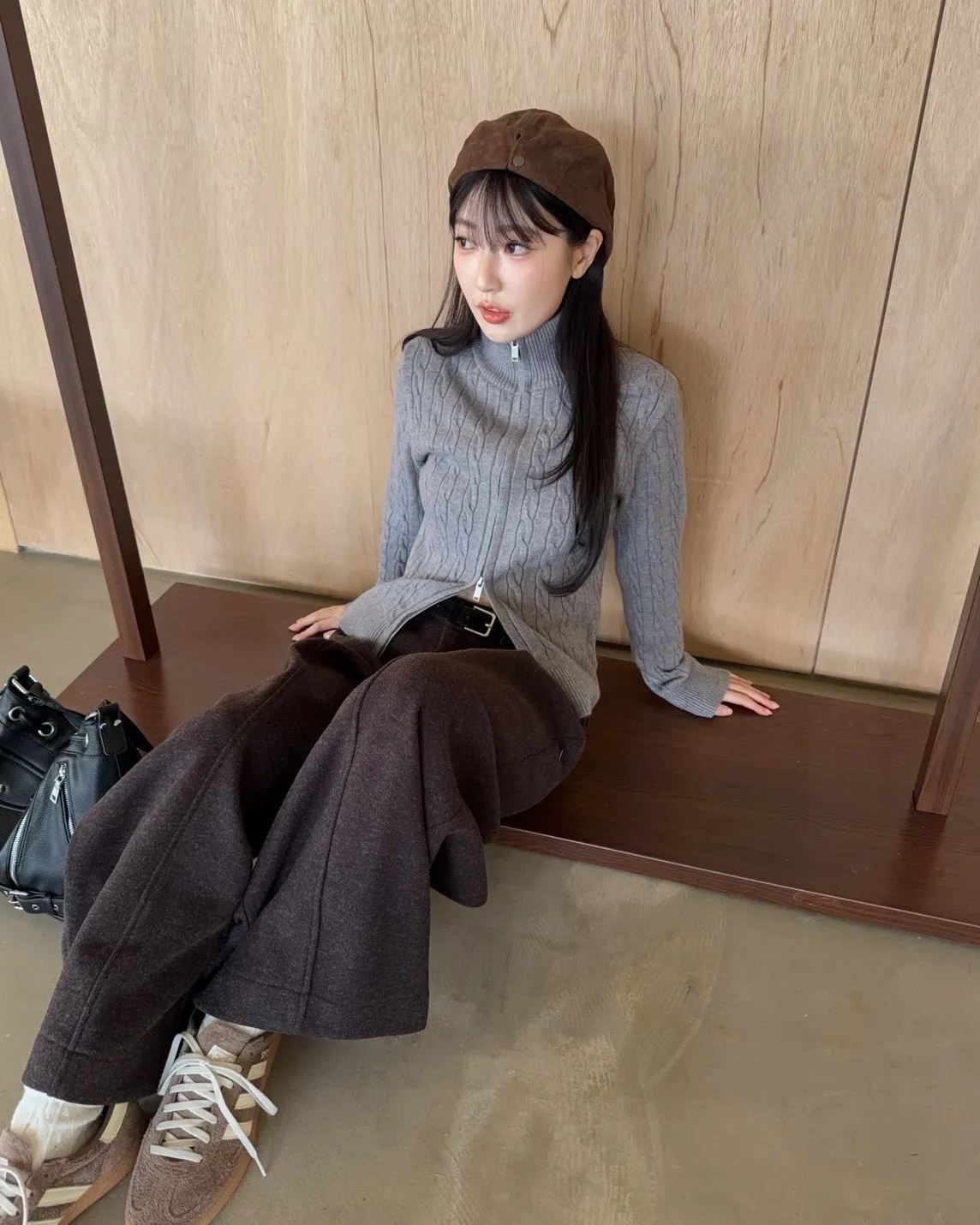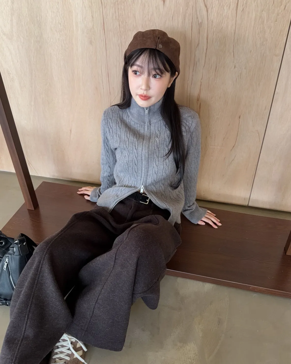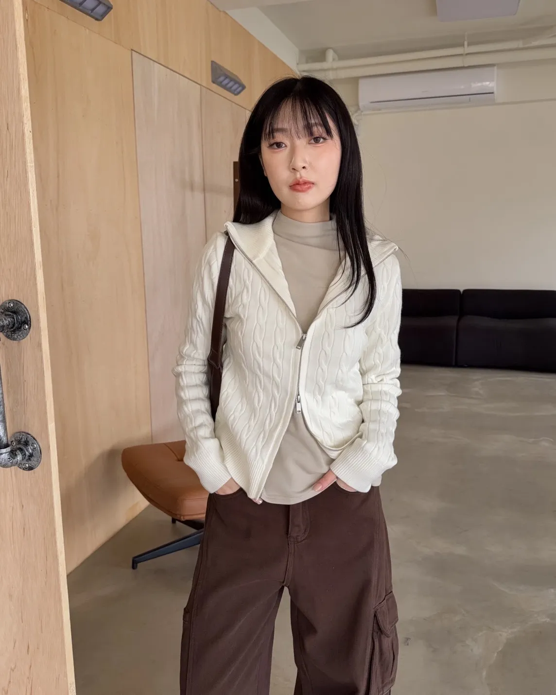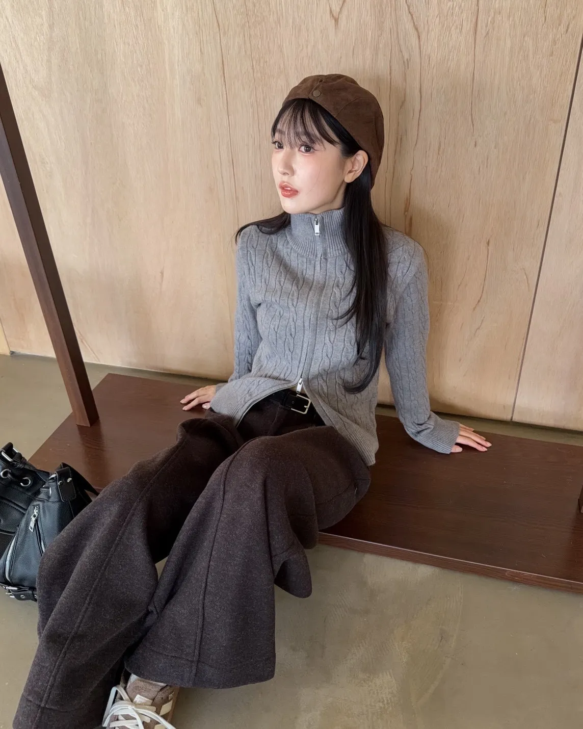 X0024高冷感麻花立領雙拉鍊毛衣(米白/淺藍/深藍/灰)