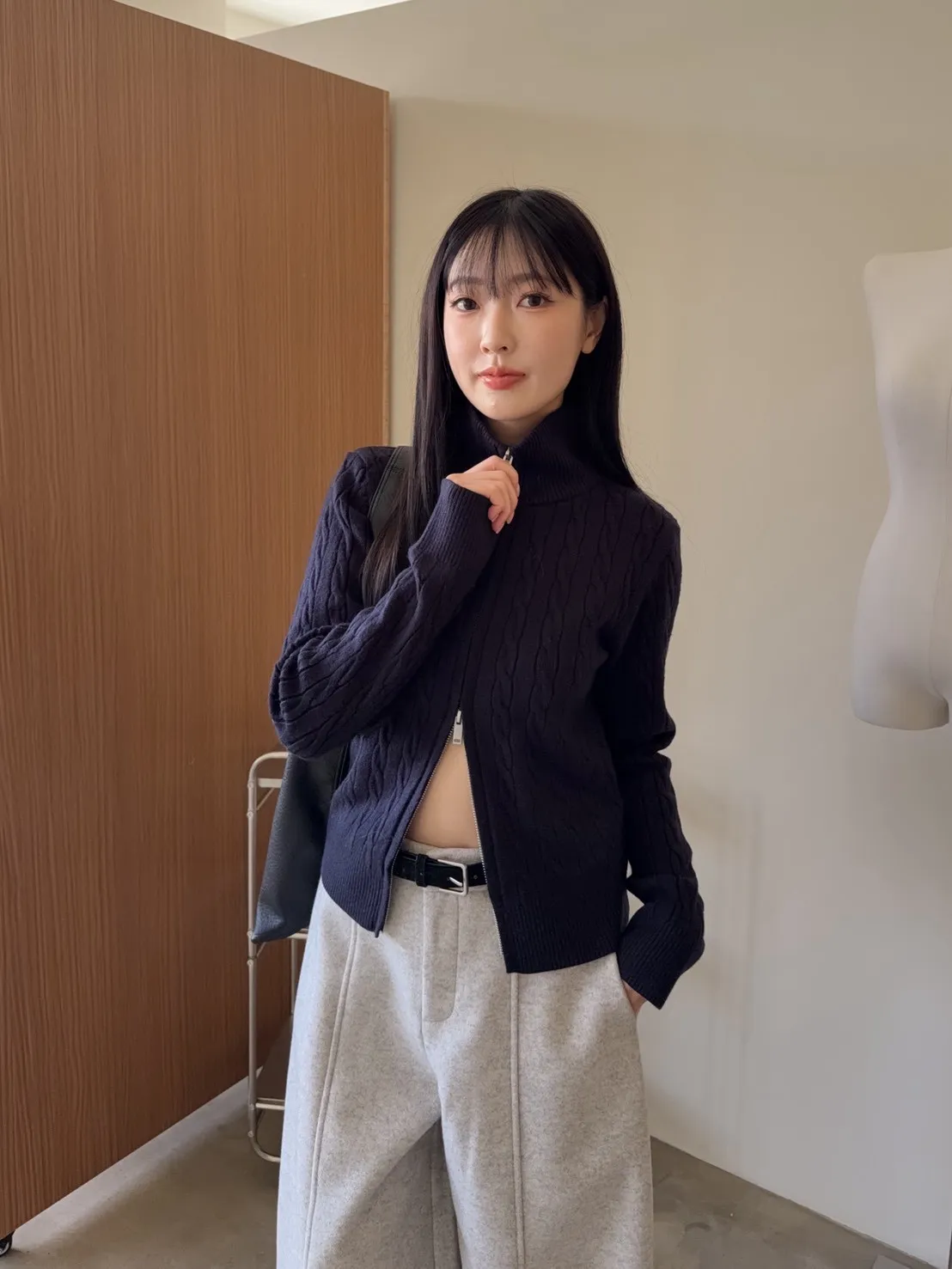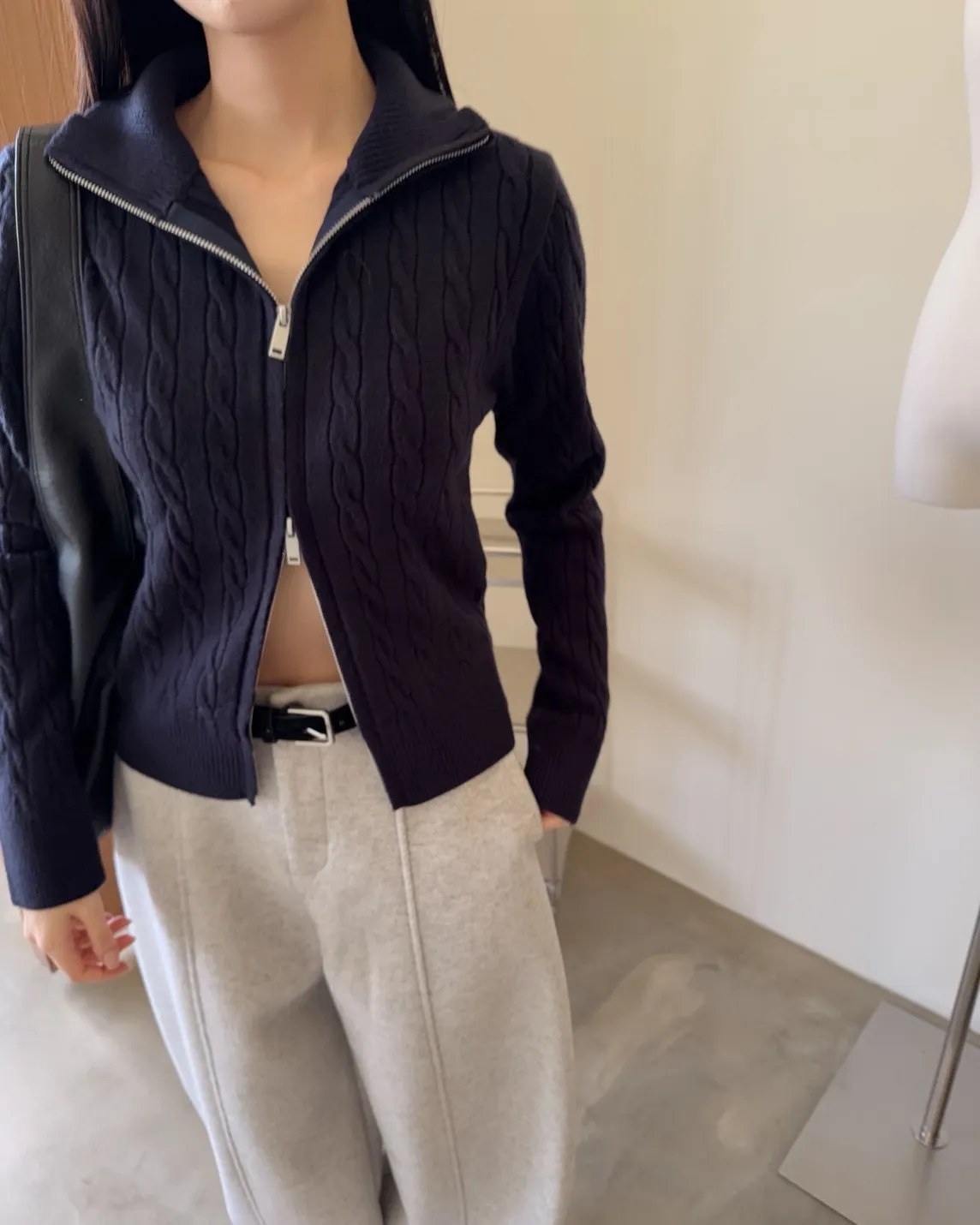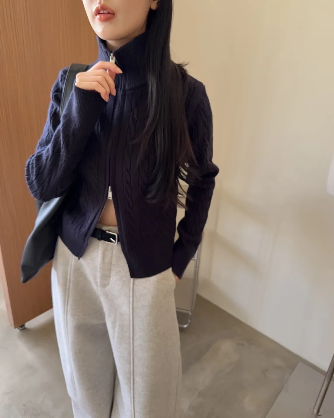雙拉鍊 高領 偏合身 立體麻花 針織