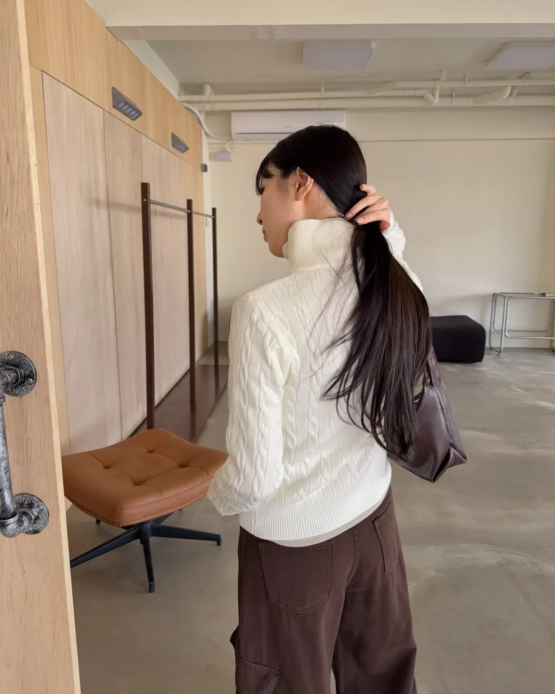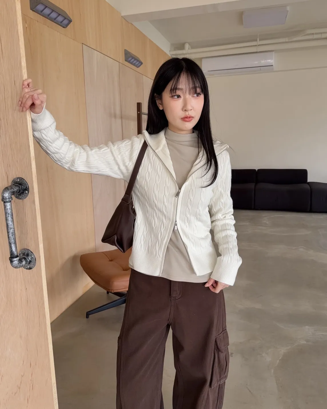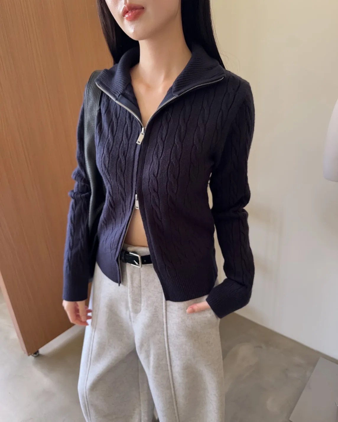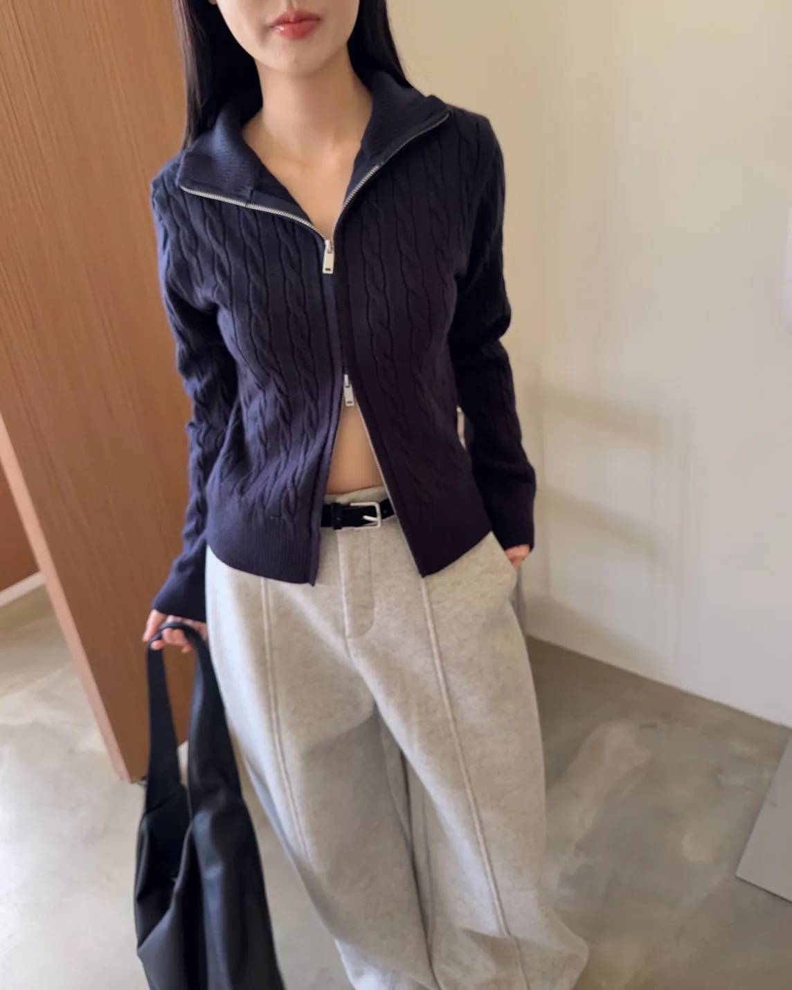 雙拉鍊 高領 偏合身 立體麻花 針織