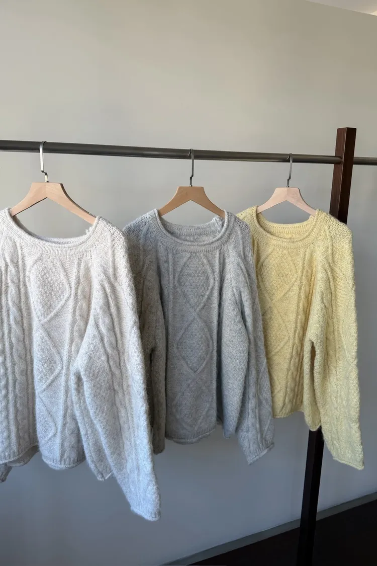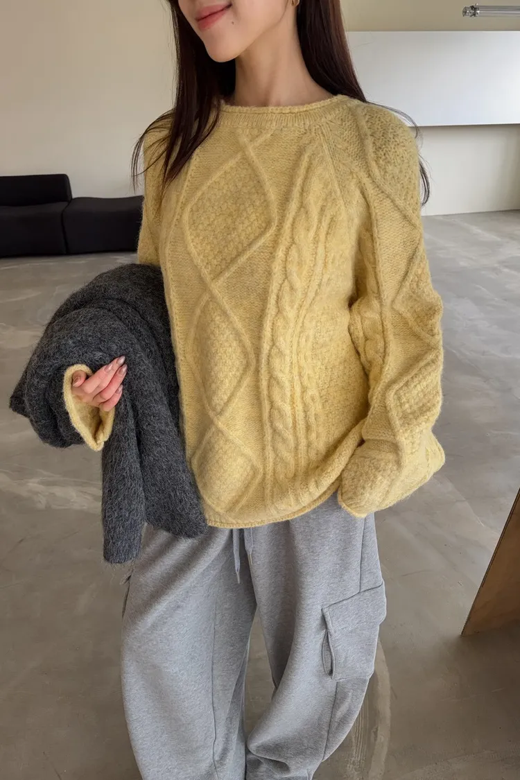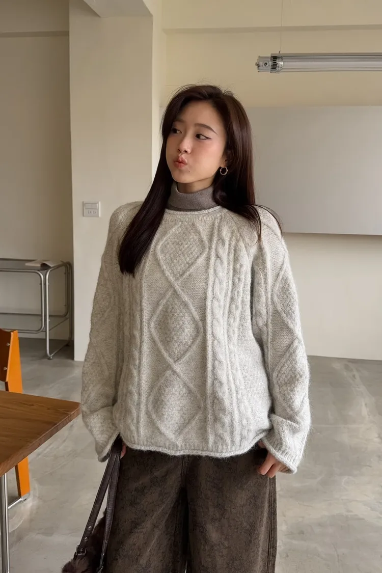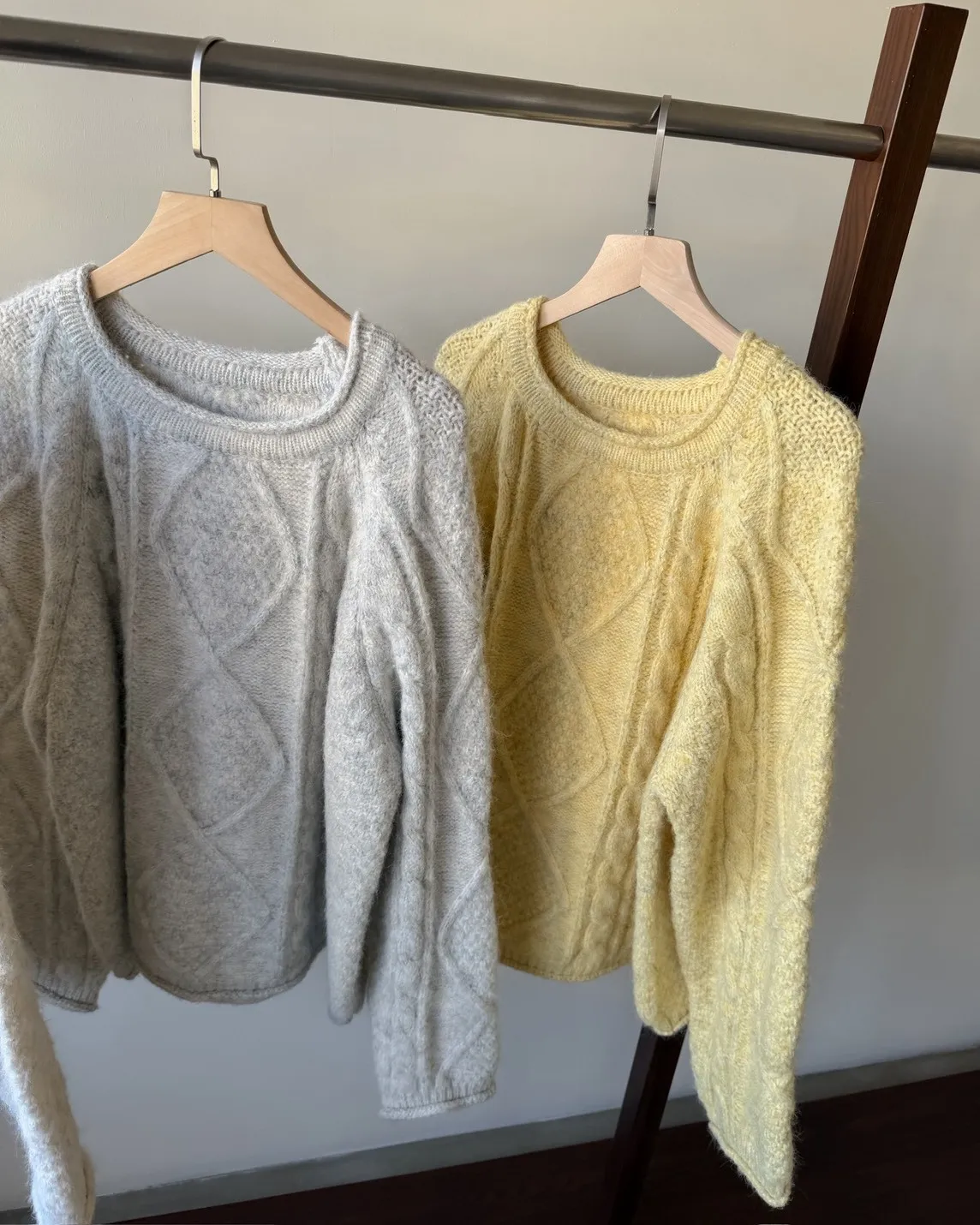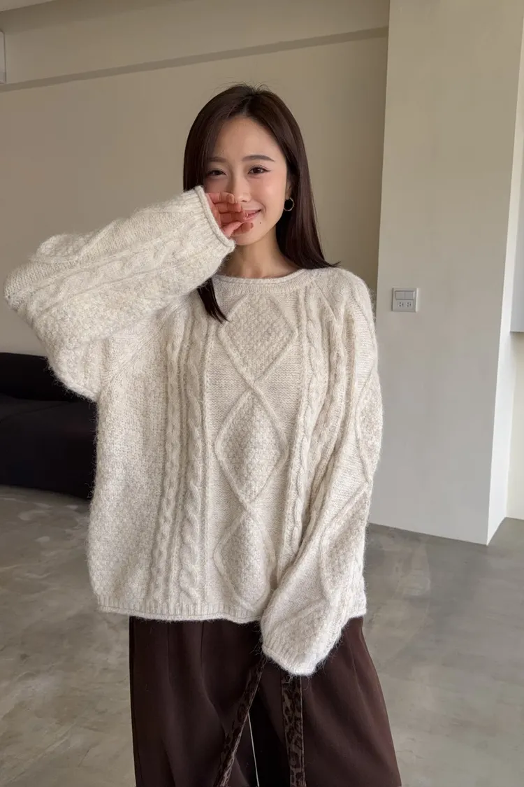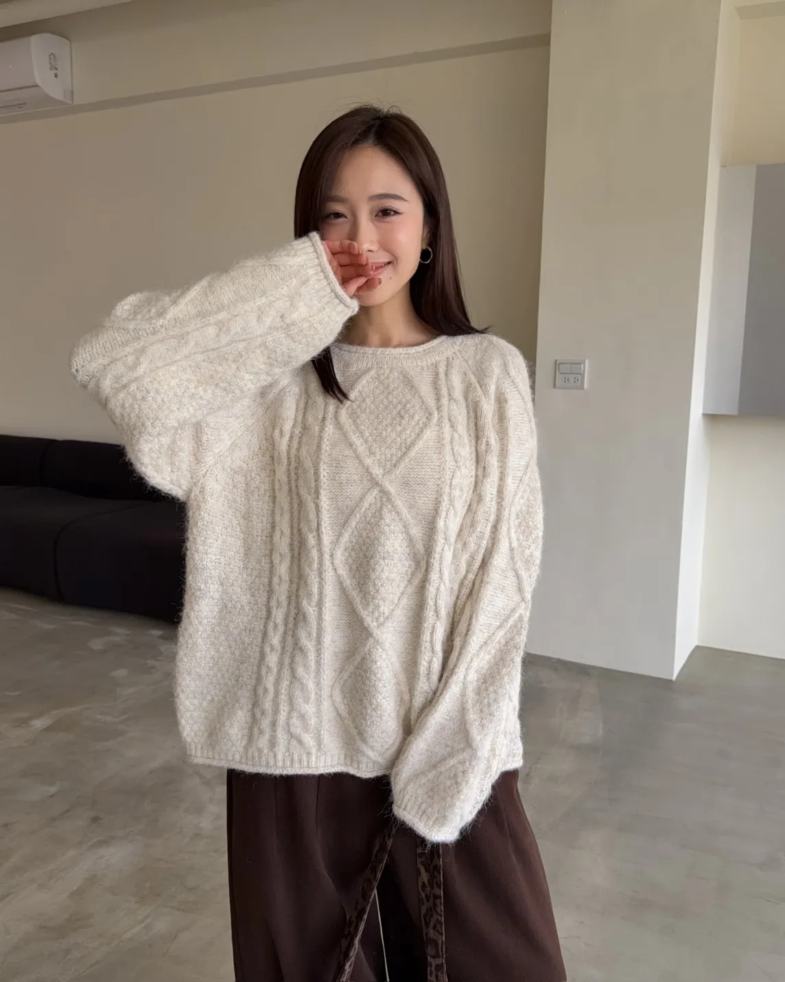 X0044大菱格麻花混毛毛衣(燕麥/黃/灰)