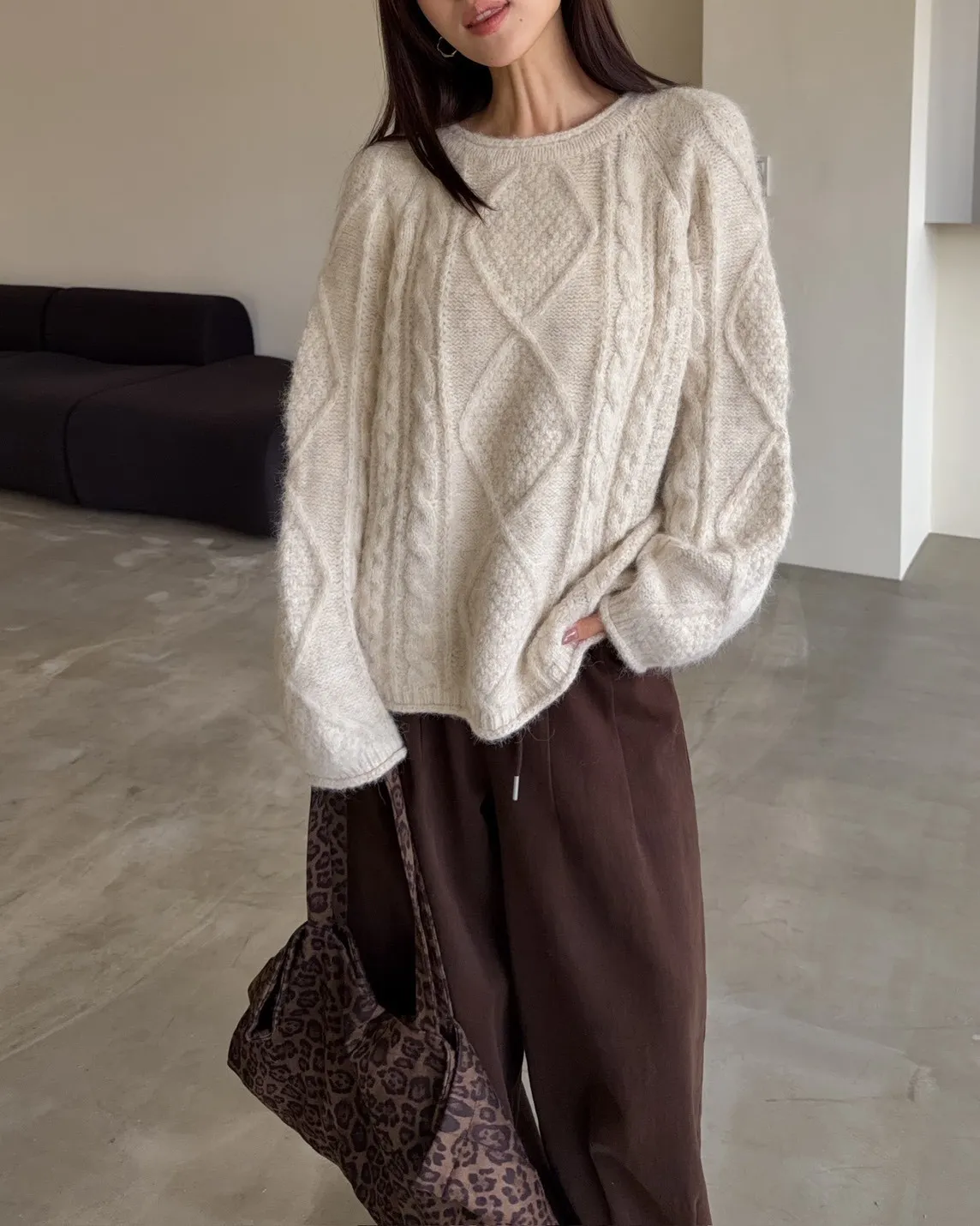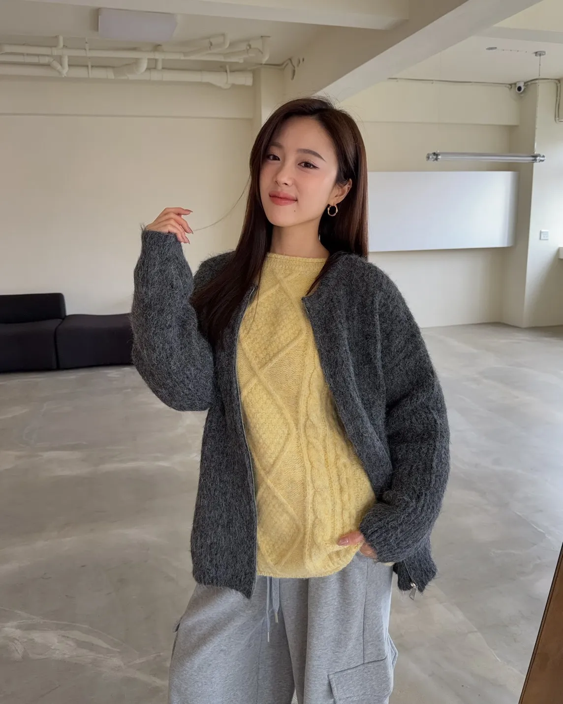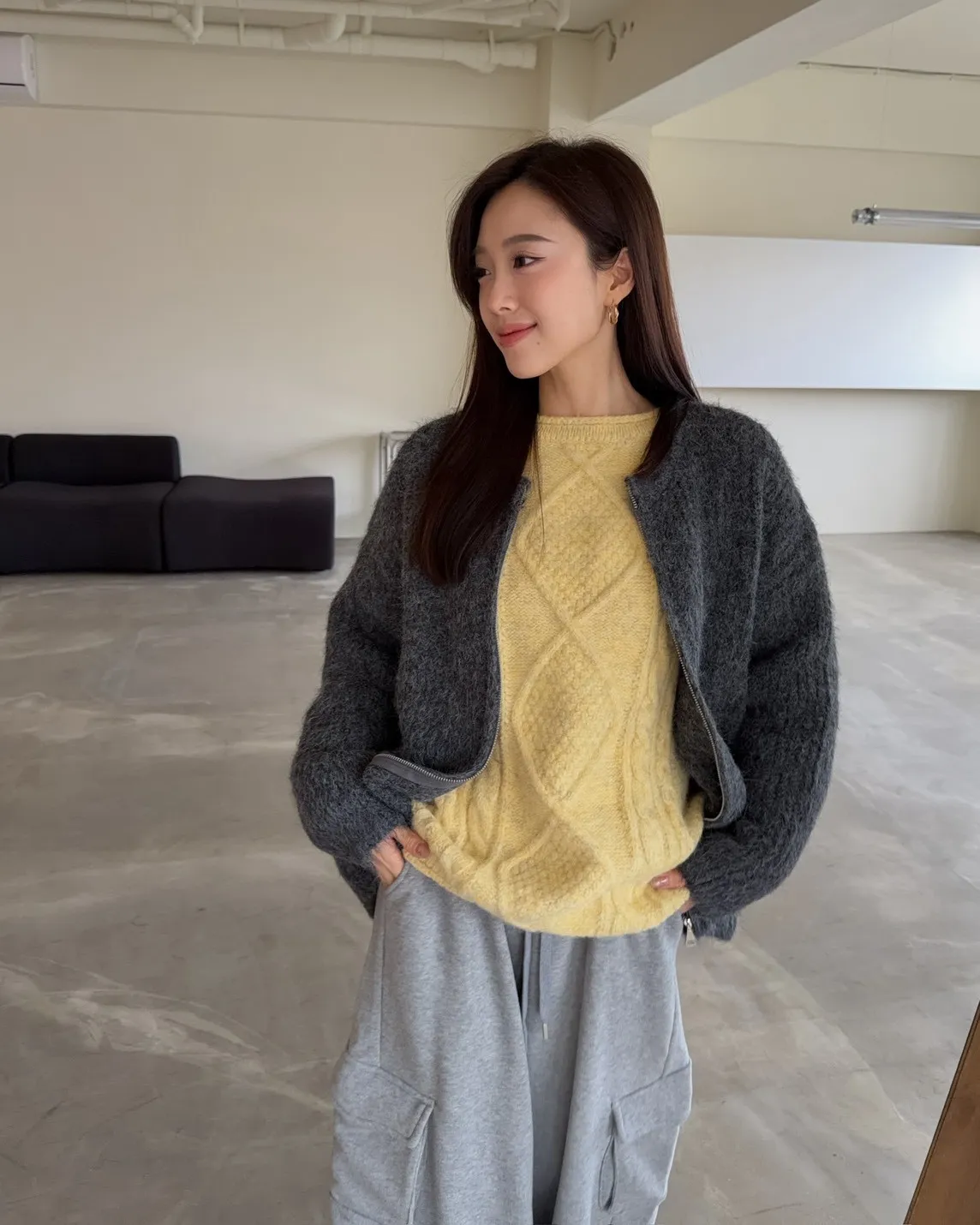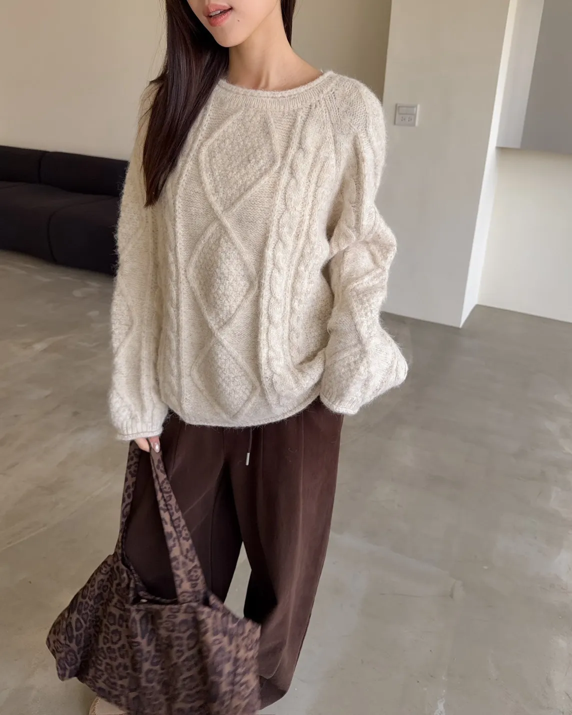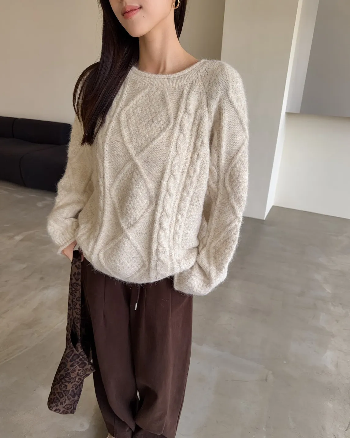 X0044大菱格麻花混毛毛衣(燕麥/黃/灰)