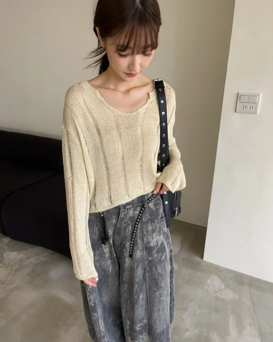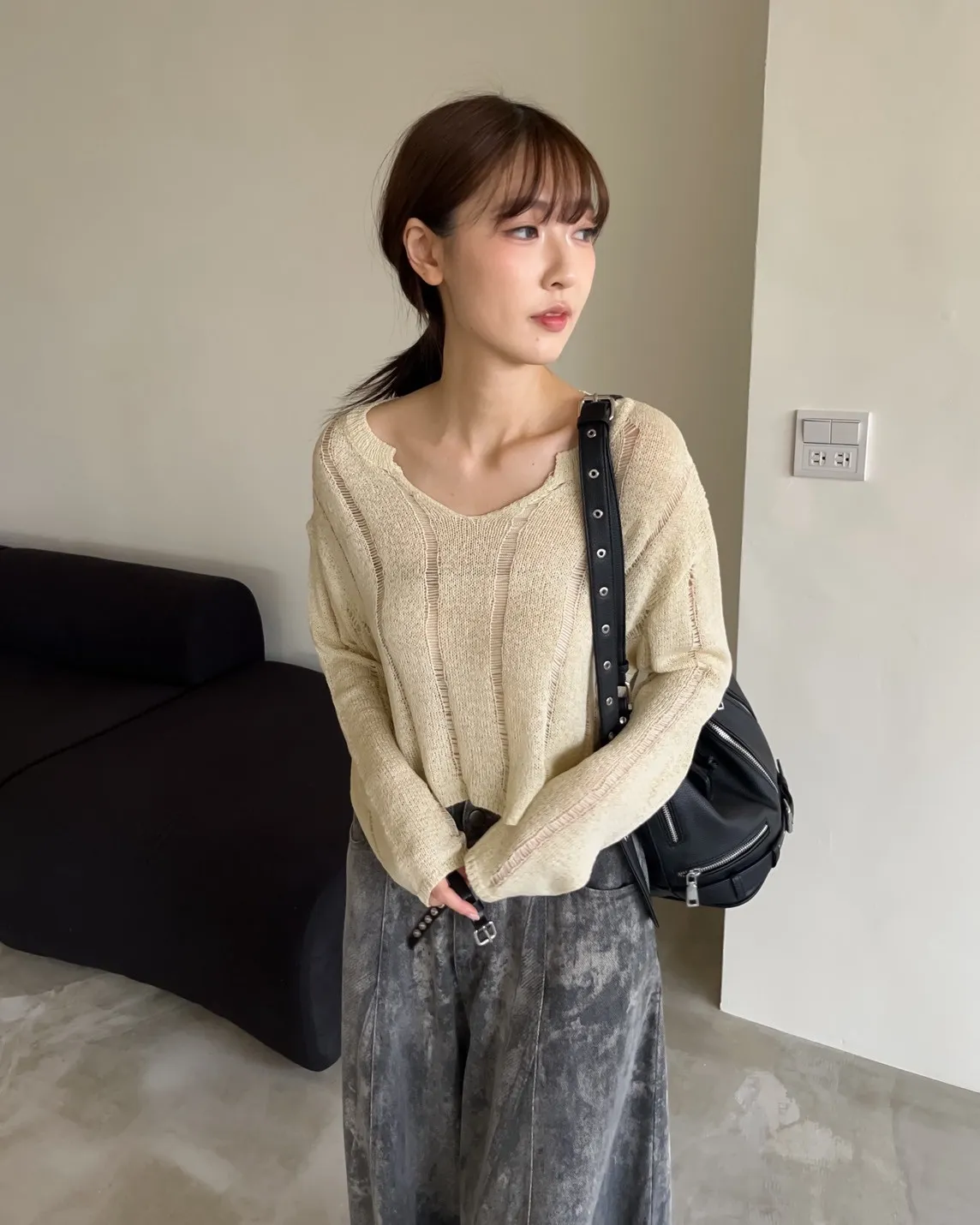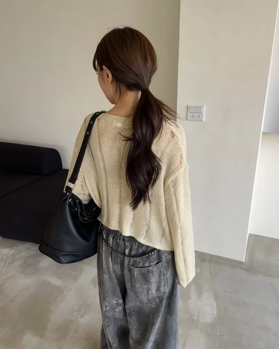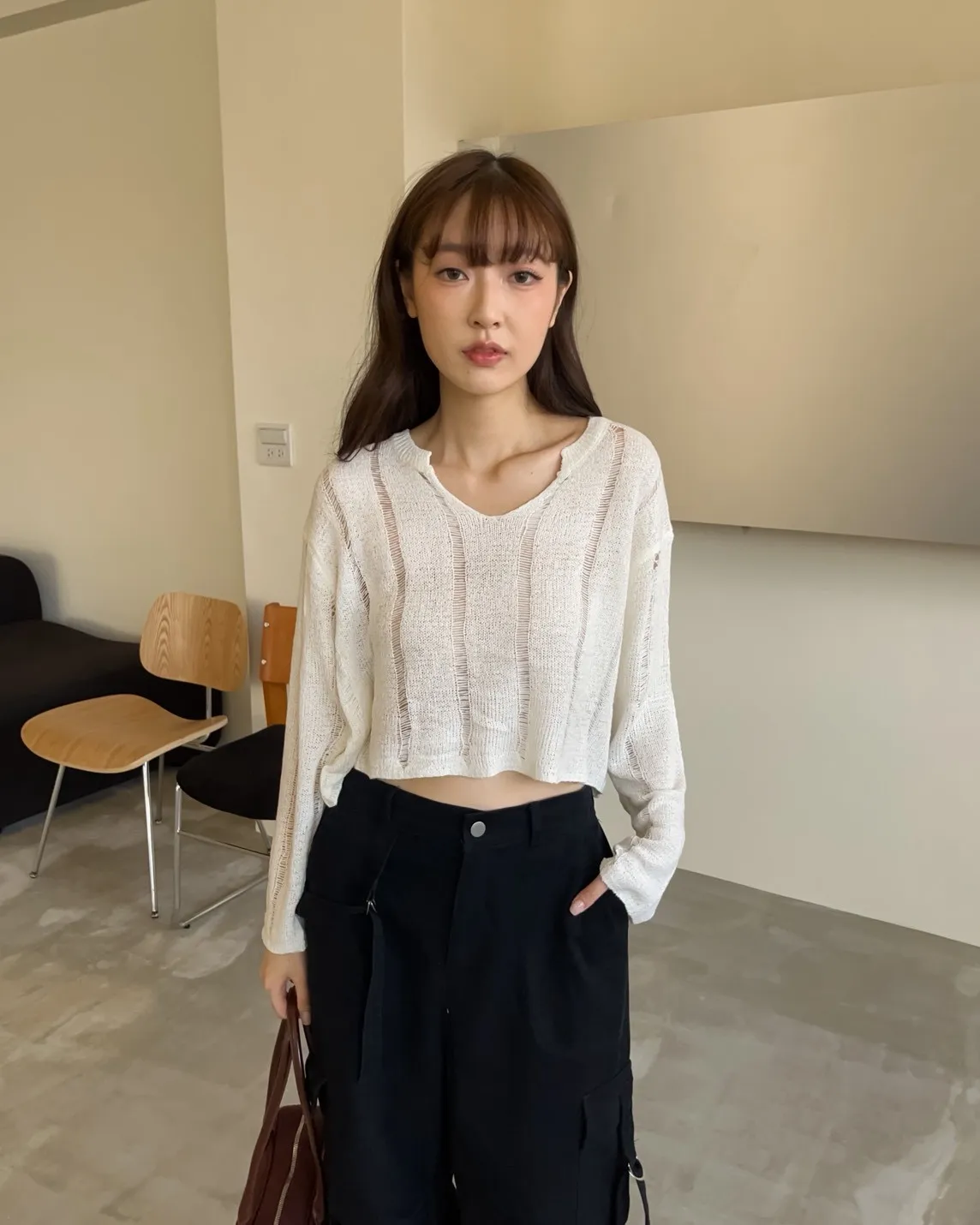 寬版 短版 針織 抓破小鏤空造型 小V領