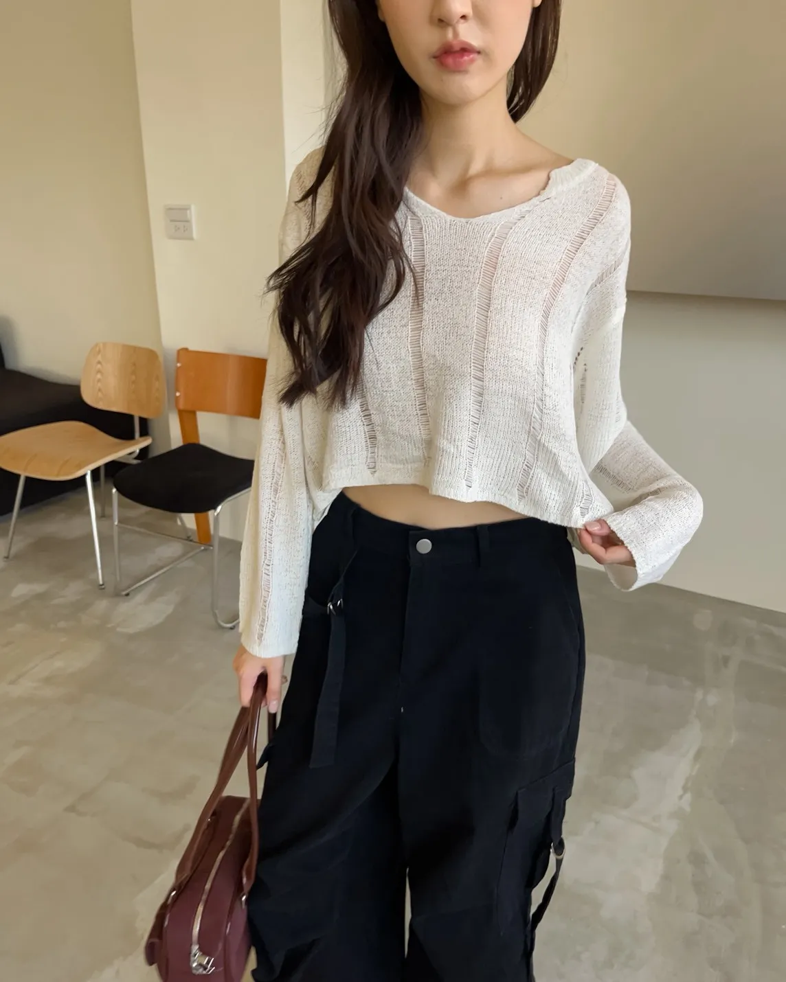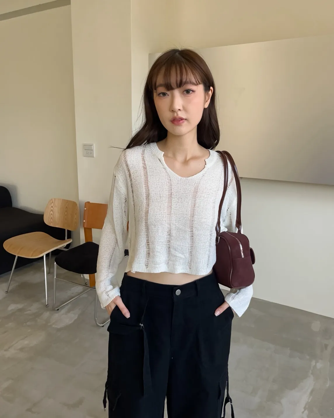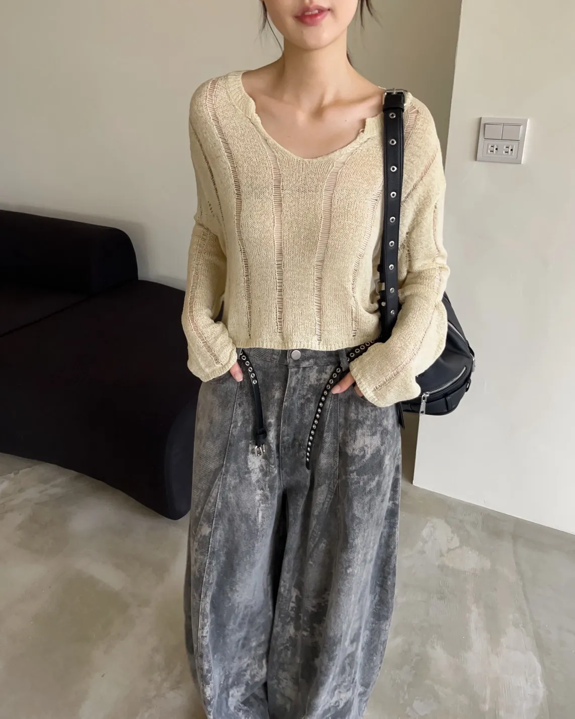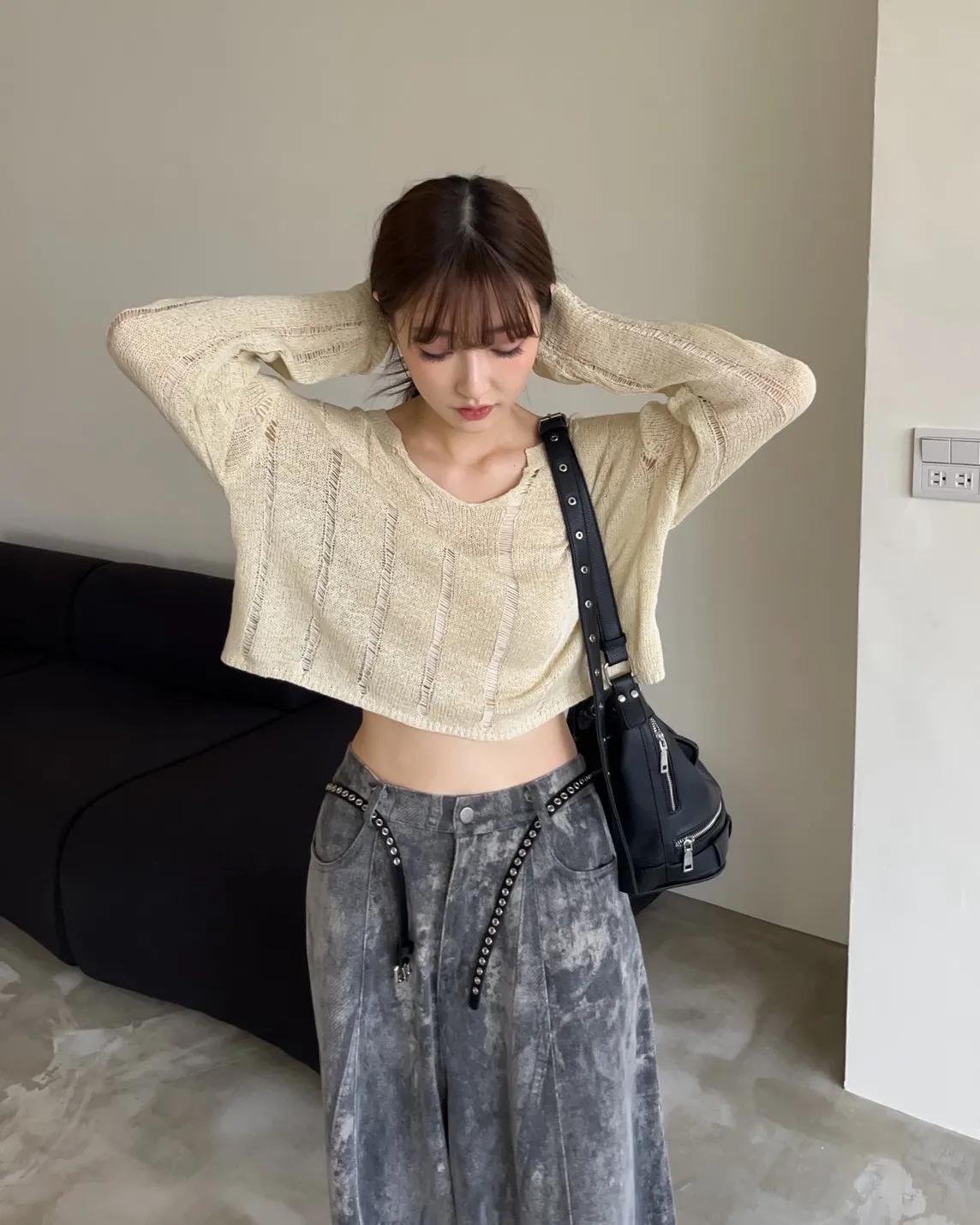 寬版 短版 針織 抓破小鏤空造型 小V領
