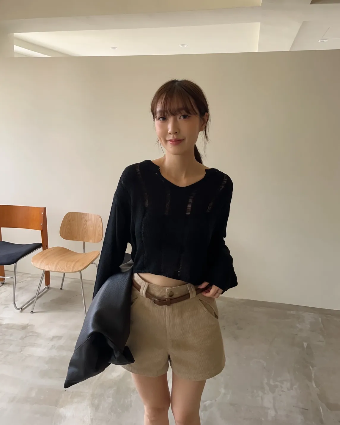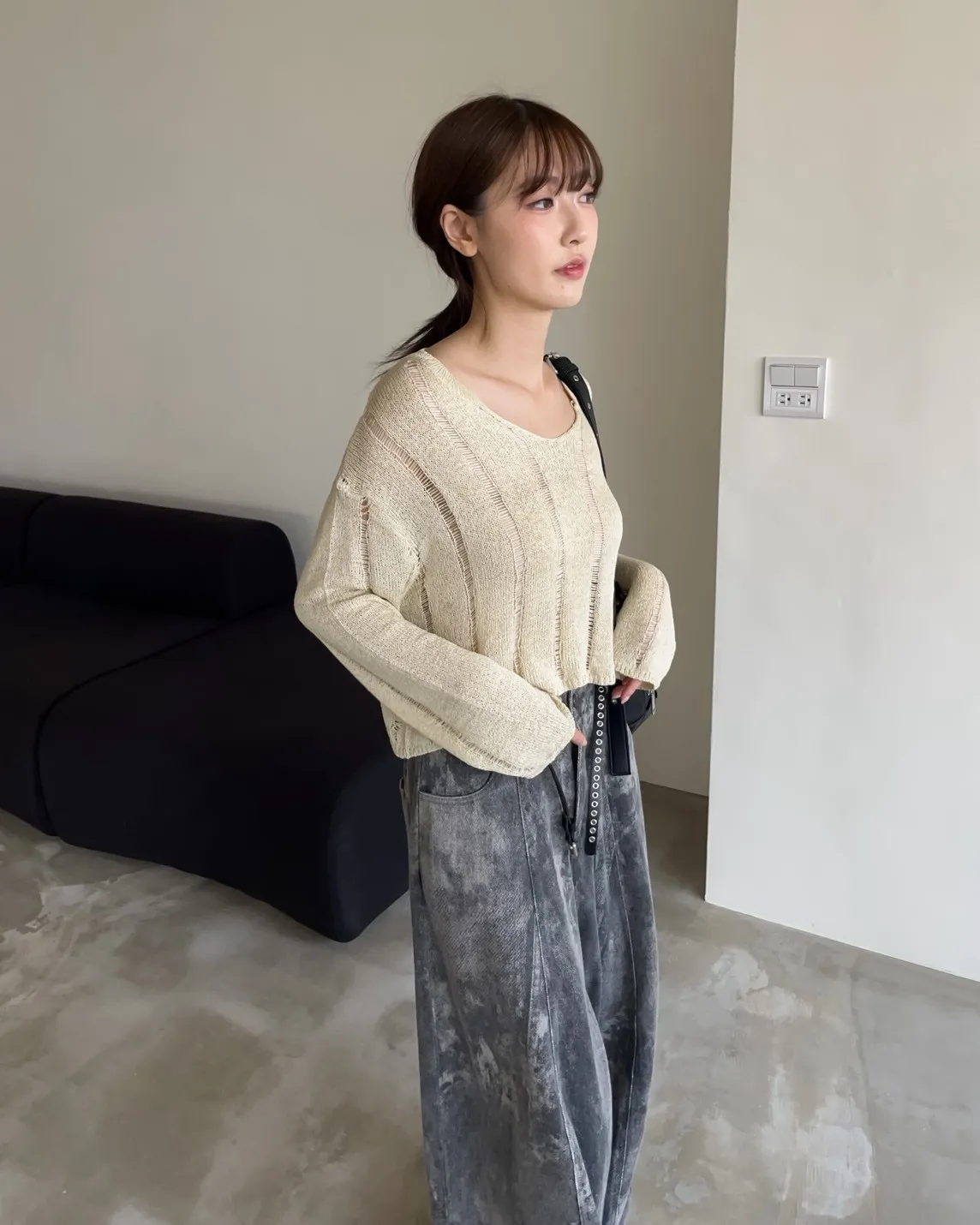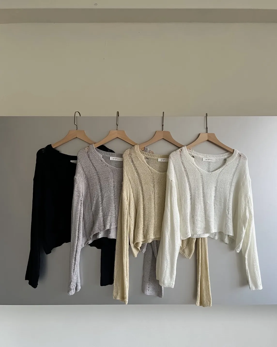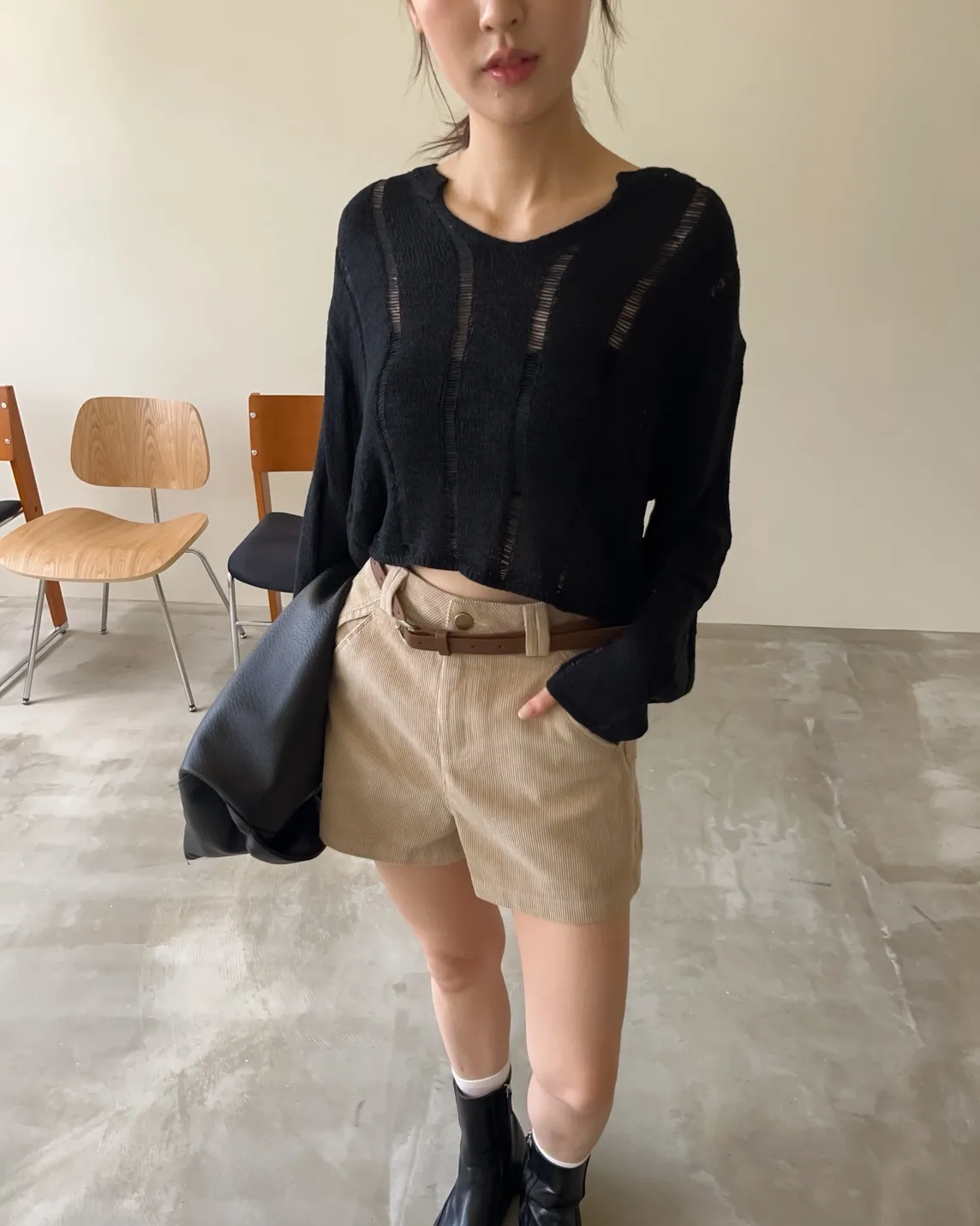 寬版 短版 針織 抓破小鏤空造型 小V領