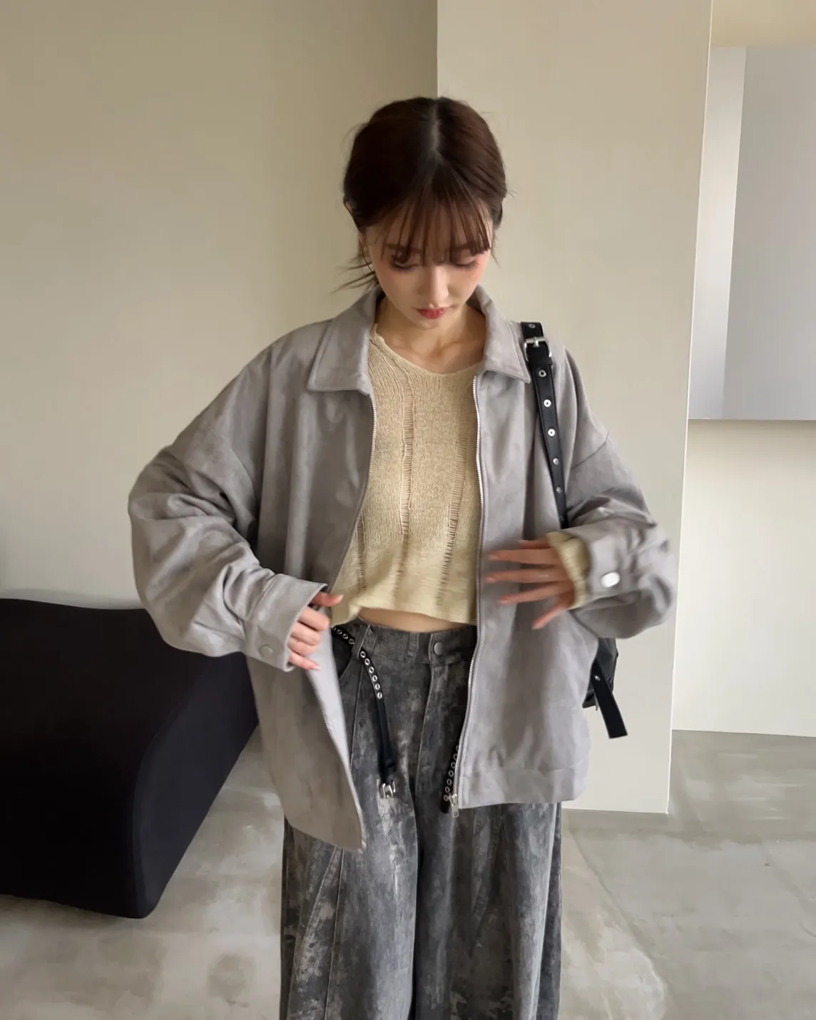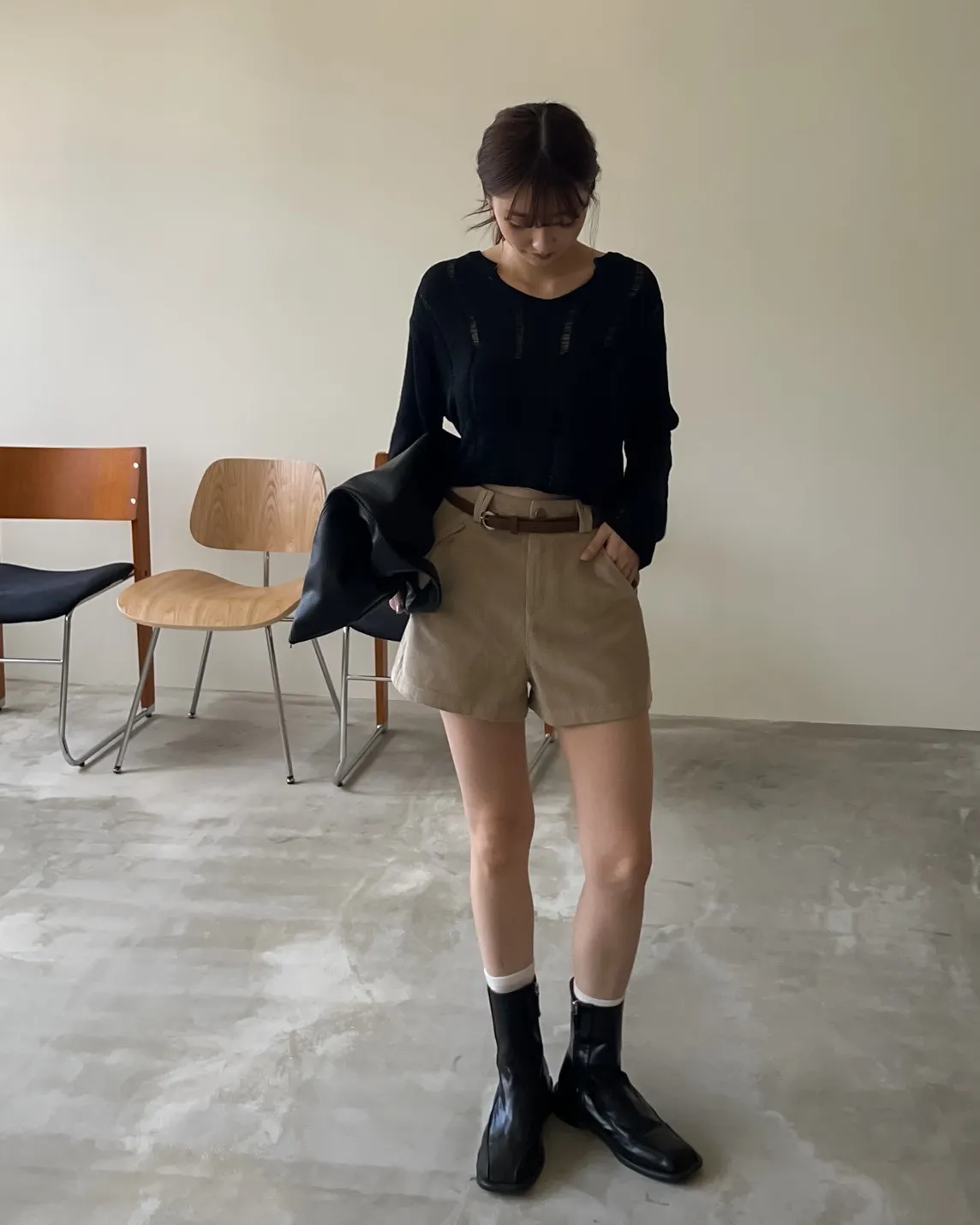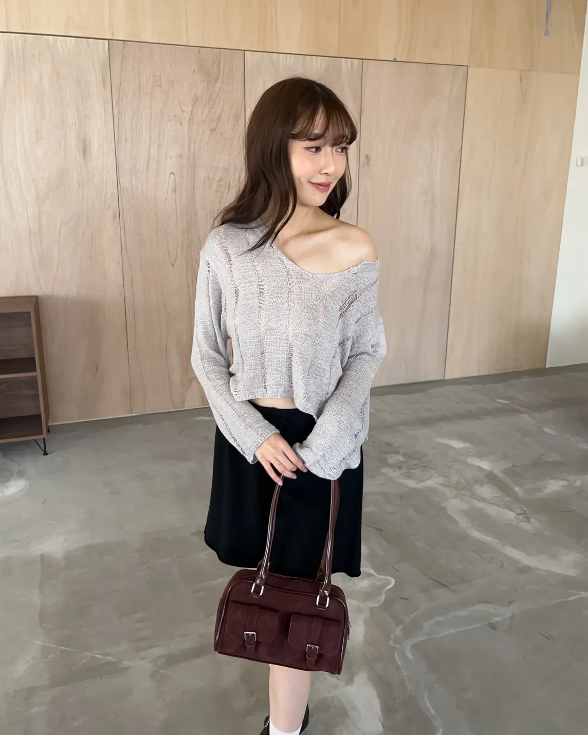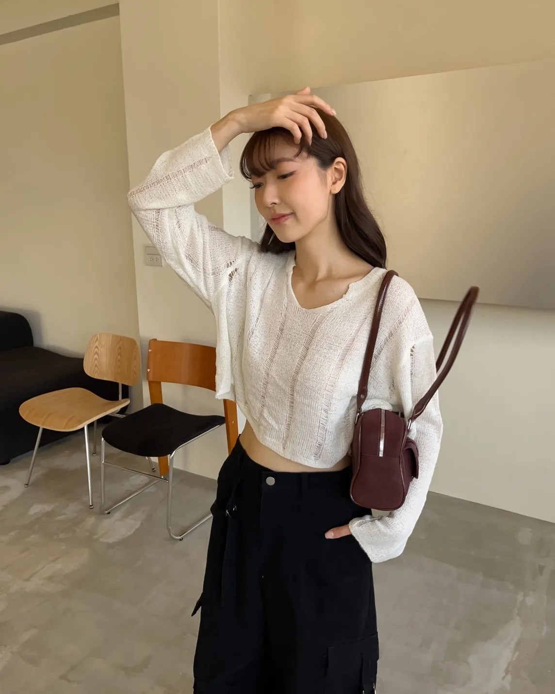 寬版 短版 針織 抓破小鏤空造型 小V領