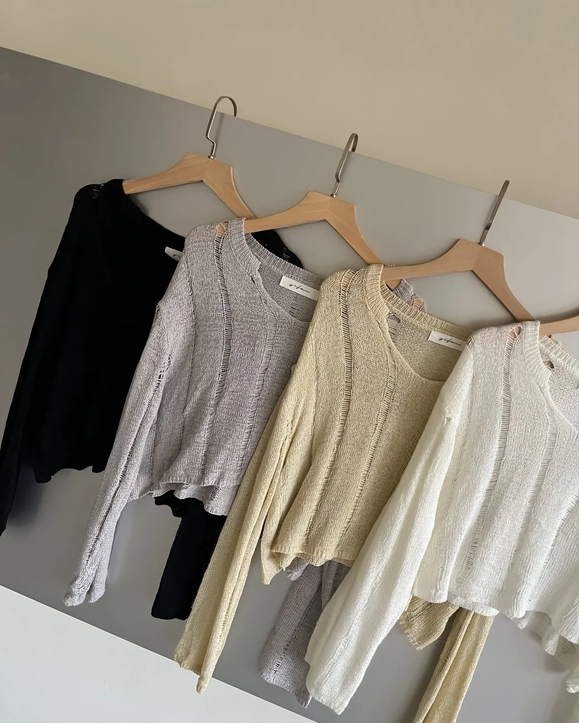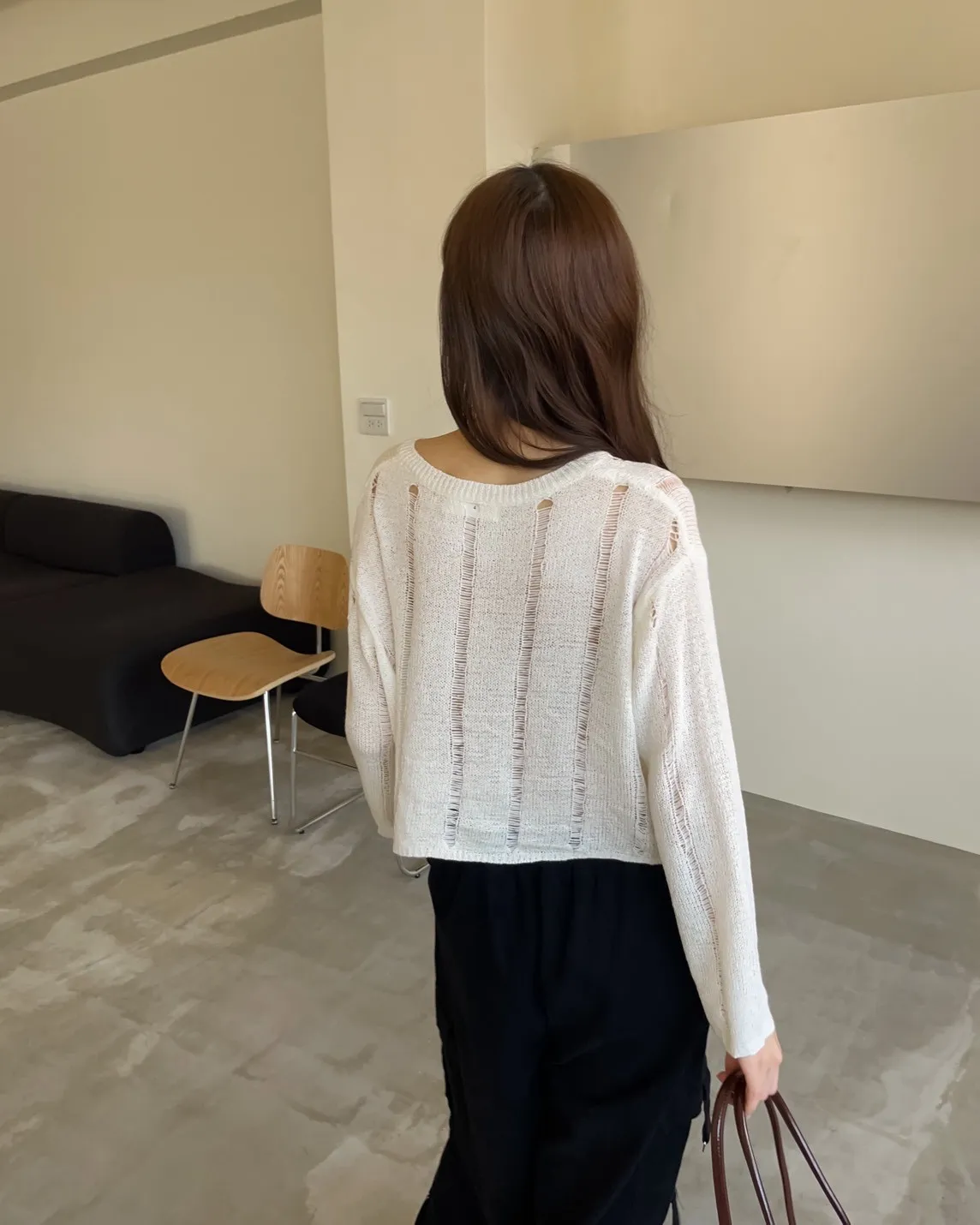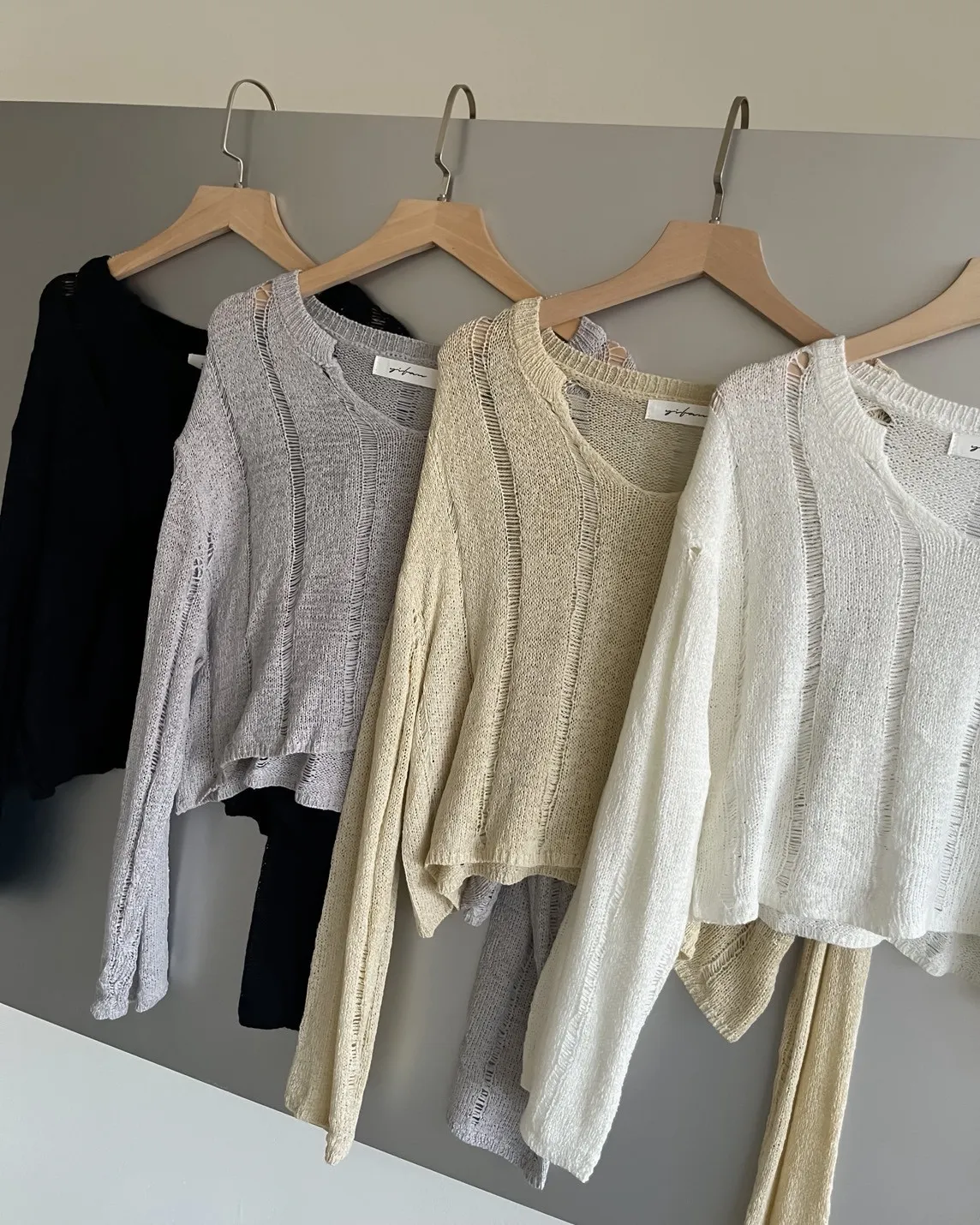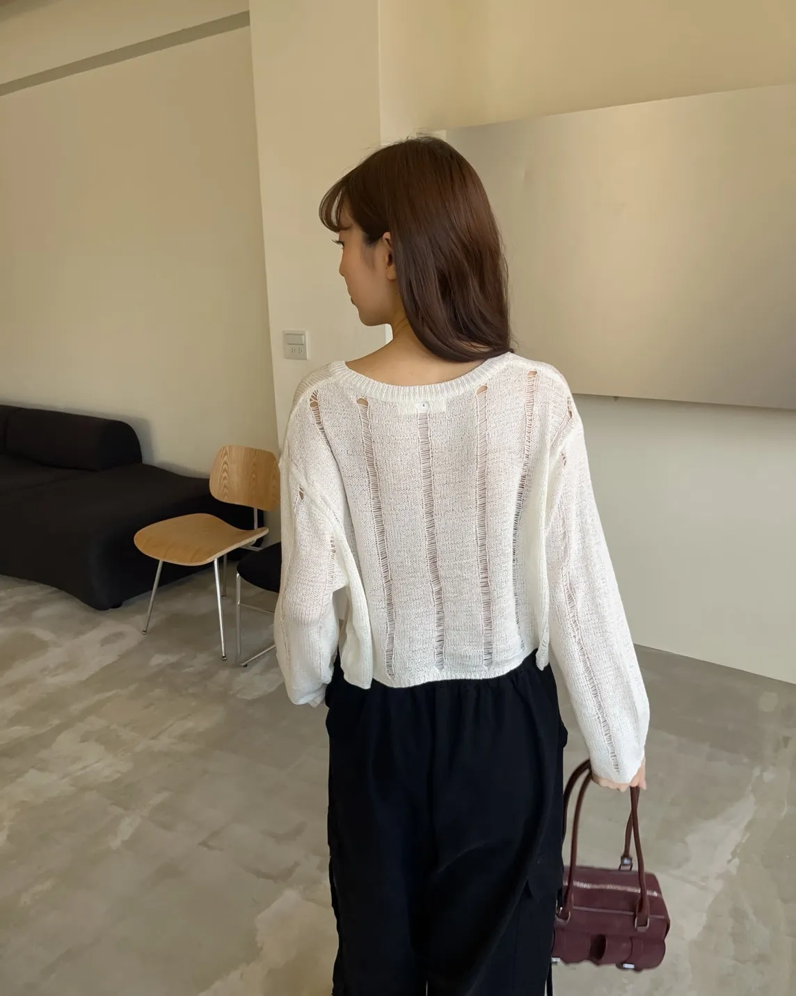 V0025小俏皮抓破寬短版針織上衣(白/黃/灰/黑)(售完不補)