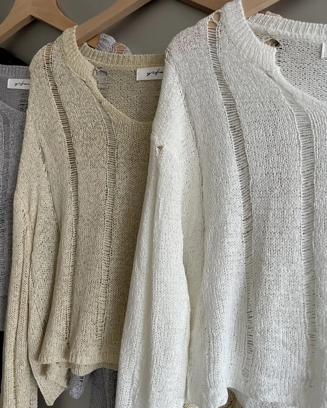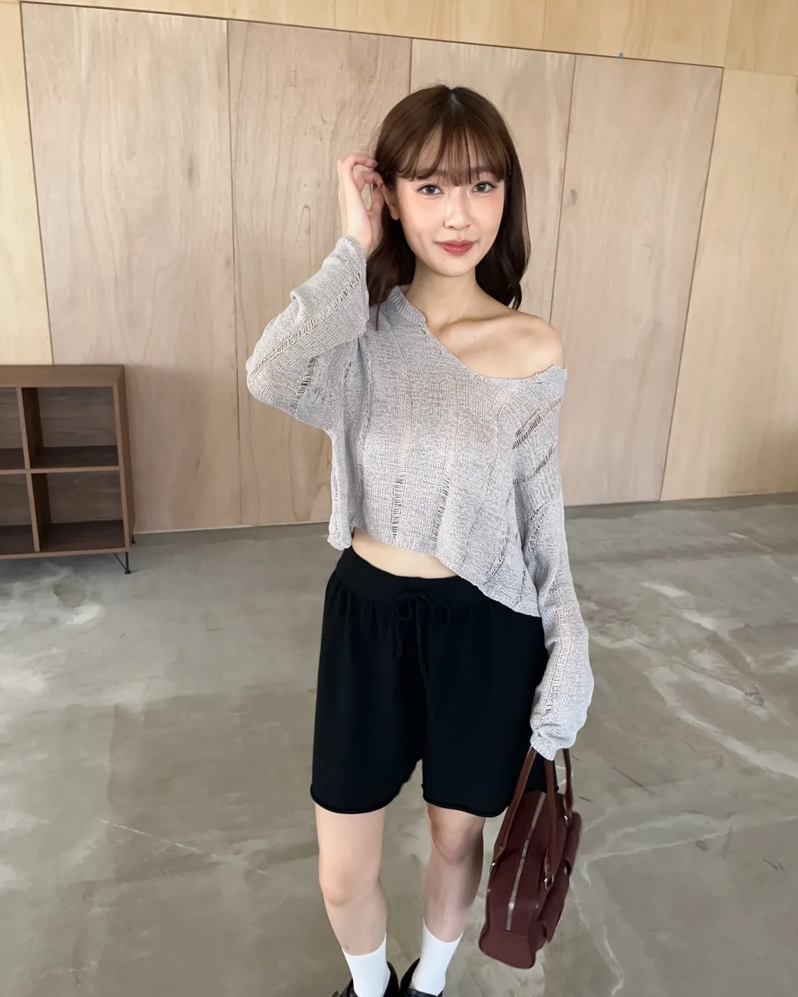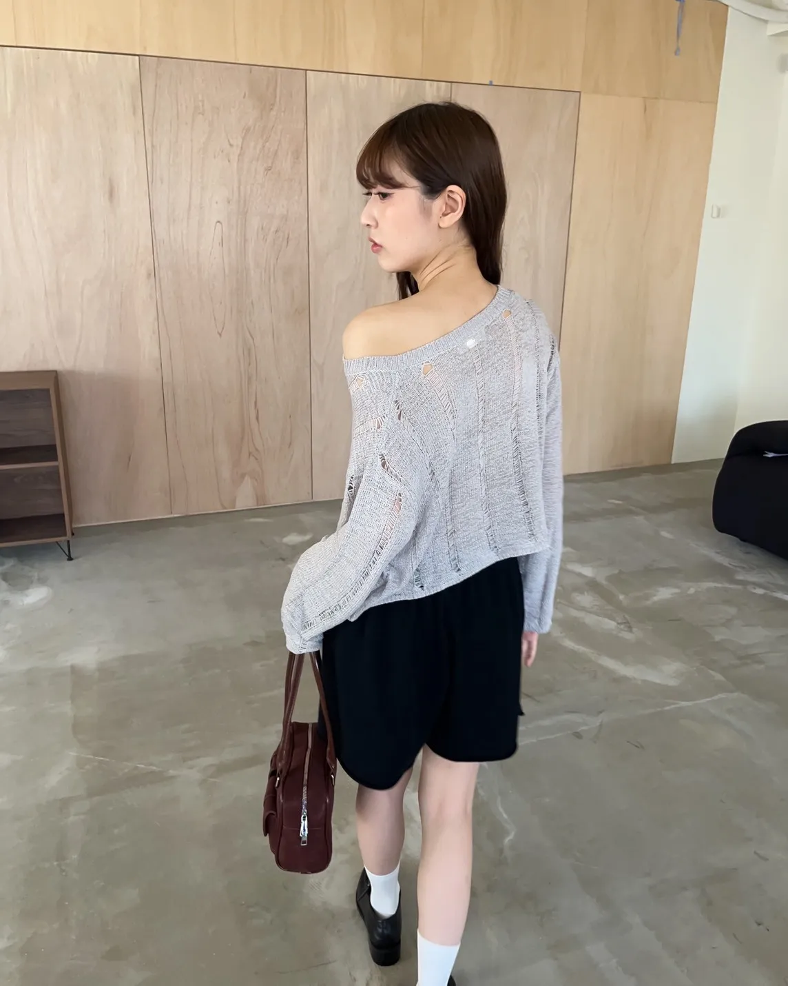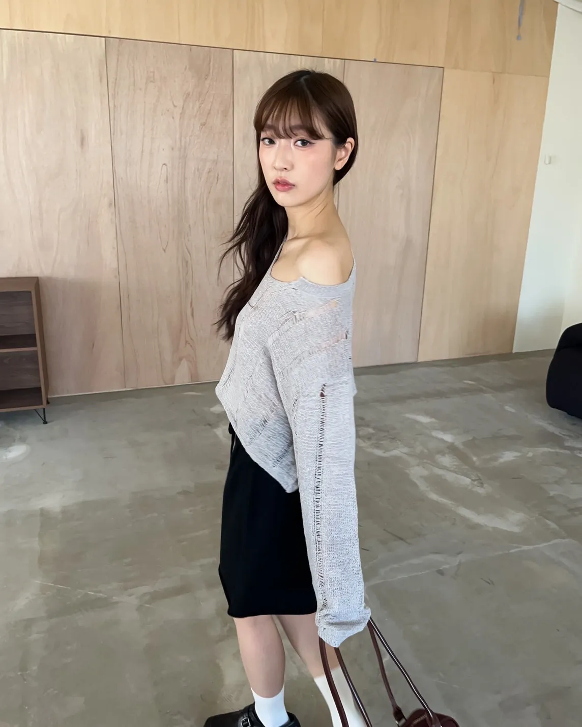 V0025小俏皮抓破寬短版針織上衣(白/黃/灰/黑)(售完不補)