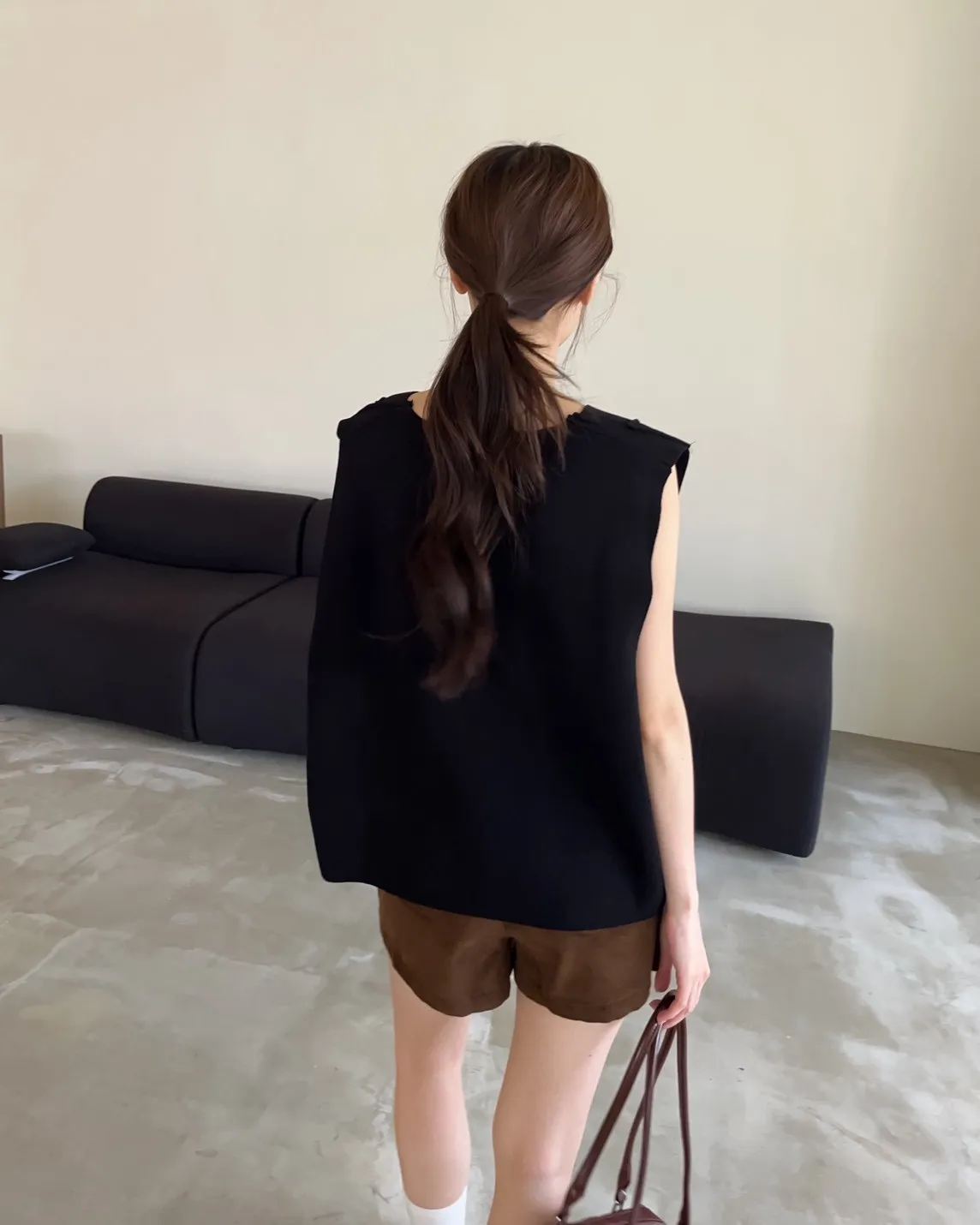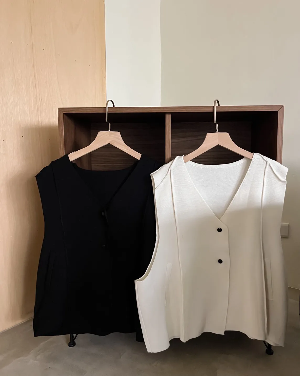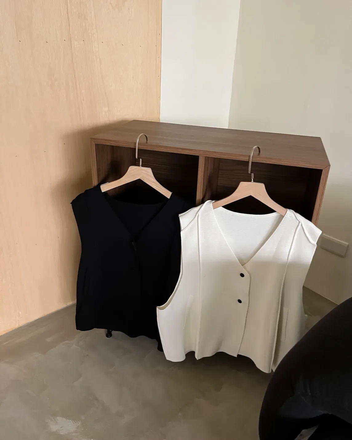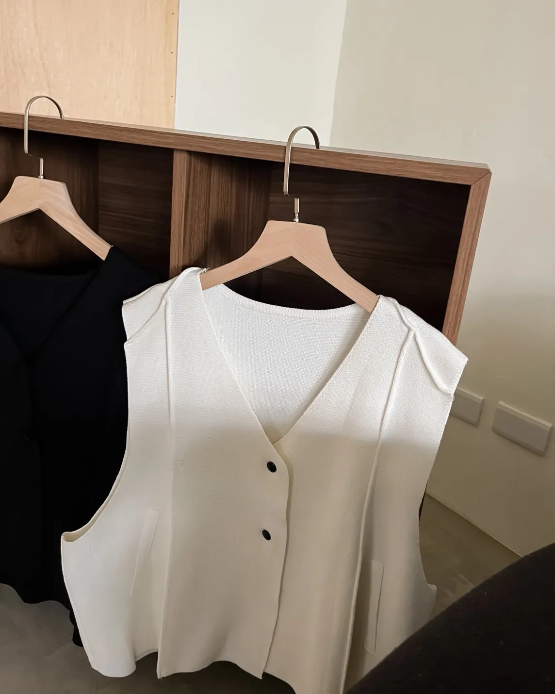 V0022俐落鈕釦落肩針織背心(米白/黑)(售完不補)