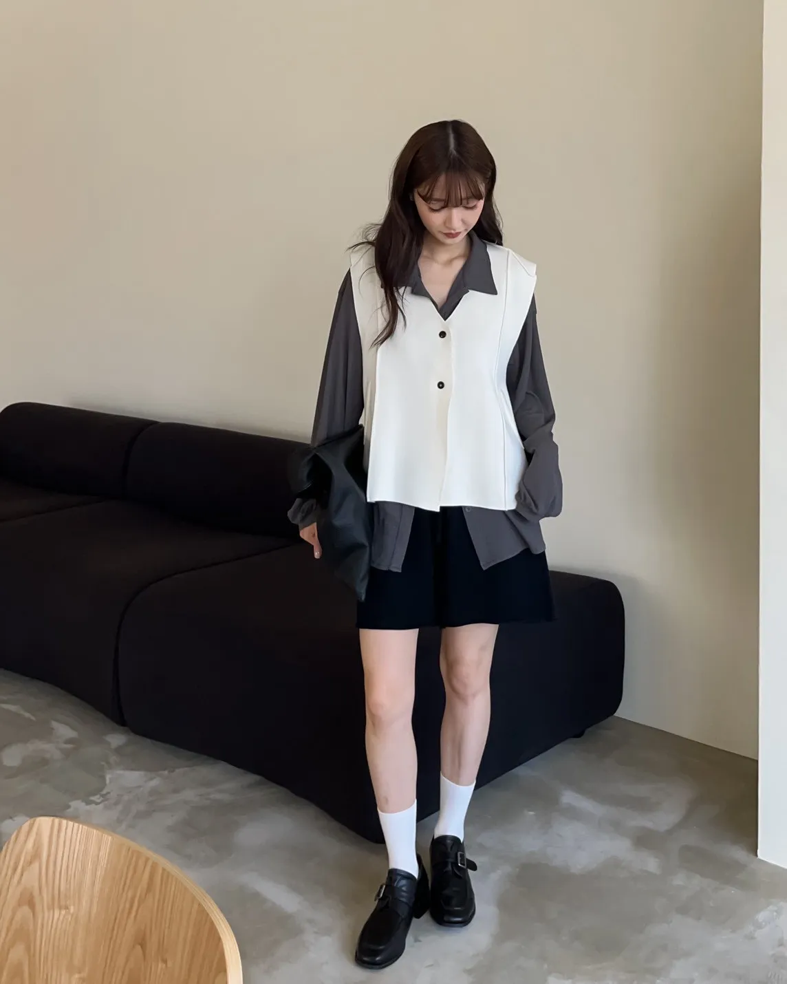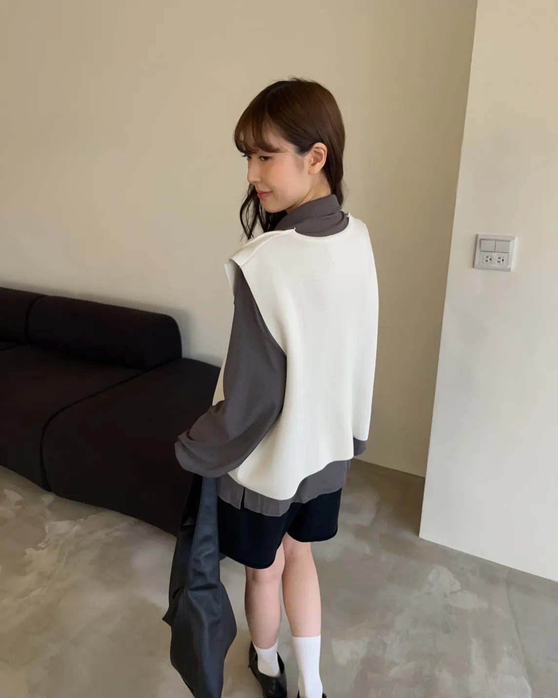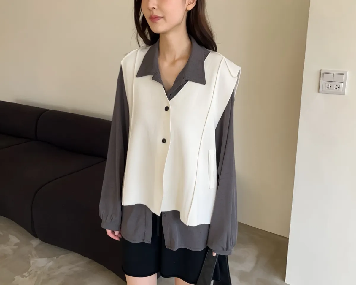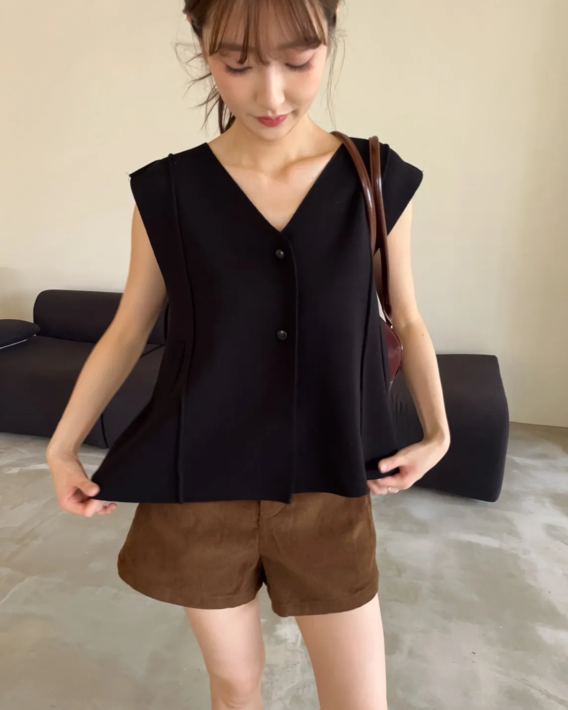 V0022俐落鈕釦落肩針織背心(米白/黑)(售完不補)