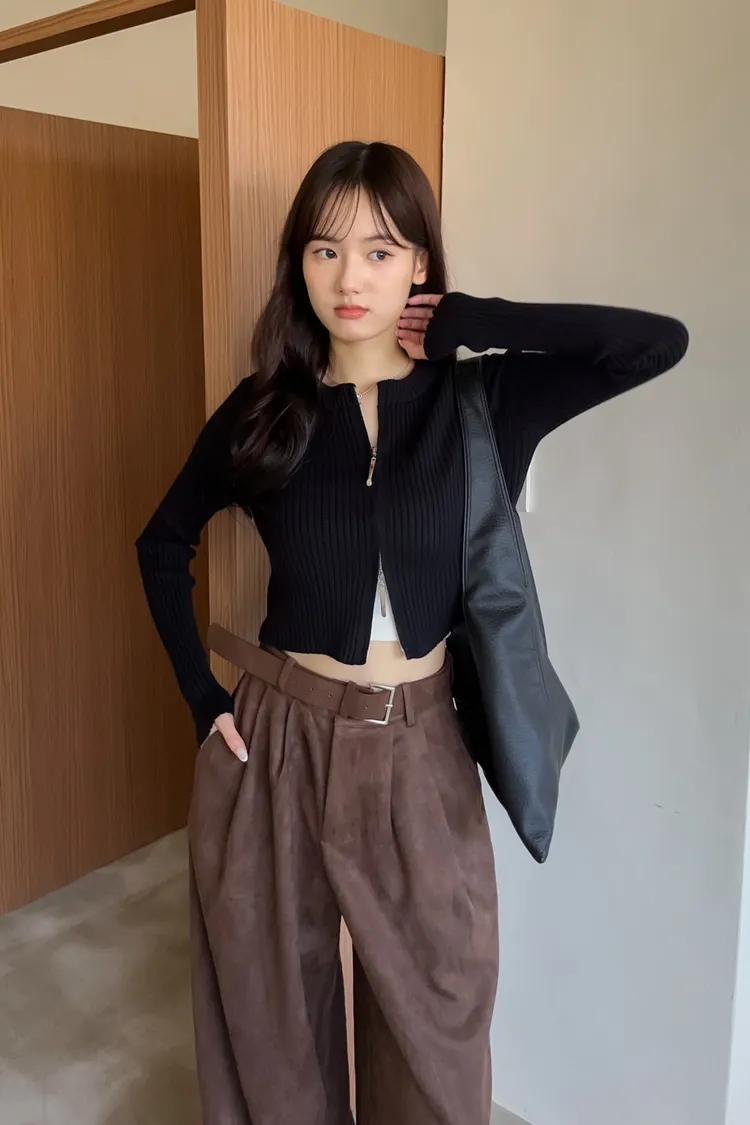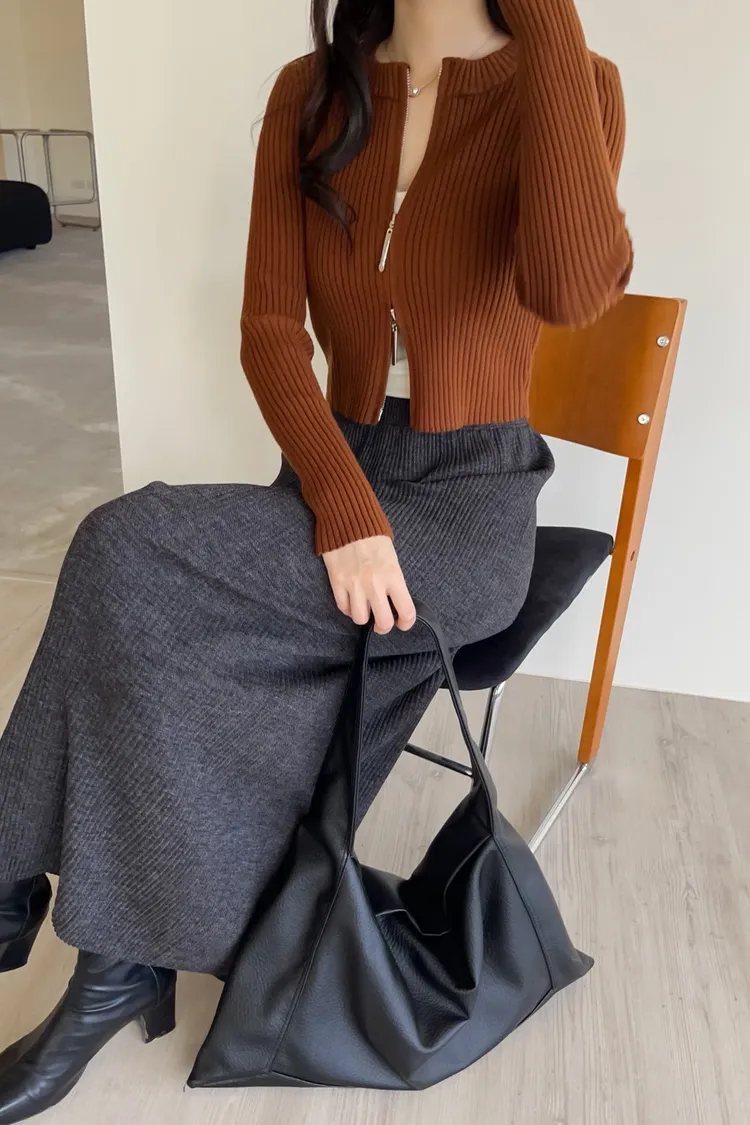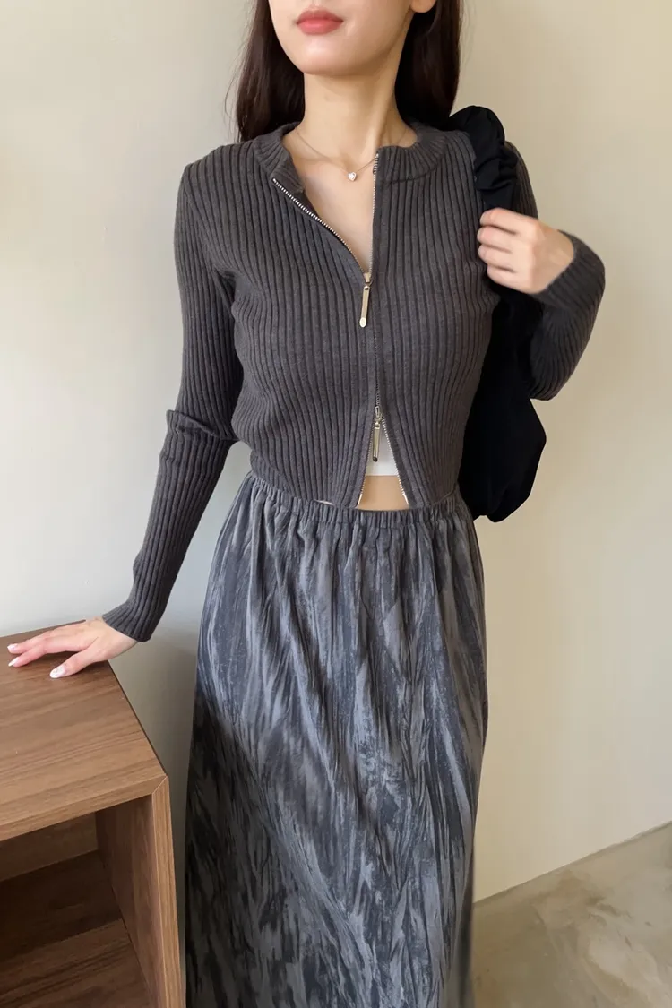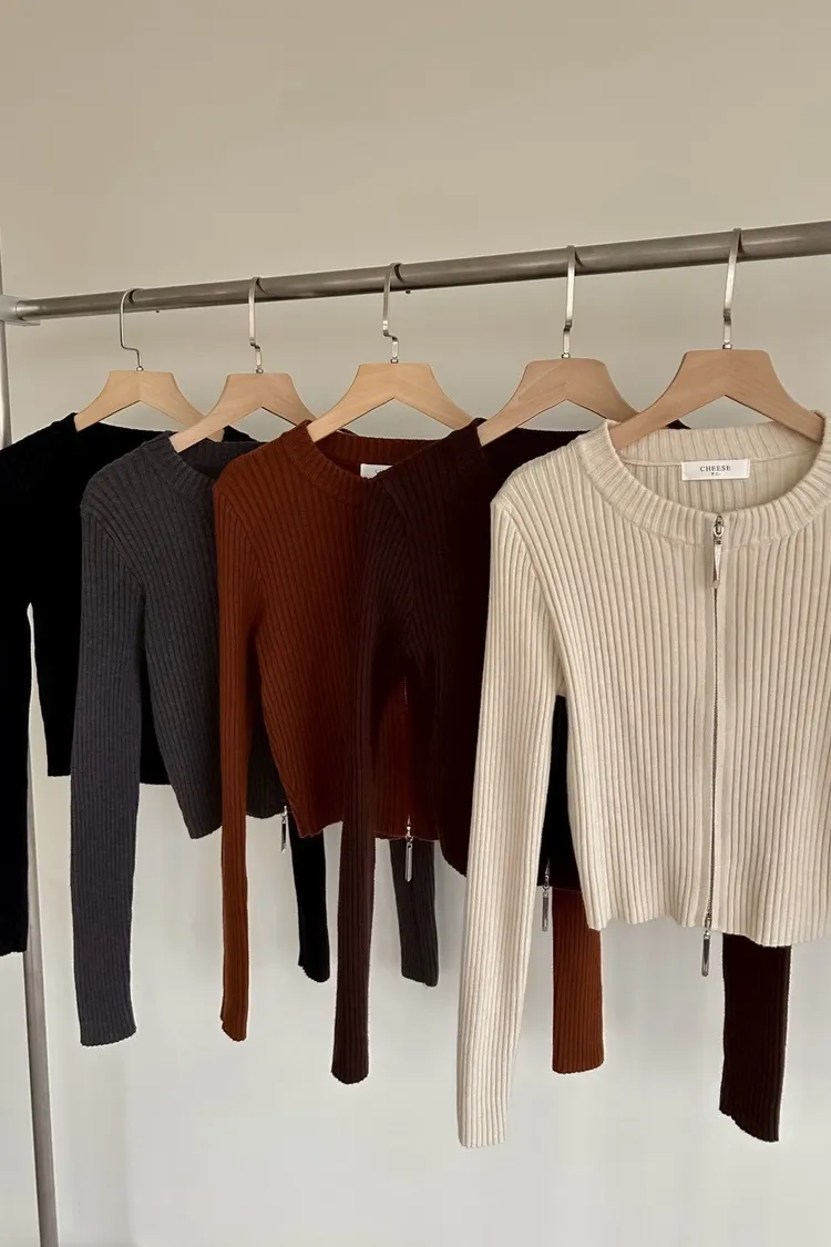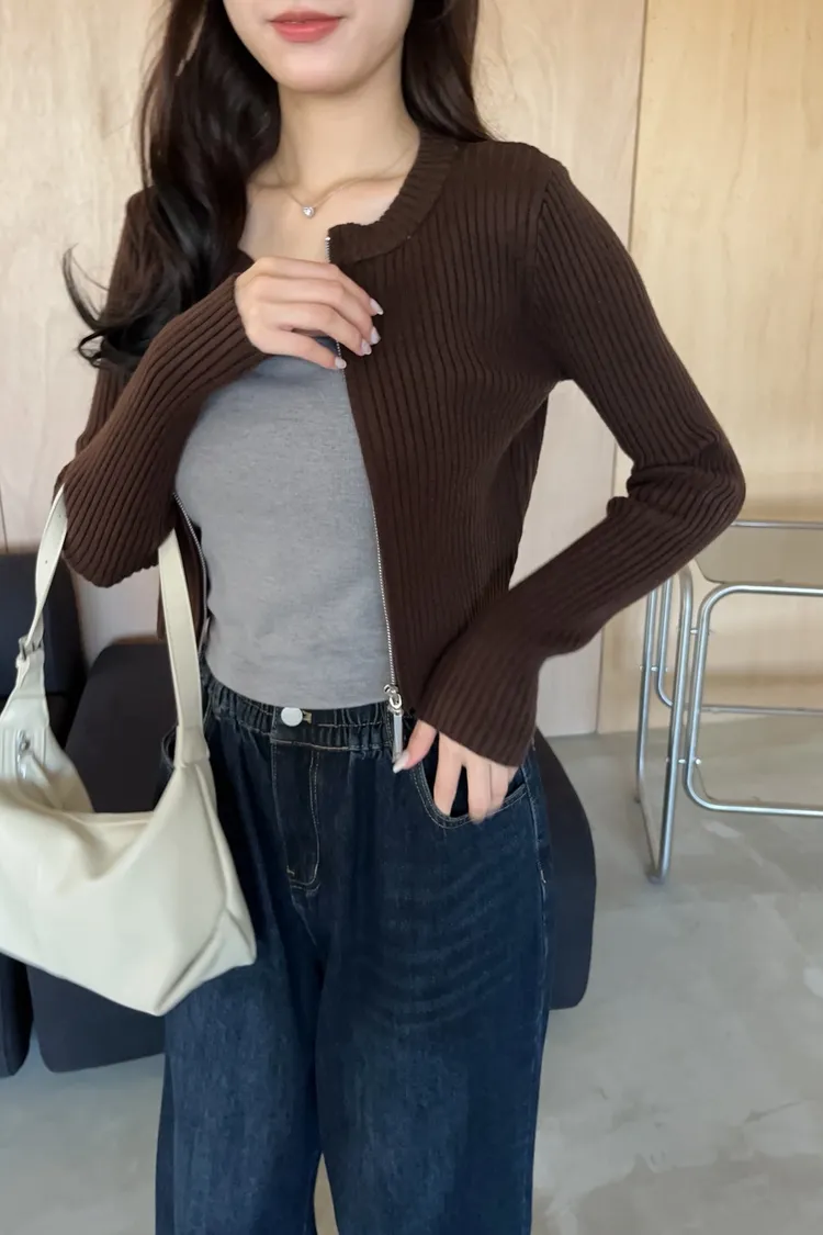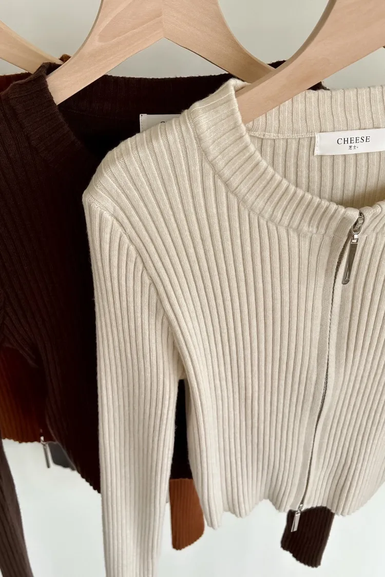 V0061短版坑條雙拉鍊針織外套(米白/咖啡/焦糖/灰/黑)
