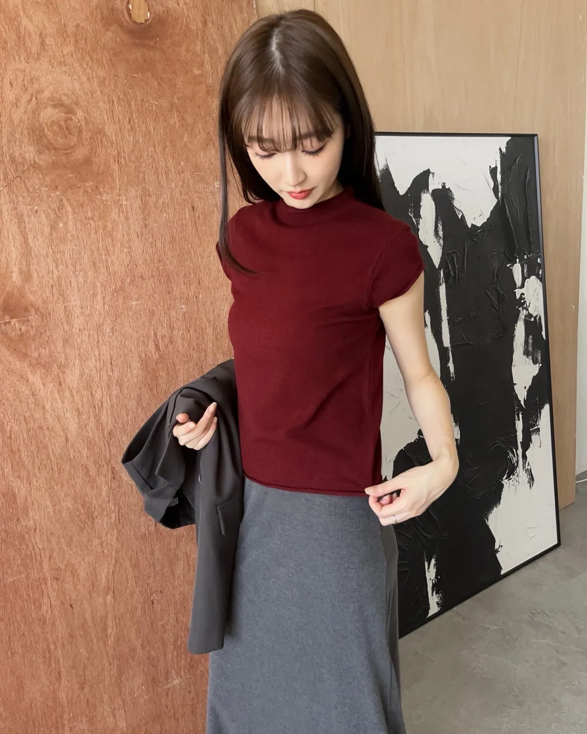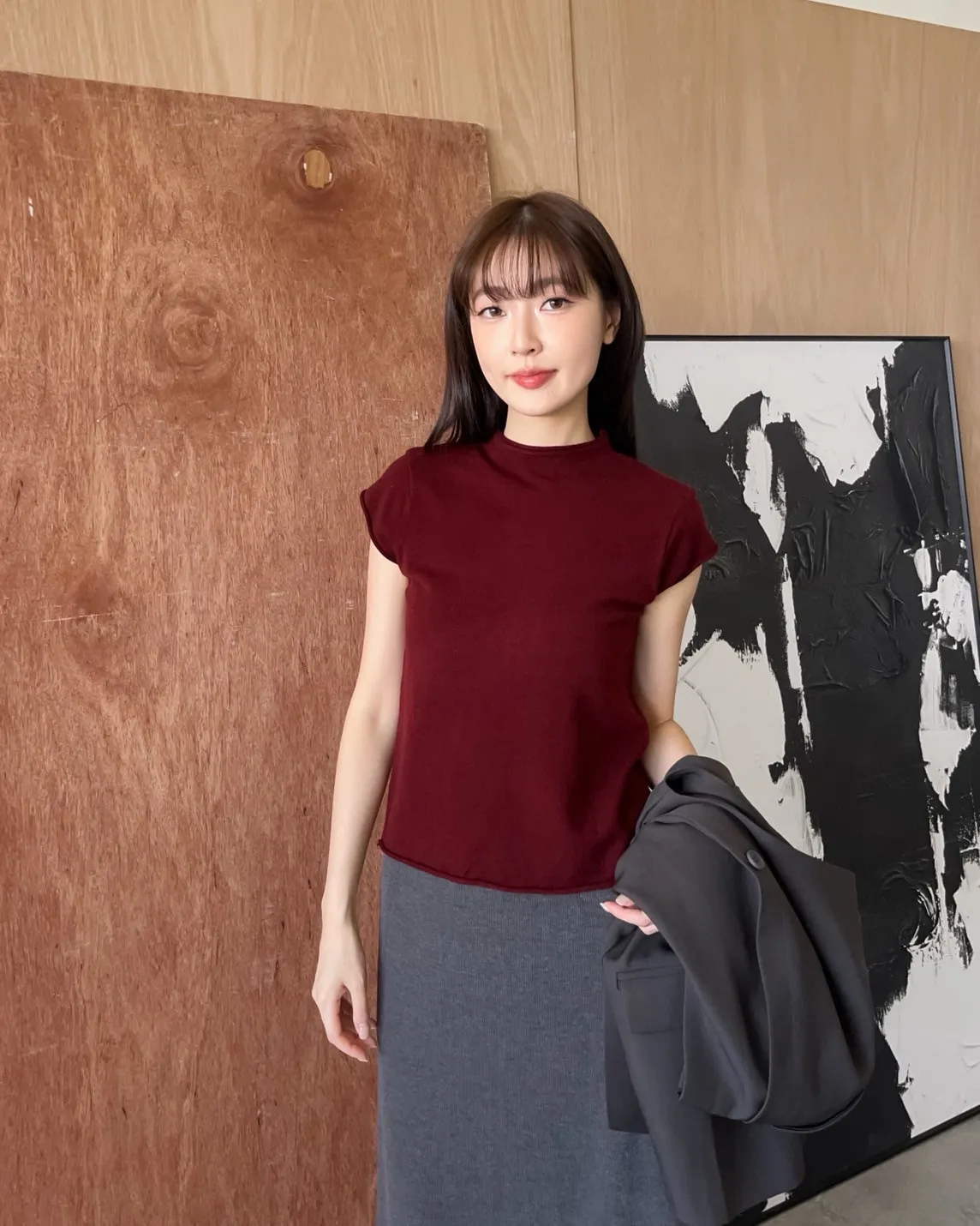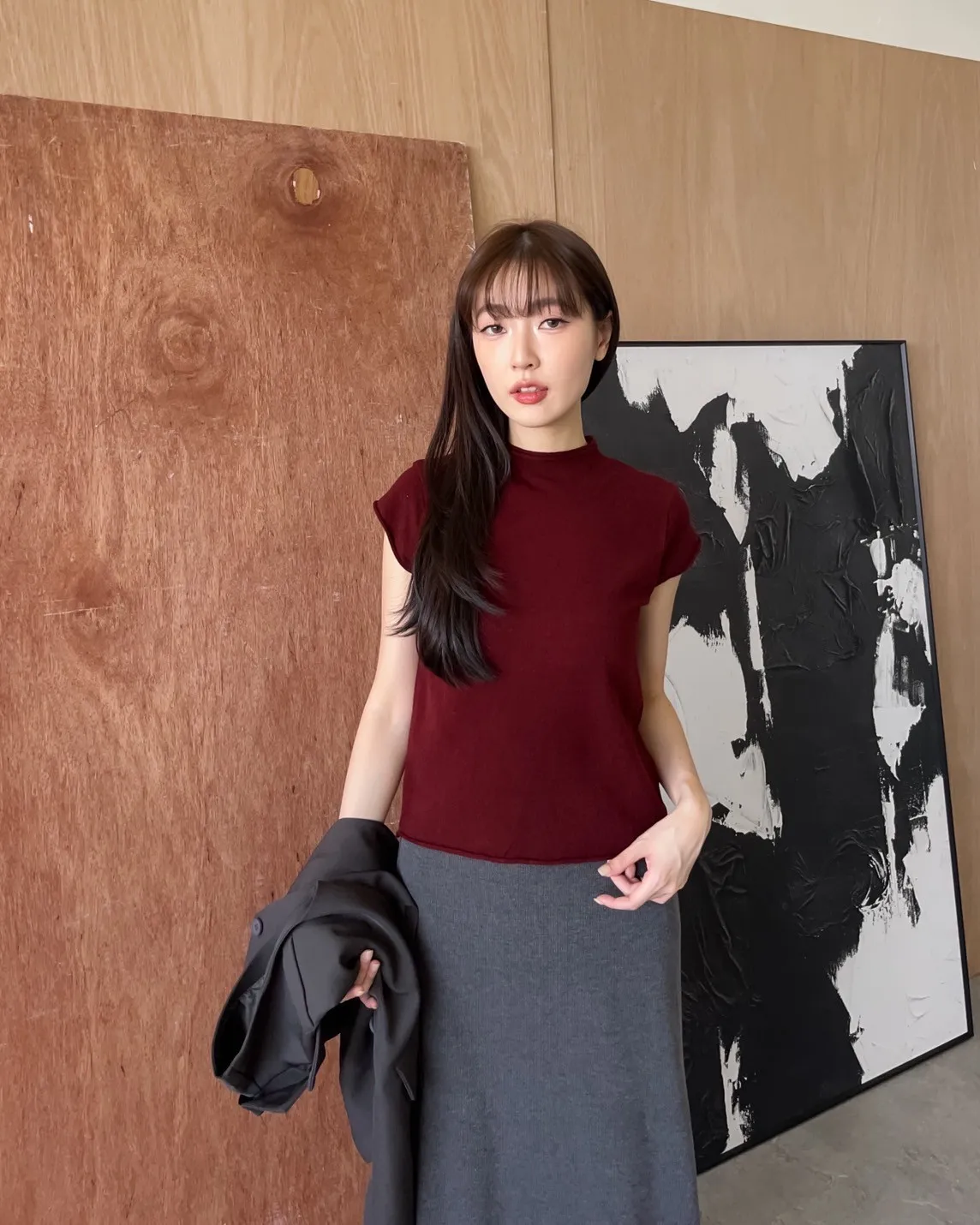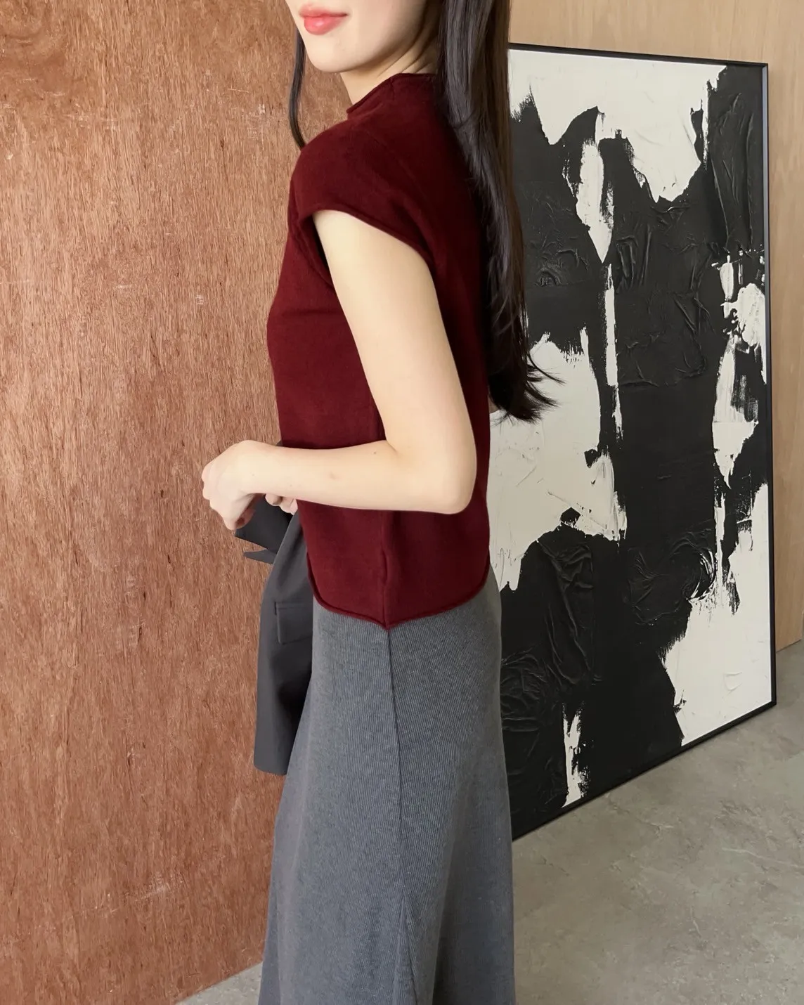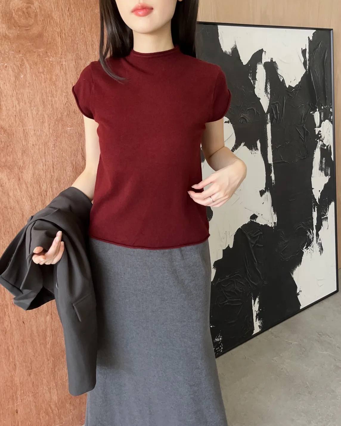 U0073知性美捲邊小立領針織上衣(杏/咖啡/紅/深灰/黑)