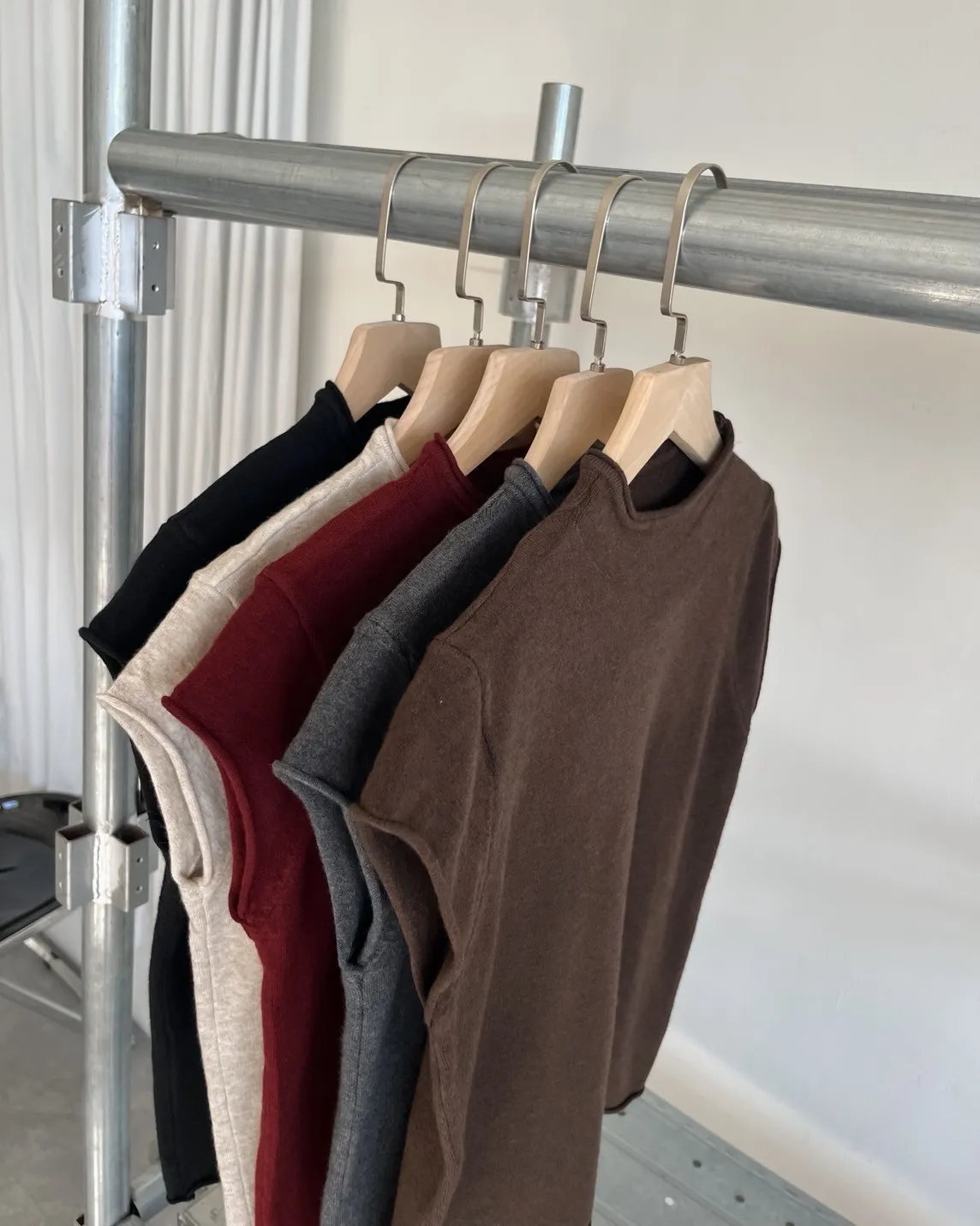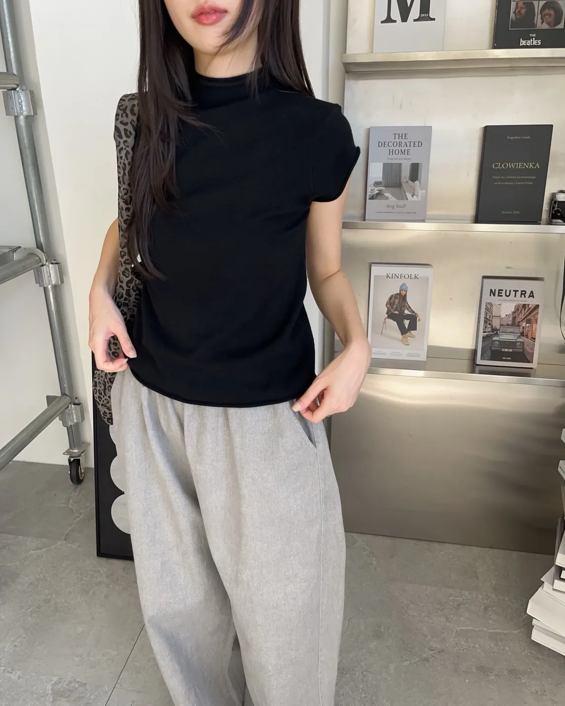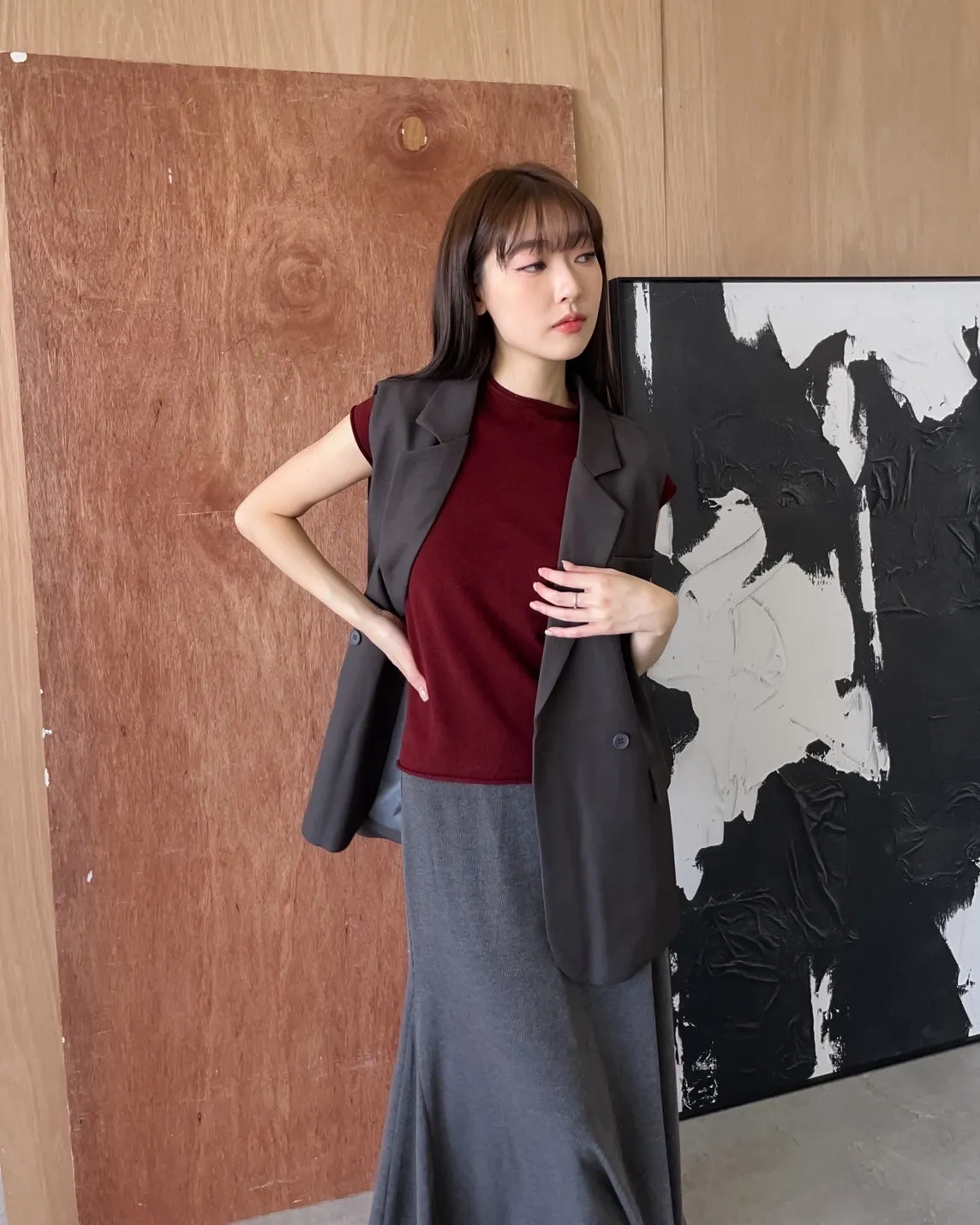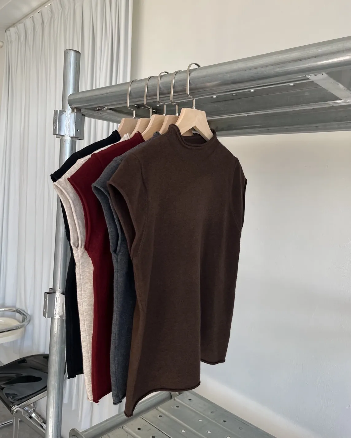 U0073知性美捲邊小立領針織上衣(杏/咖啡/紅/深灰/黑)