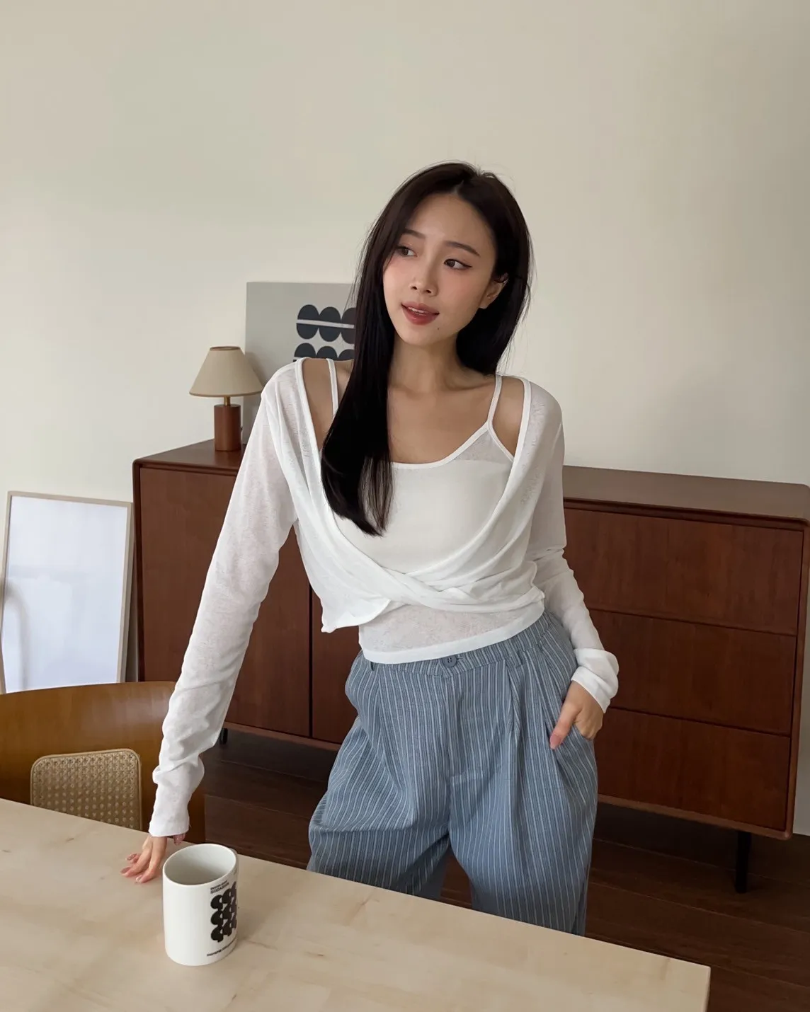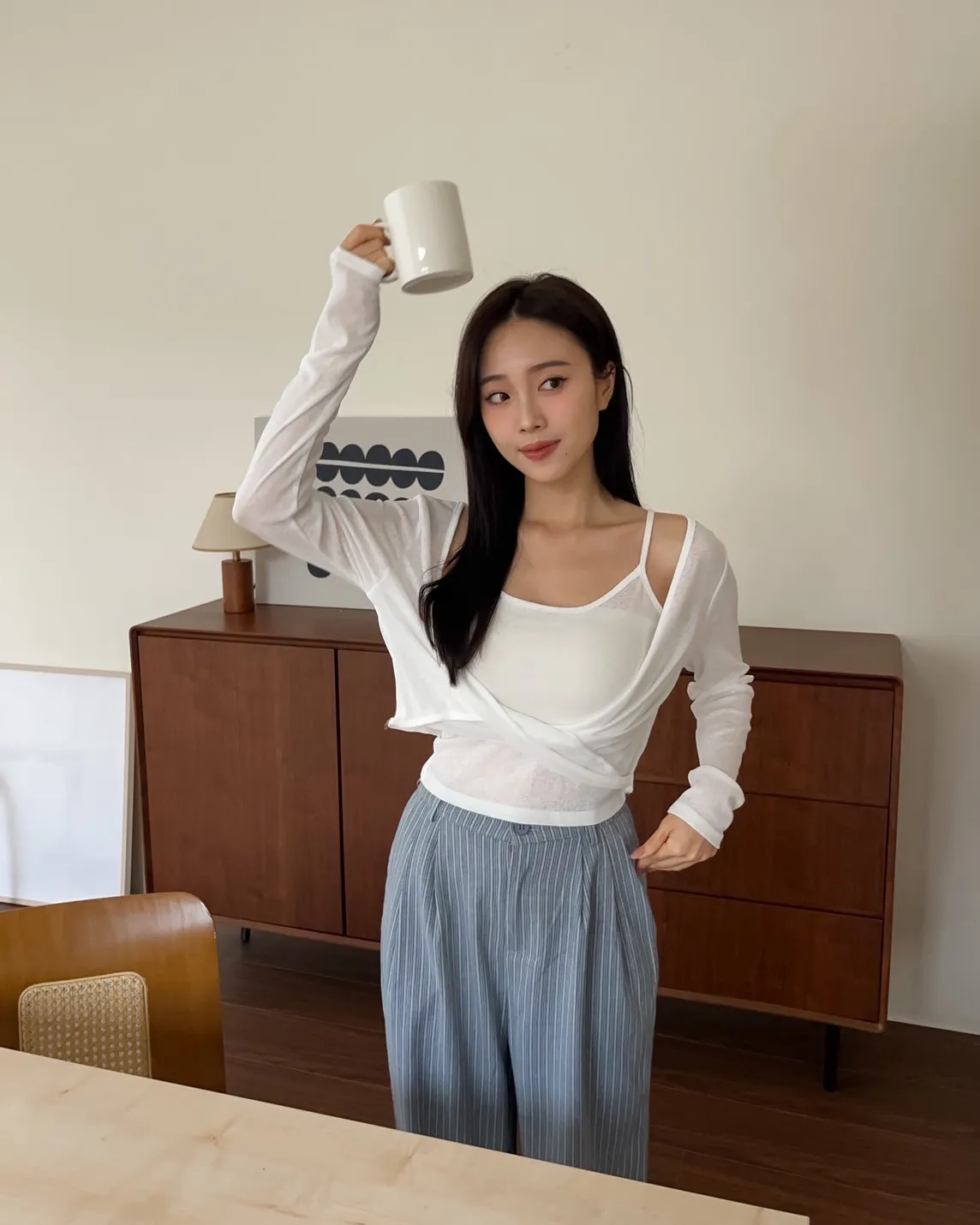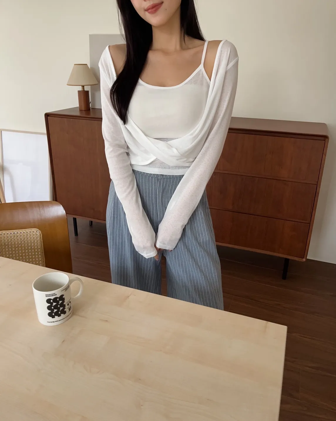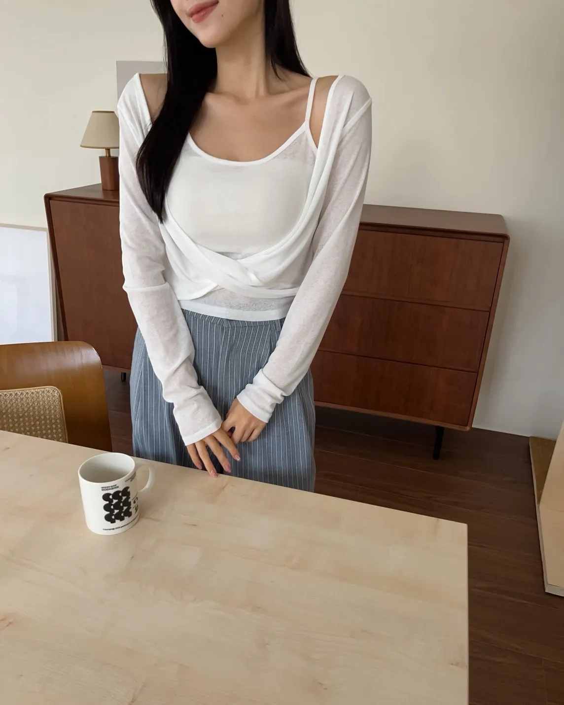 T0039(SET)簡約透紗背心+交叉防曬長袖(白/粉杏/黑)(售完不補)