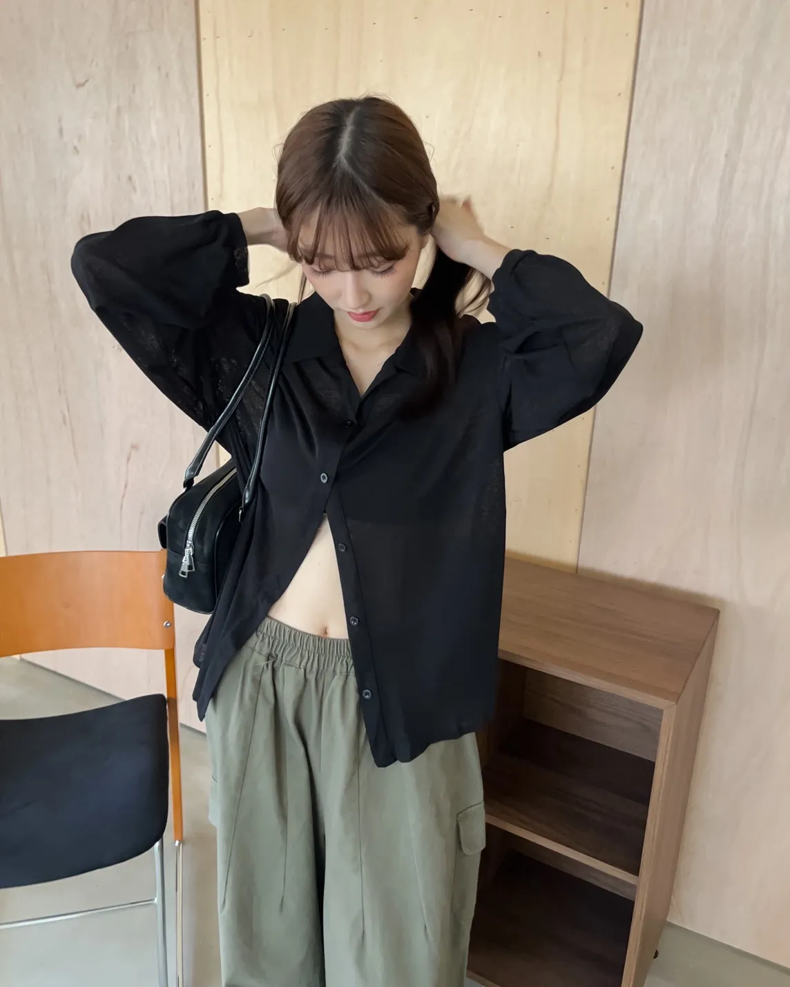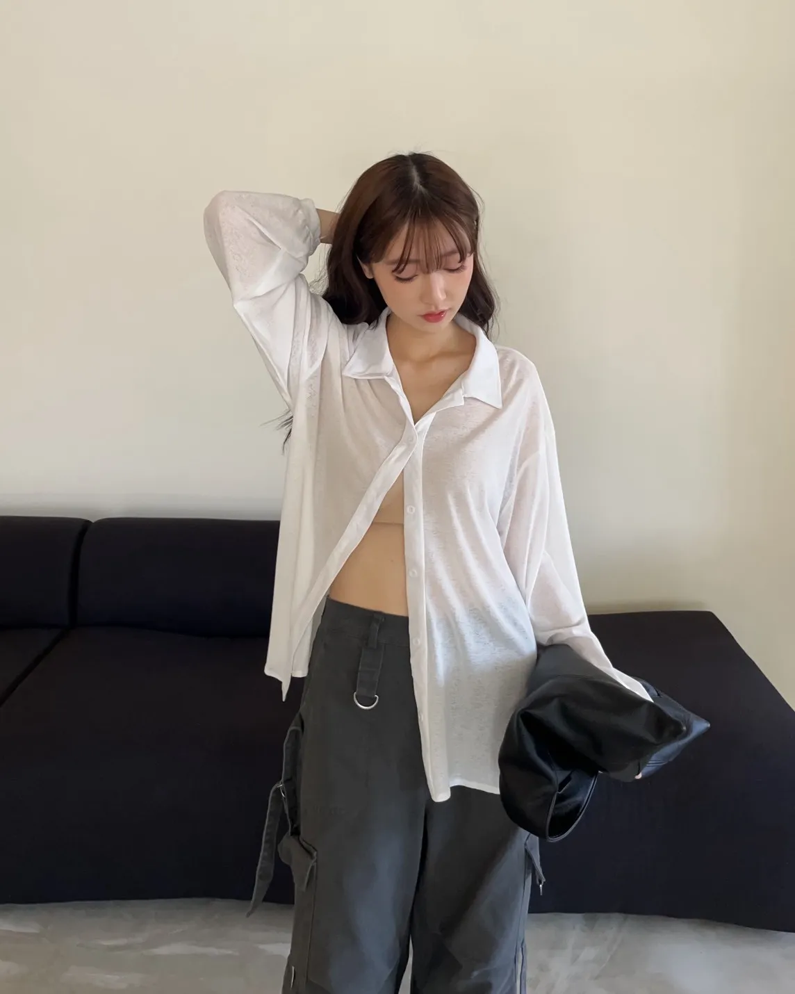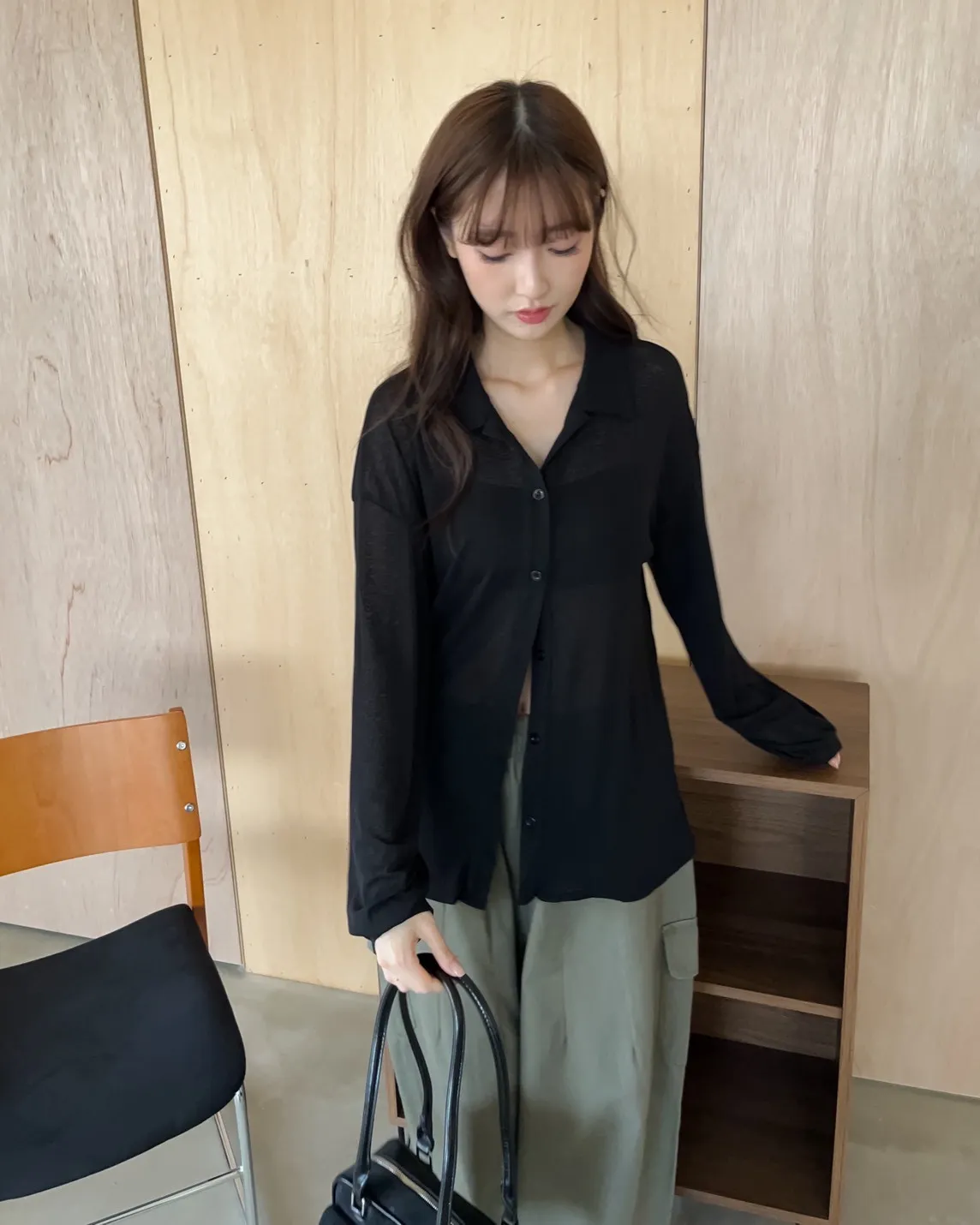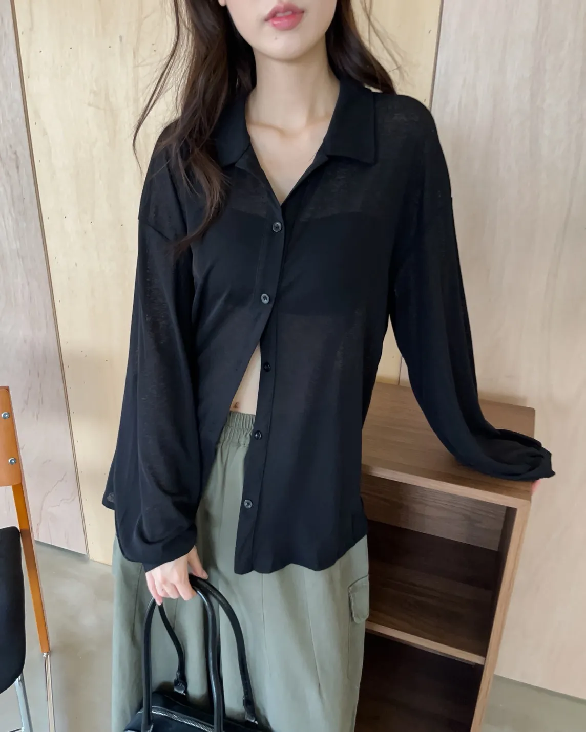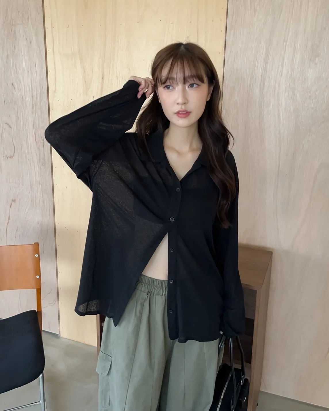 V0021厭世感輕紗排釦翻領襯衫(白/灰/黑)(售完不補)
