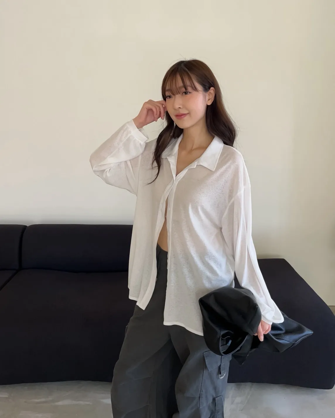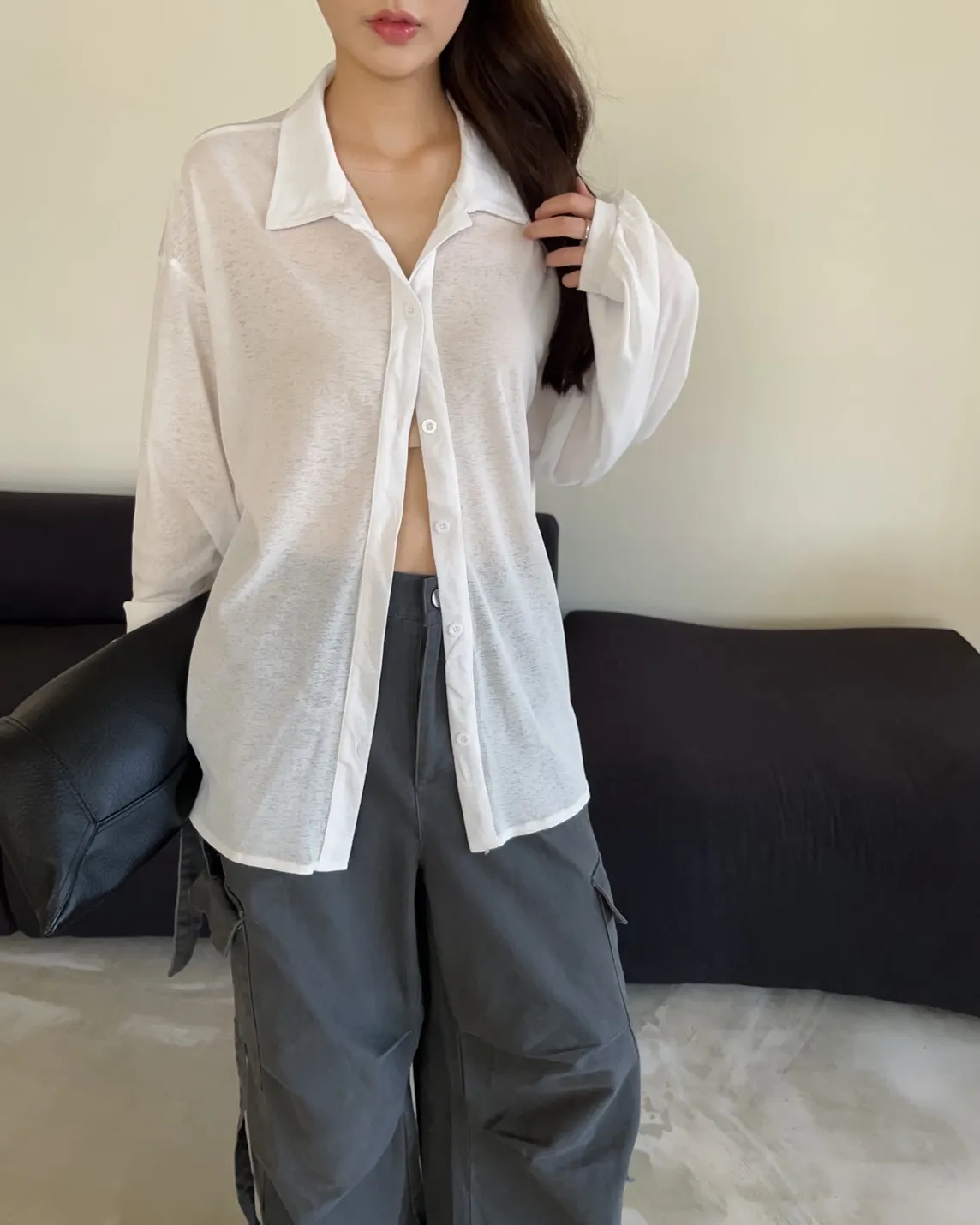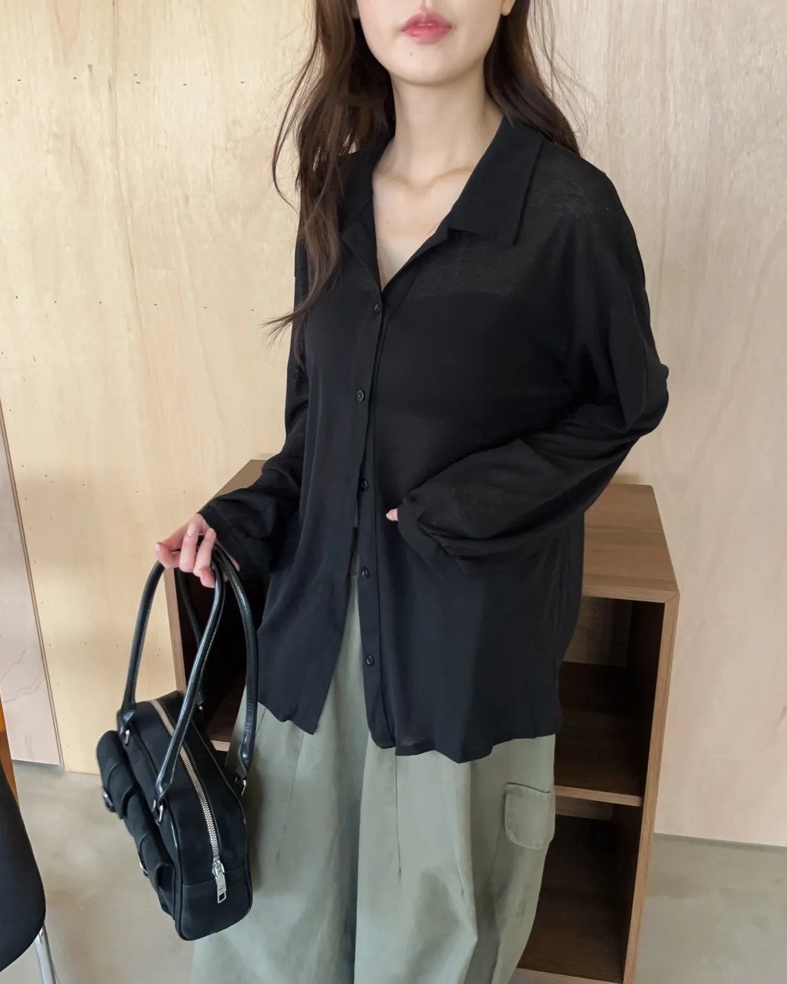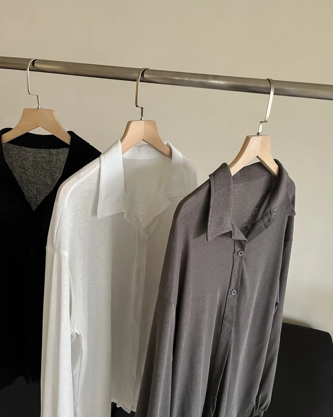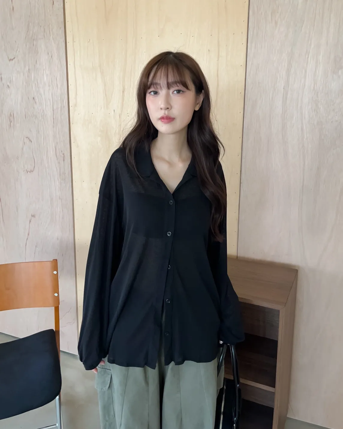 V0021厭世感輕紗排釦翻領襯衫(白/灰/黑)(售完不補)