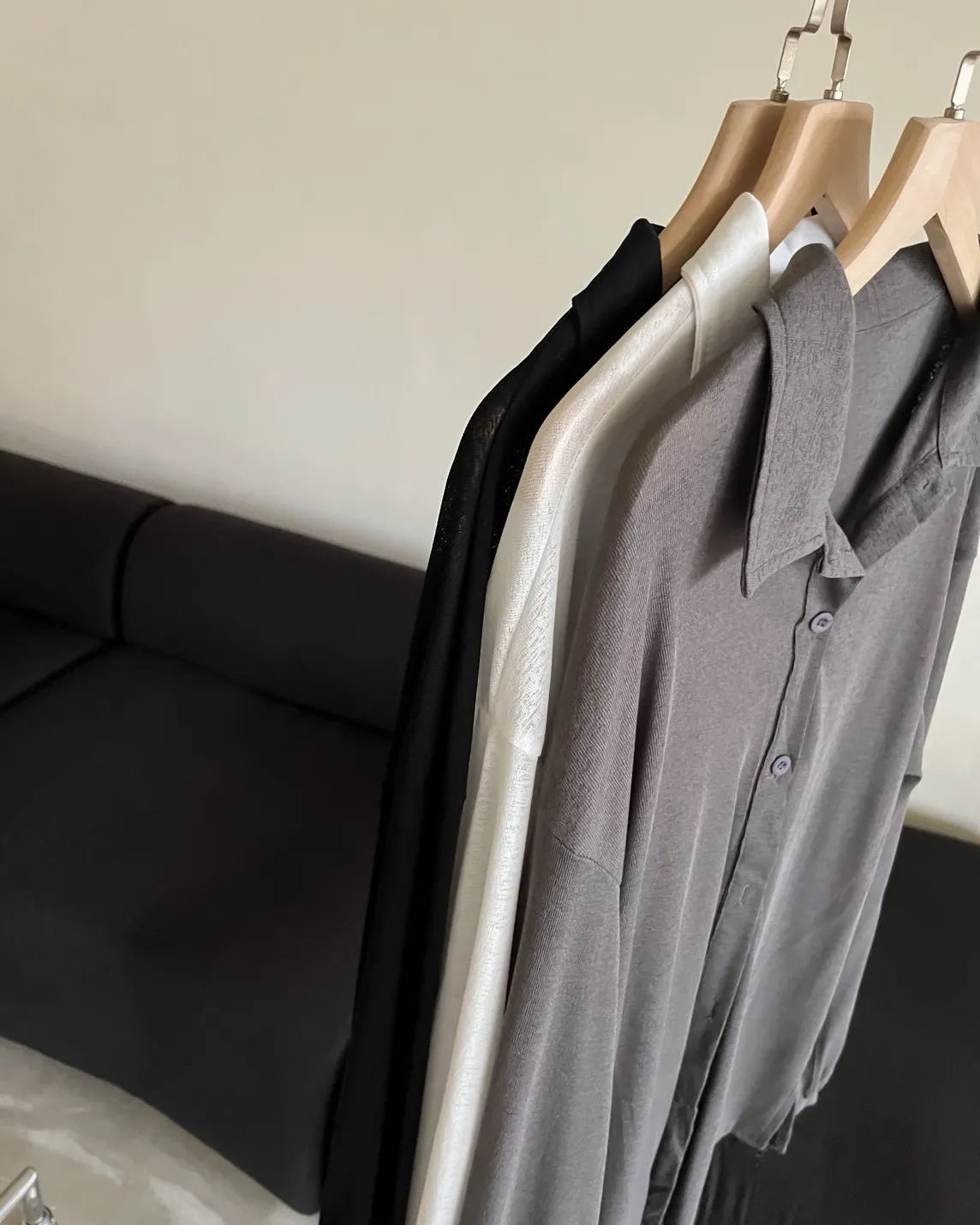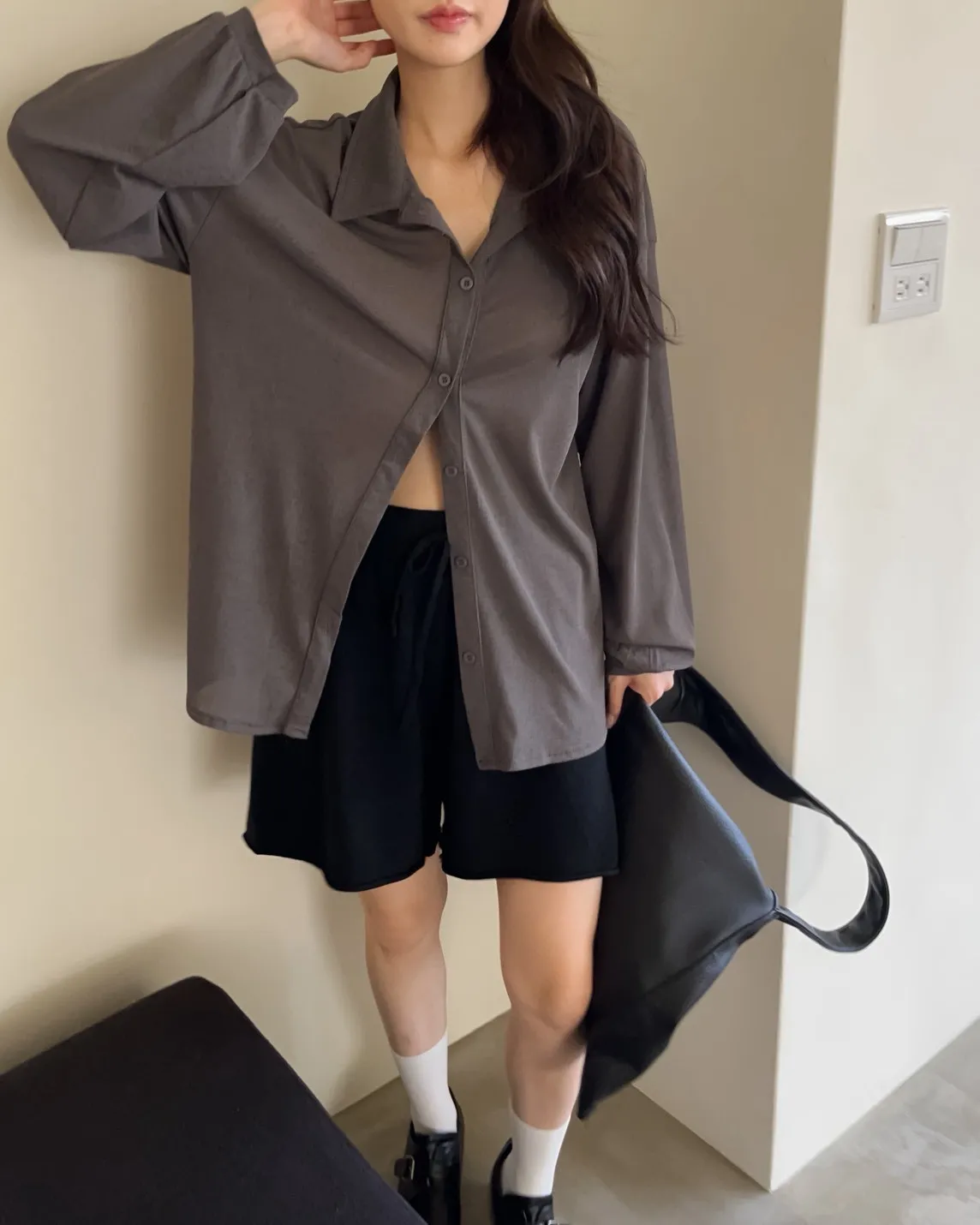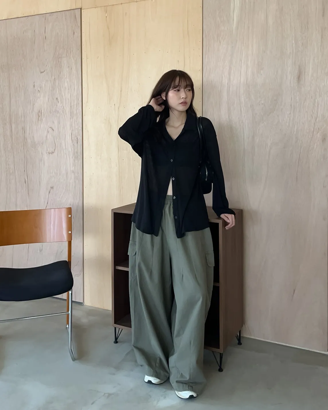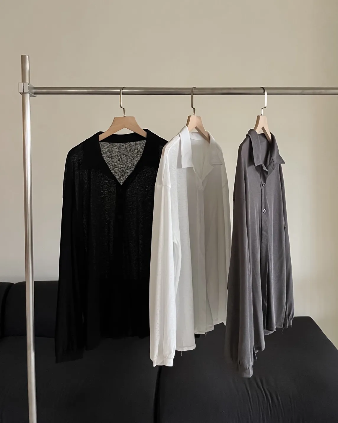 V0021厭世感輕紗排釦翻領襯衫(白/灰/黑)(售完不補)