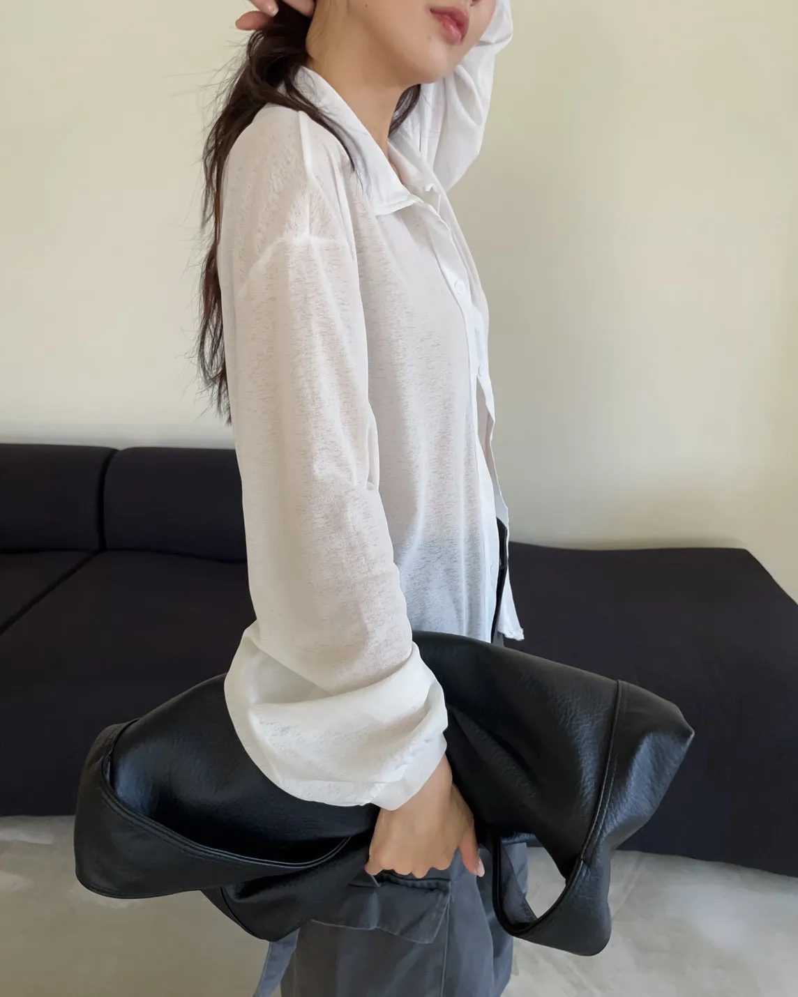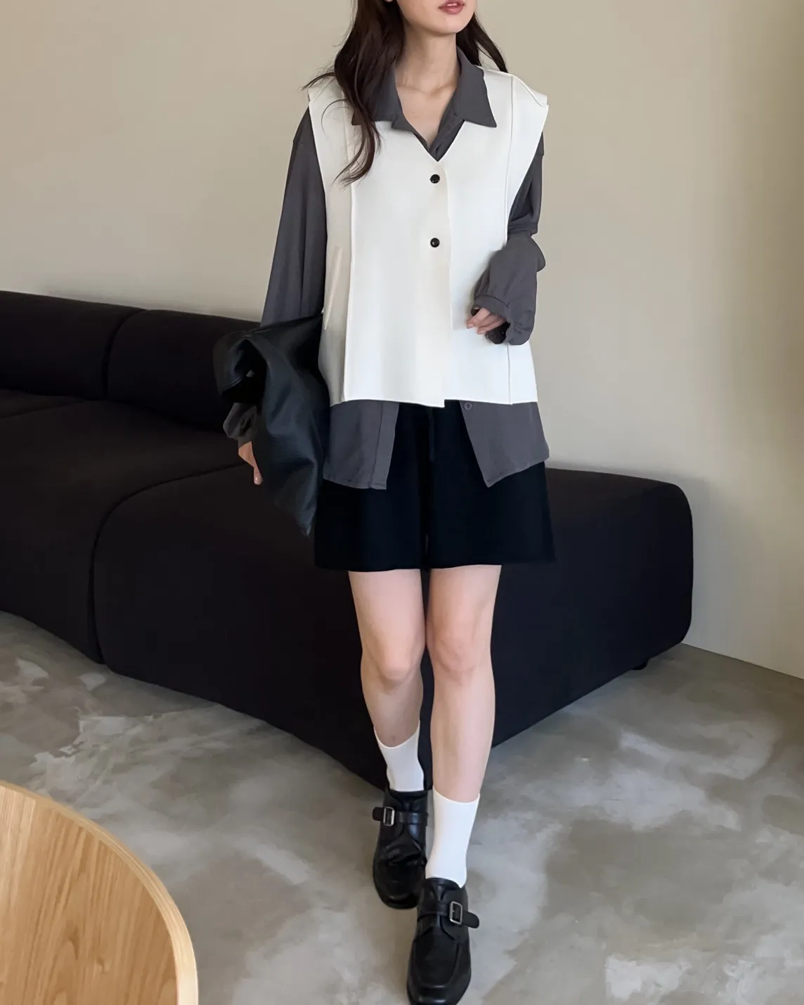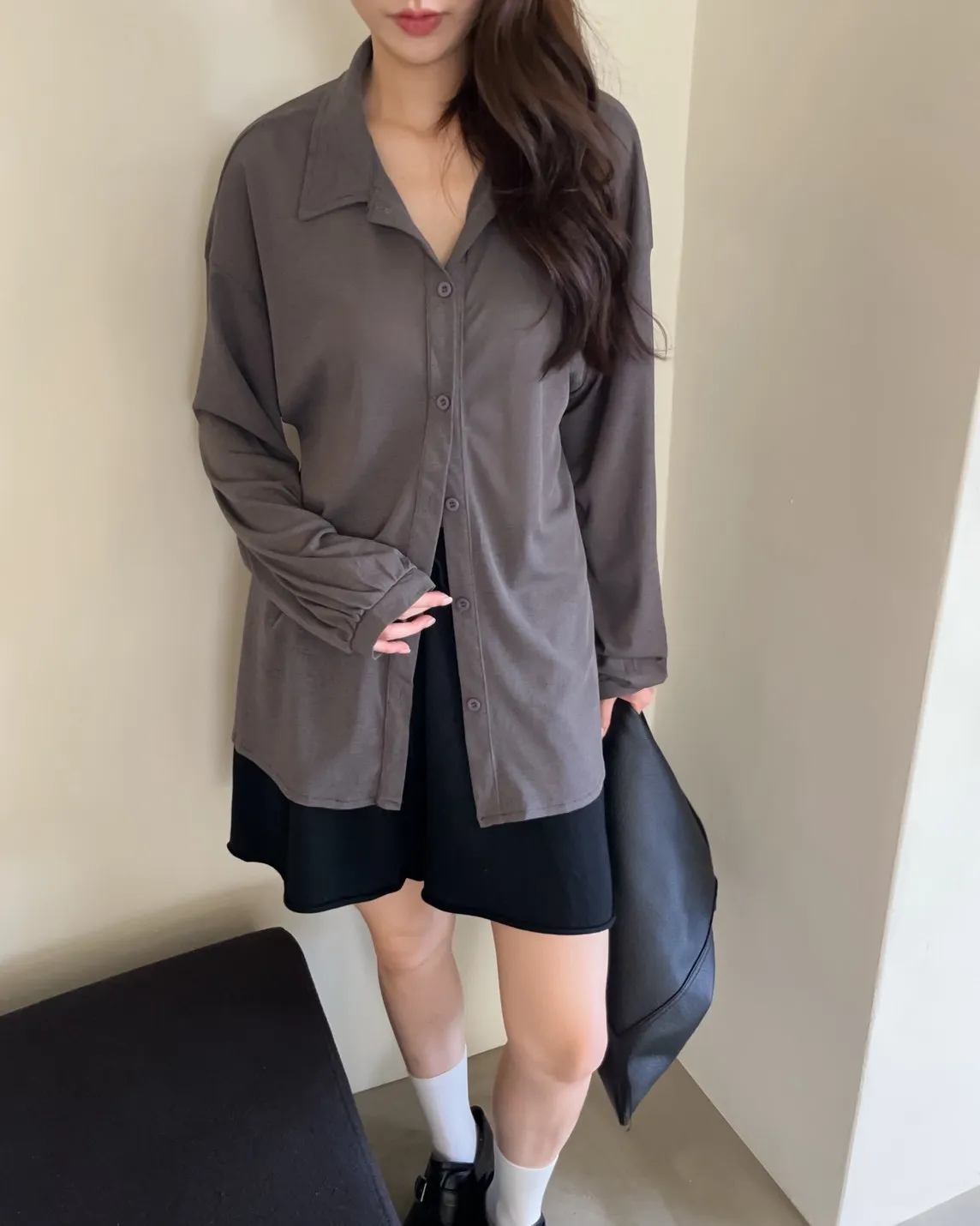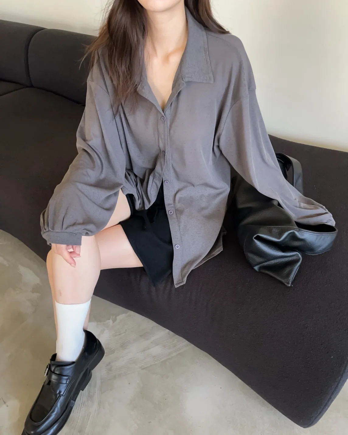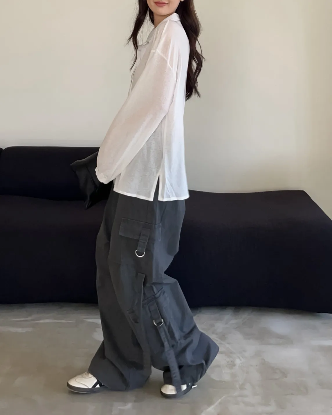 V0021厭世感輕紗排釦翻領襯衫(白/灰/黑)(售完不補)