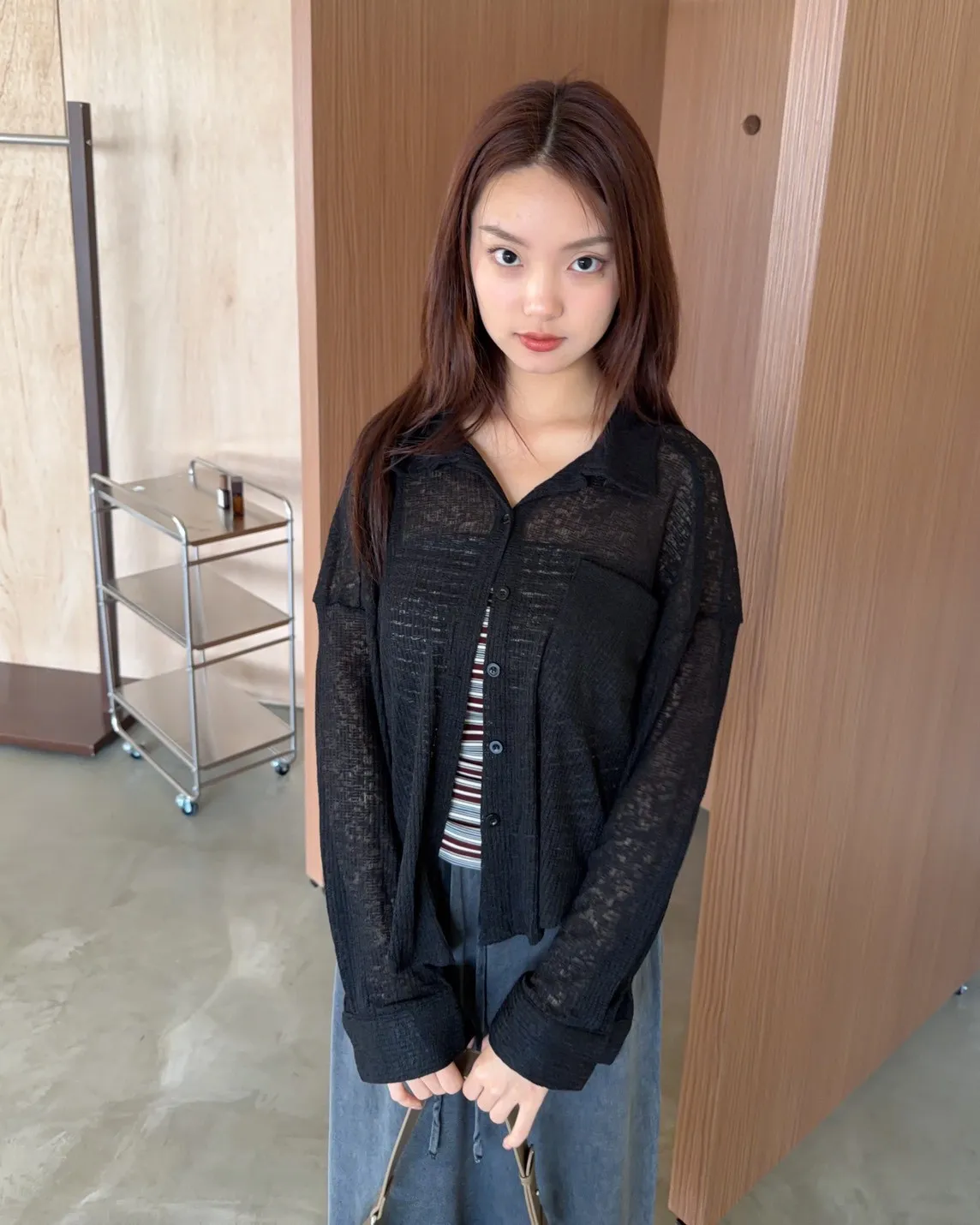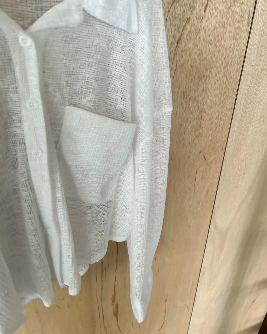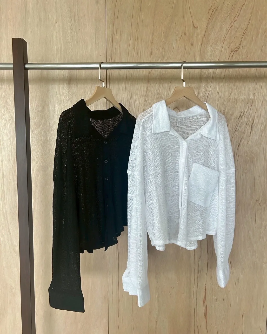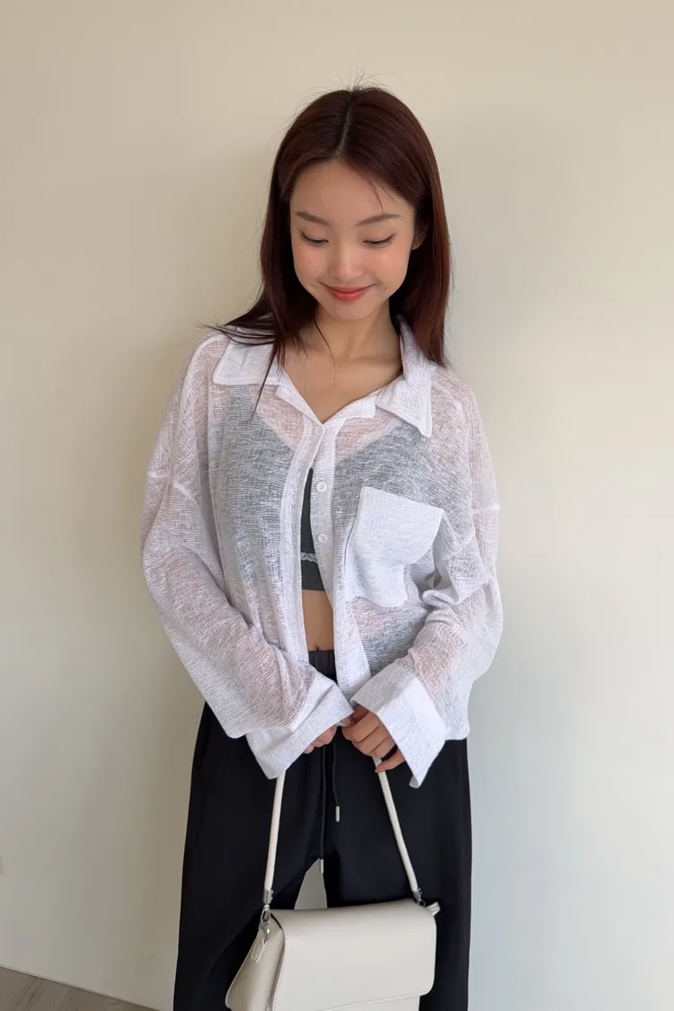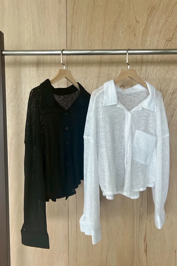 薄透針織 透視感 下擺圓弧 同色鈕扣 前口袋 袖鈕扣 後打折