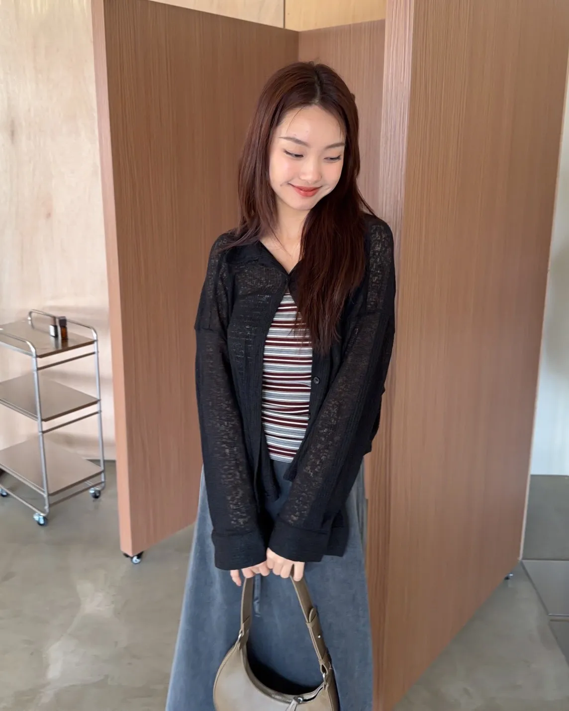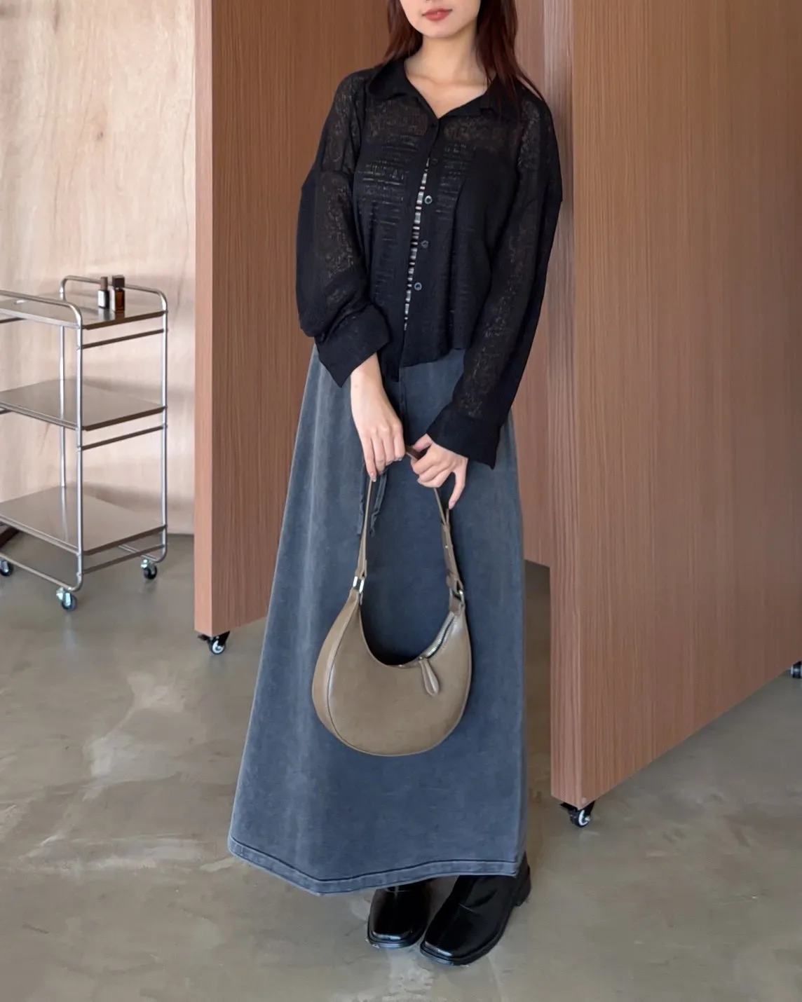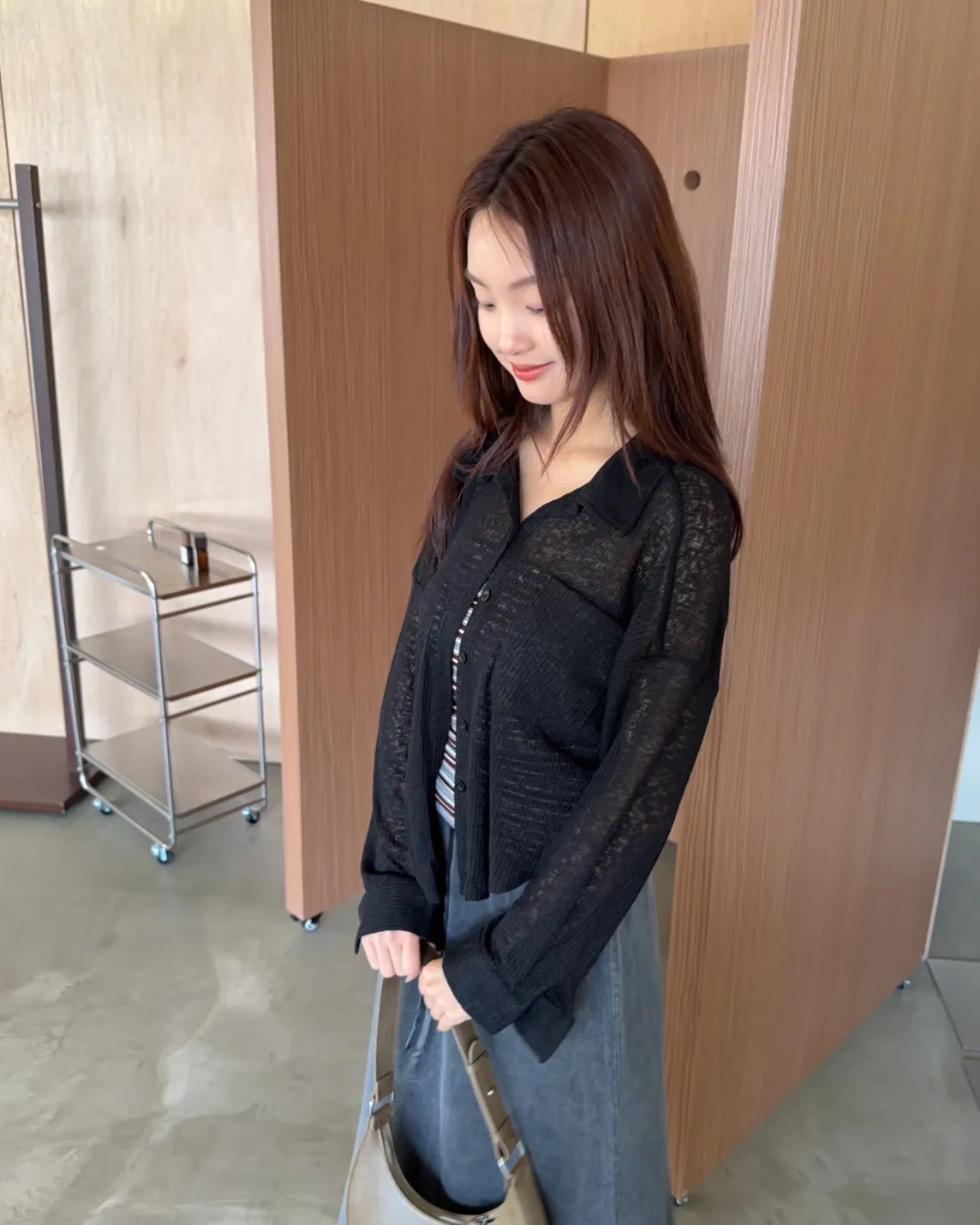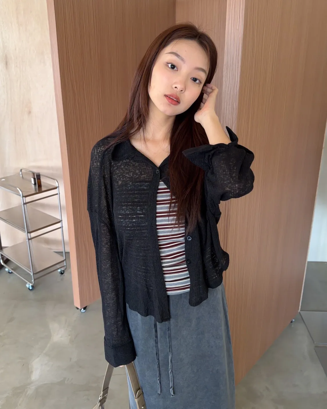 薄透針織 透視感 下擺圓弧 同色鈕扣 前口袋 袖鈕扣 後打折