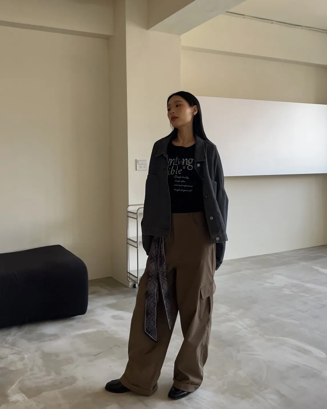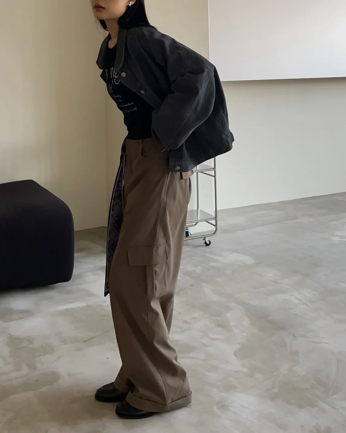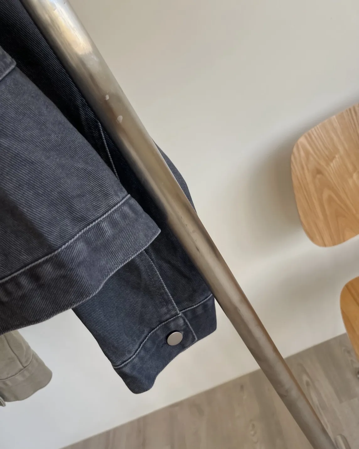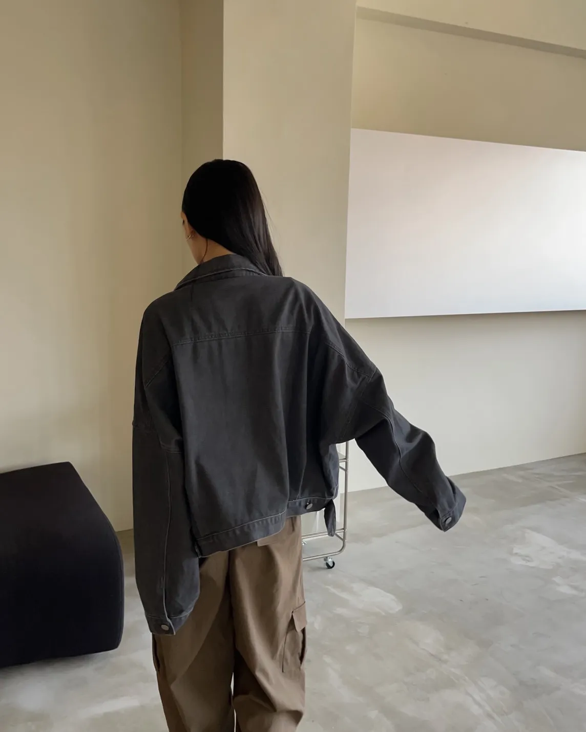 翻領 兩邊口袋 寬件縮腰版型 長度中版 水洗牛仔無彈性