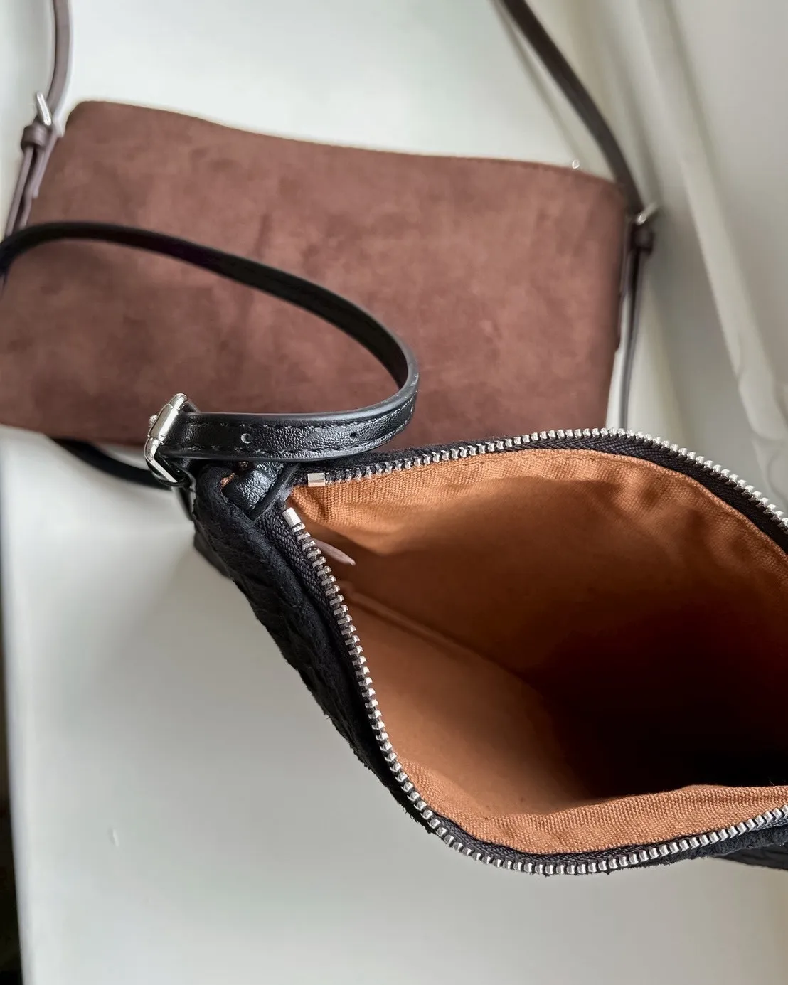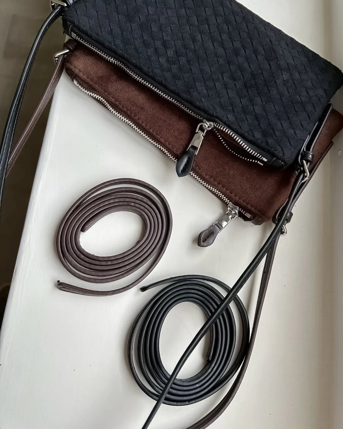 附兩種背帶(一長一短) 背帶是皮革的 包包本身是絨布 咖啡色是素面 黑色有編織紋路