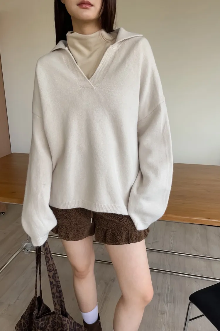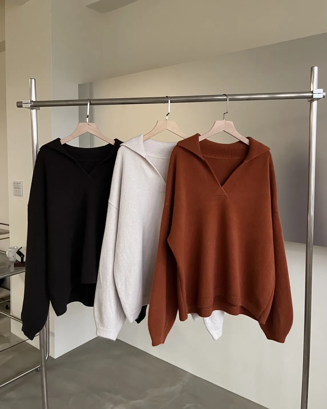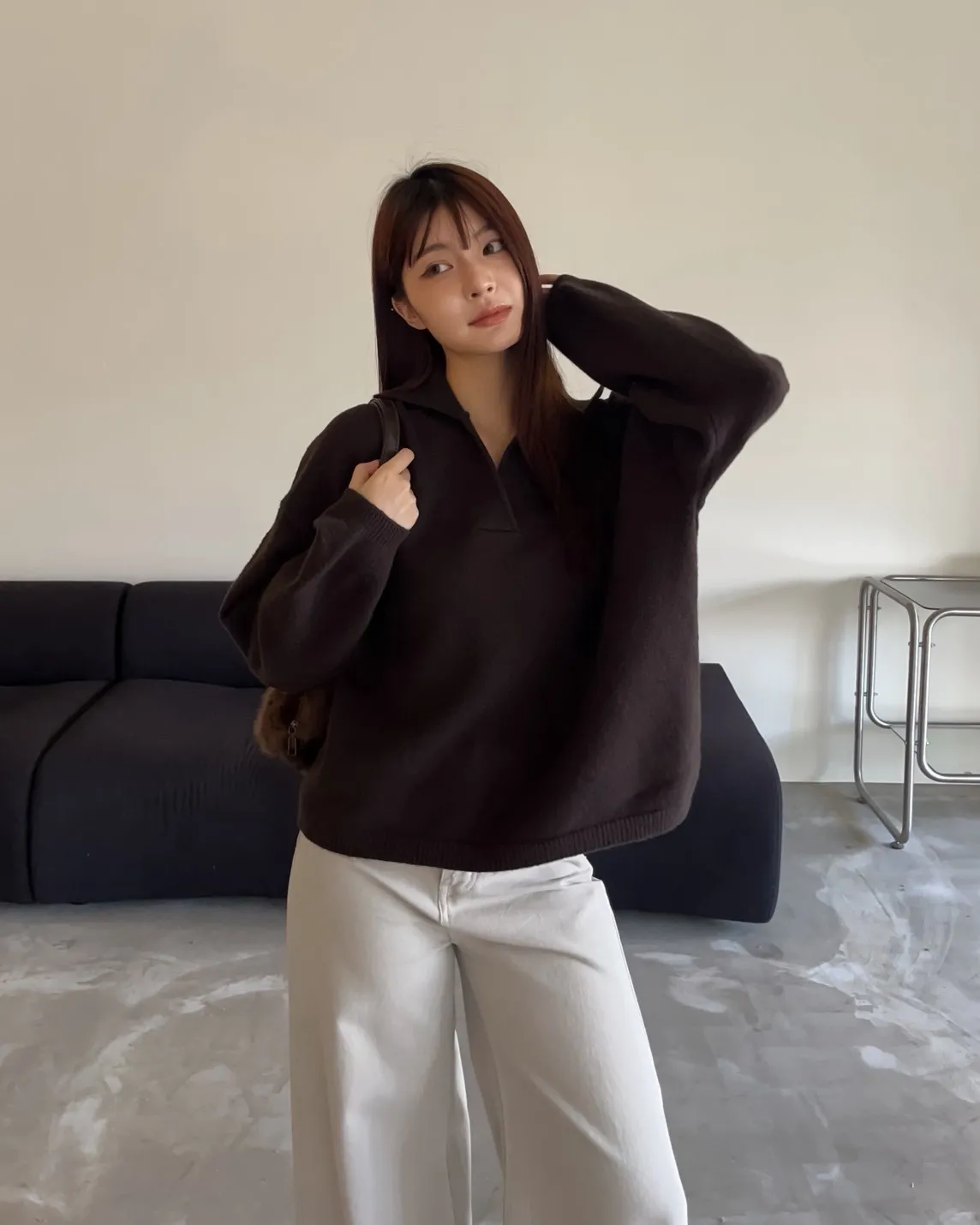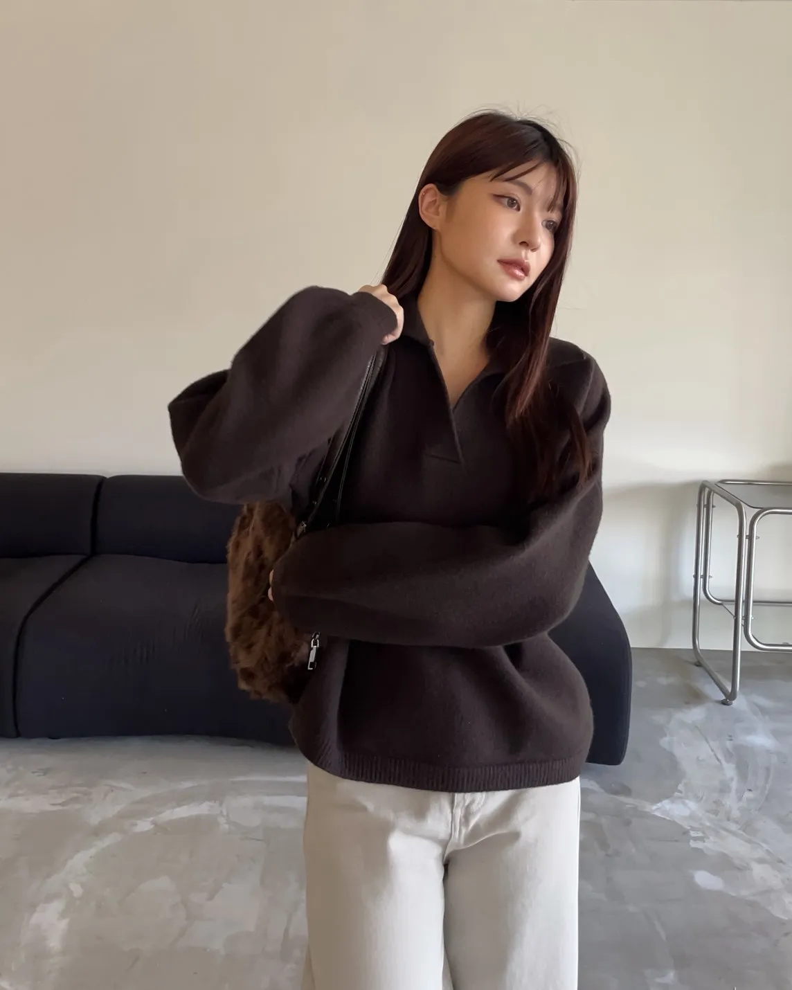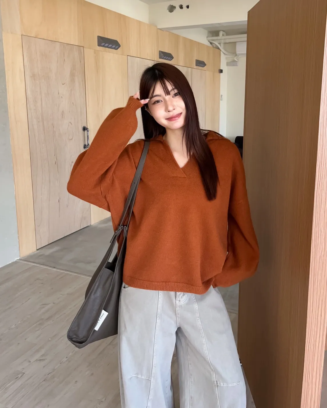 螺紋POLO領 縮口澎澎袖 寬鬆落肩 顏色可愛! 有厚度毛衣