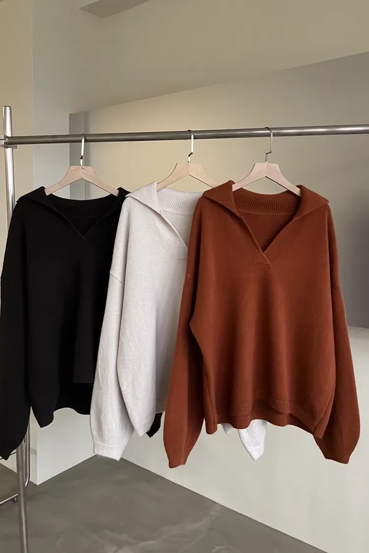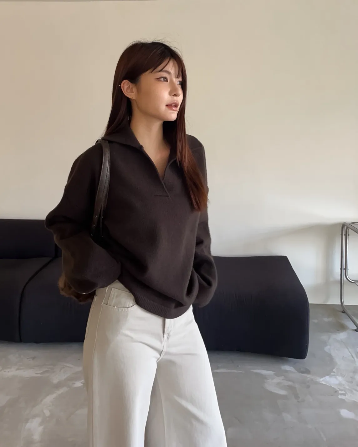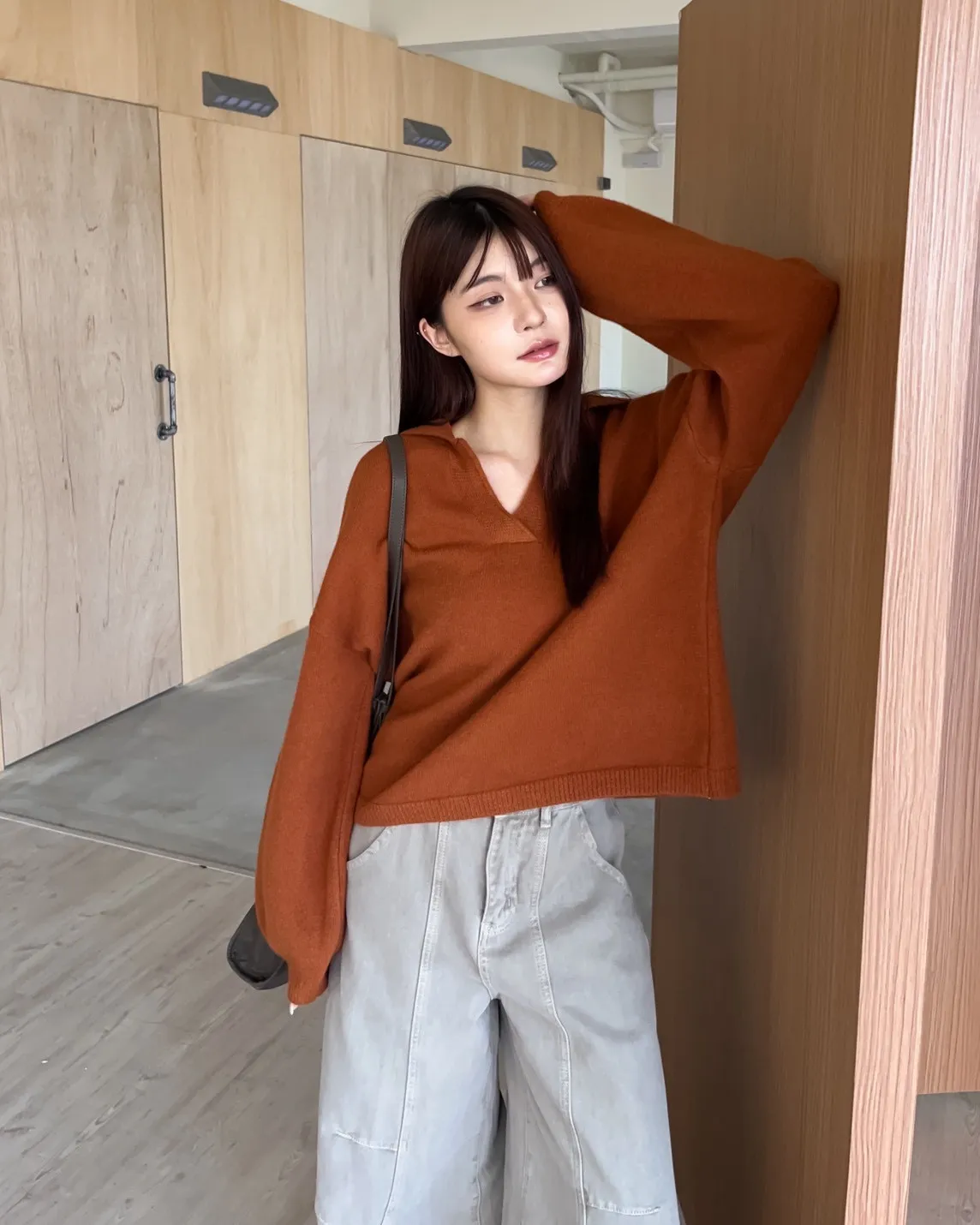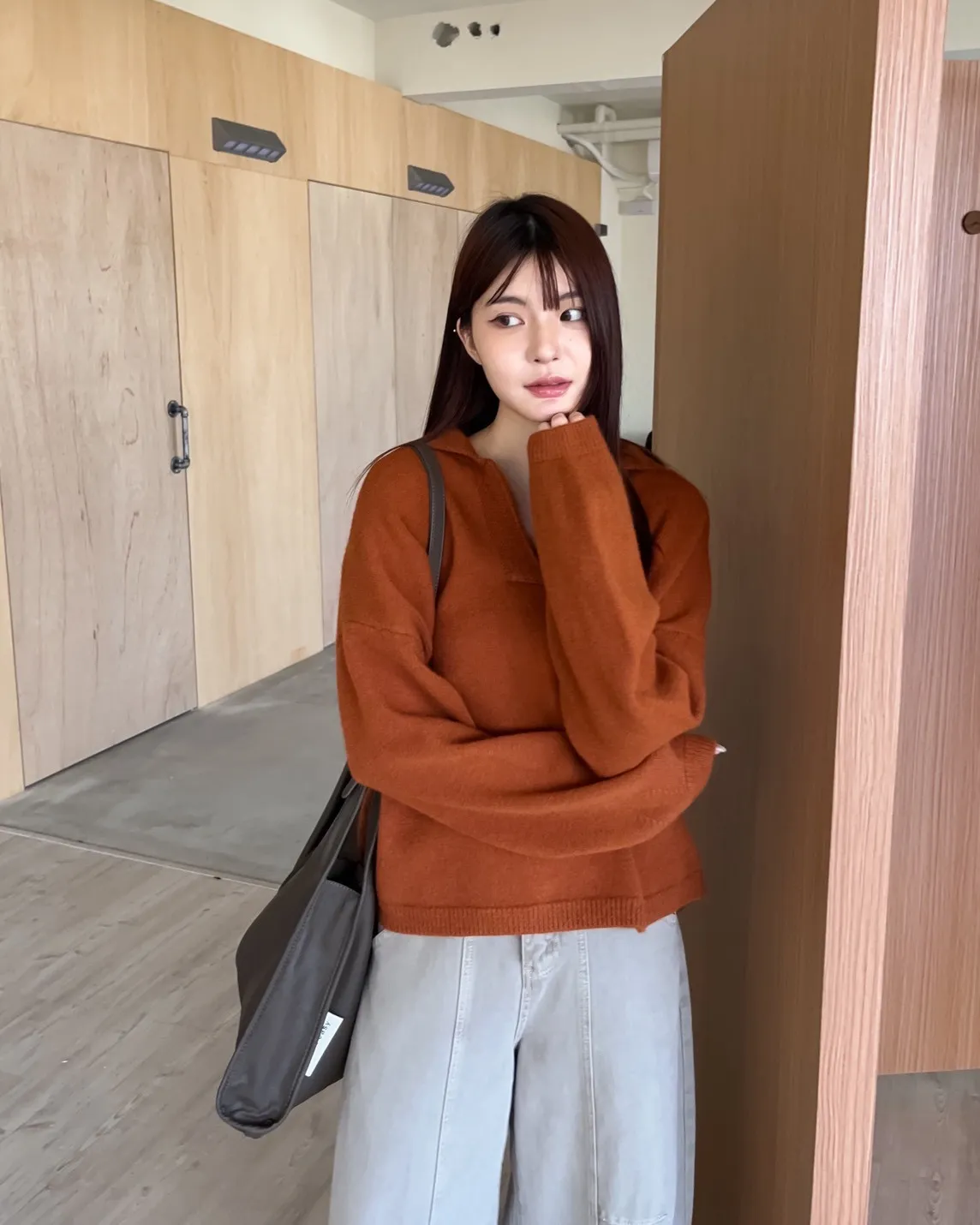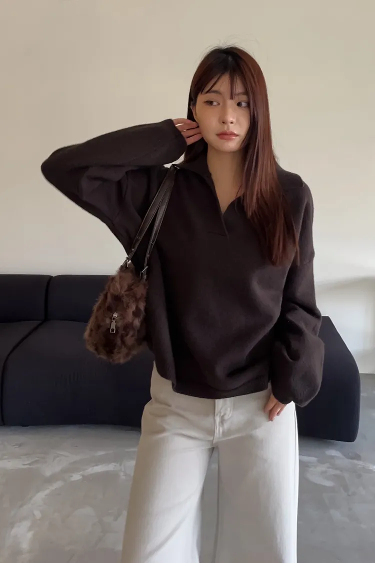 螺紋POLO領 縮口澎澎袖 寬鬆落肩 顏色可愛! 有厚度毛衣