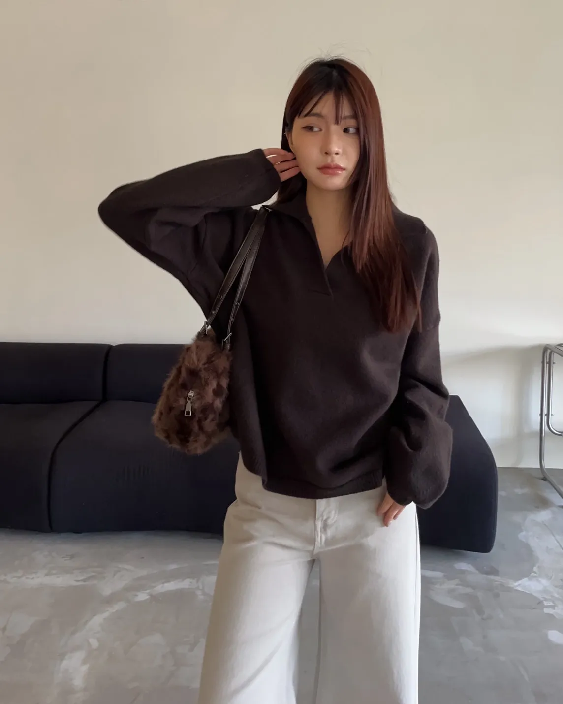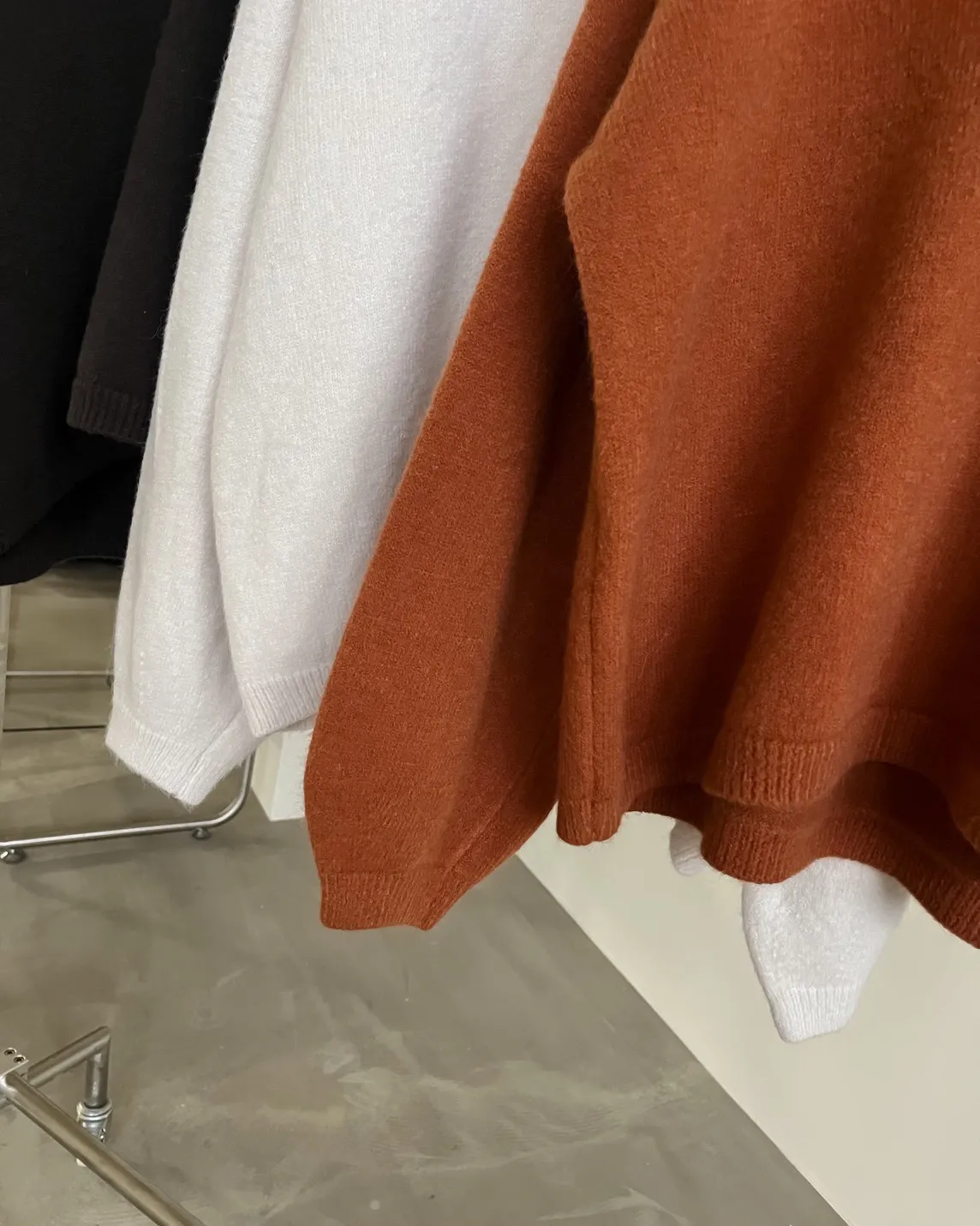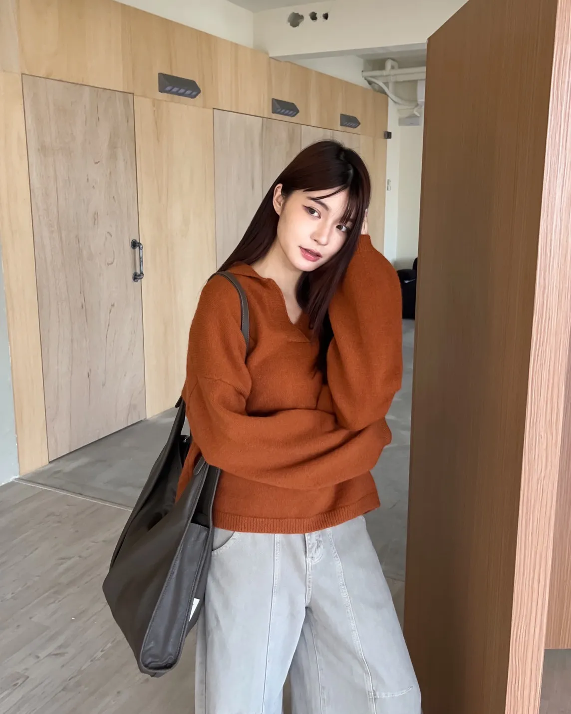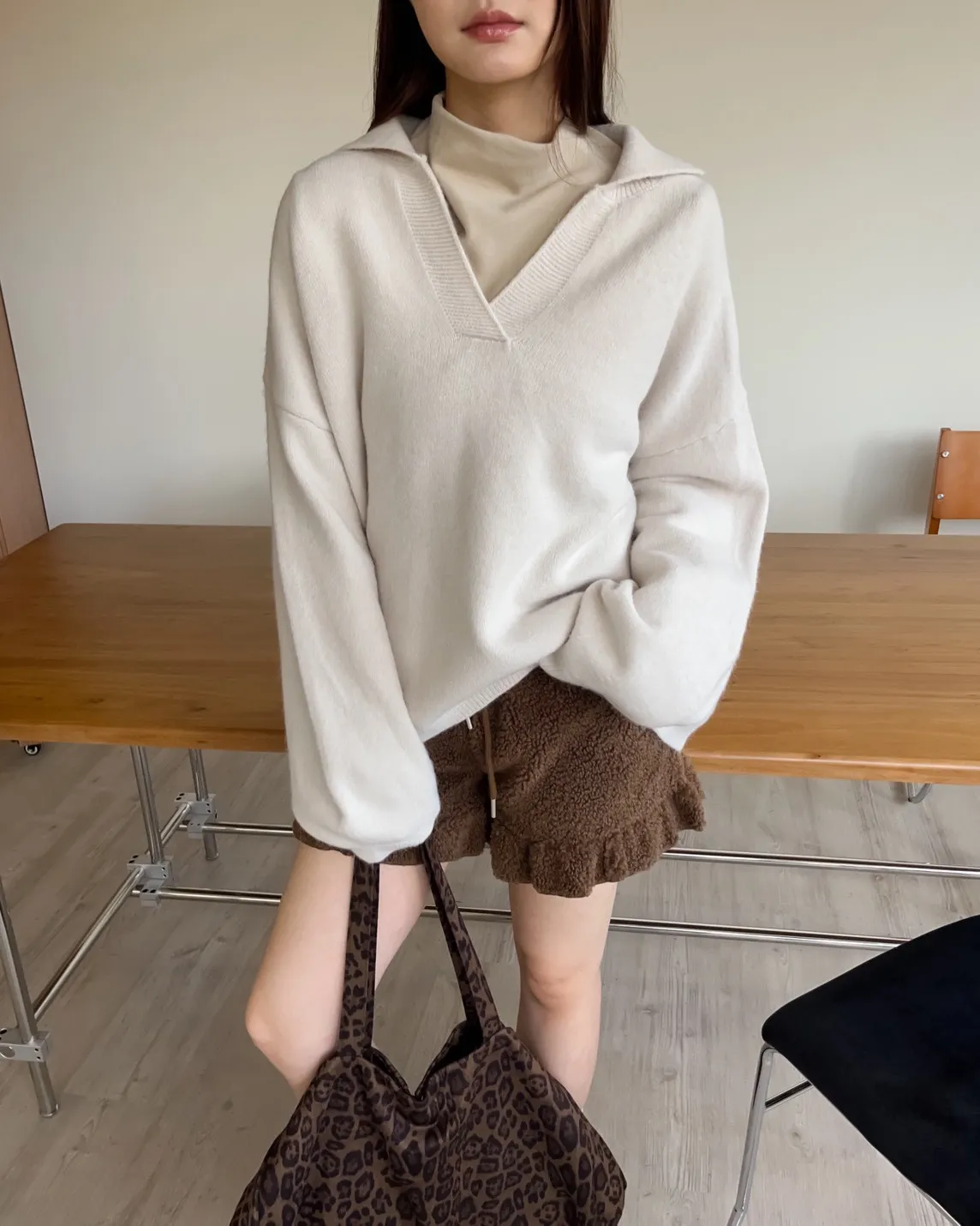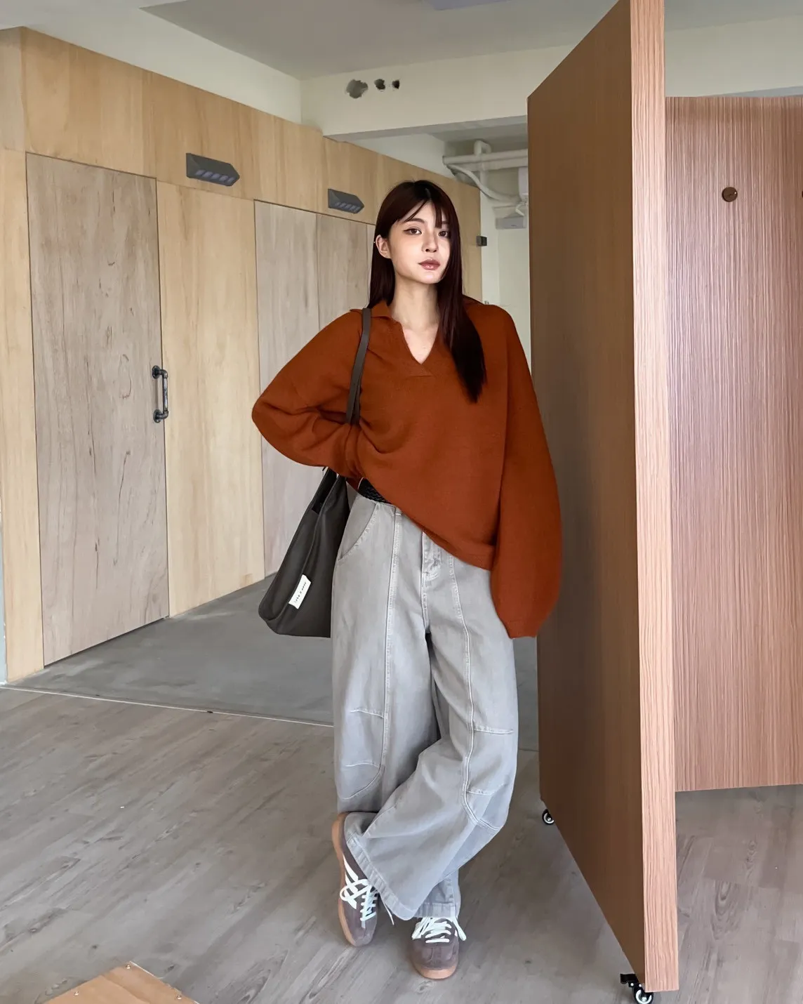 螺紋POLO領 縮口澎澎袖 寬鬆落肩 顏色可愛! 有厚度毛衣