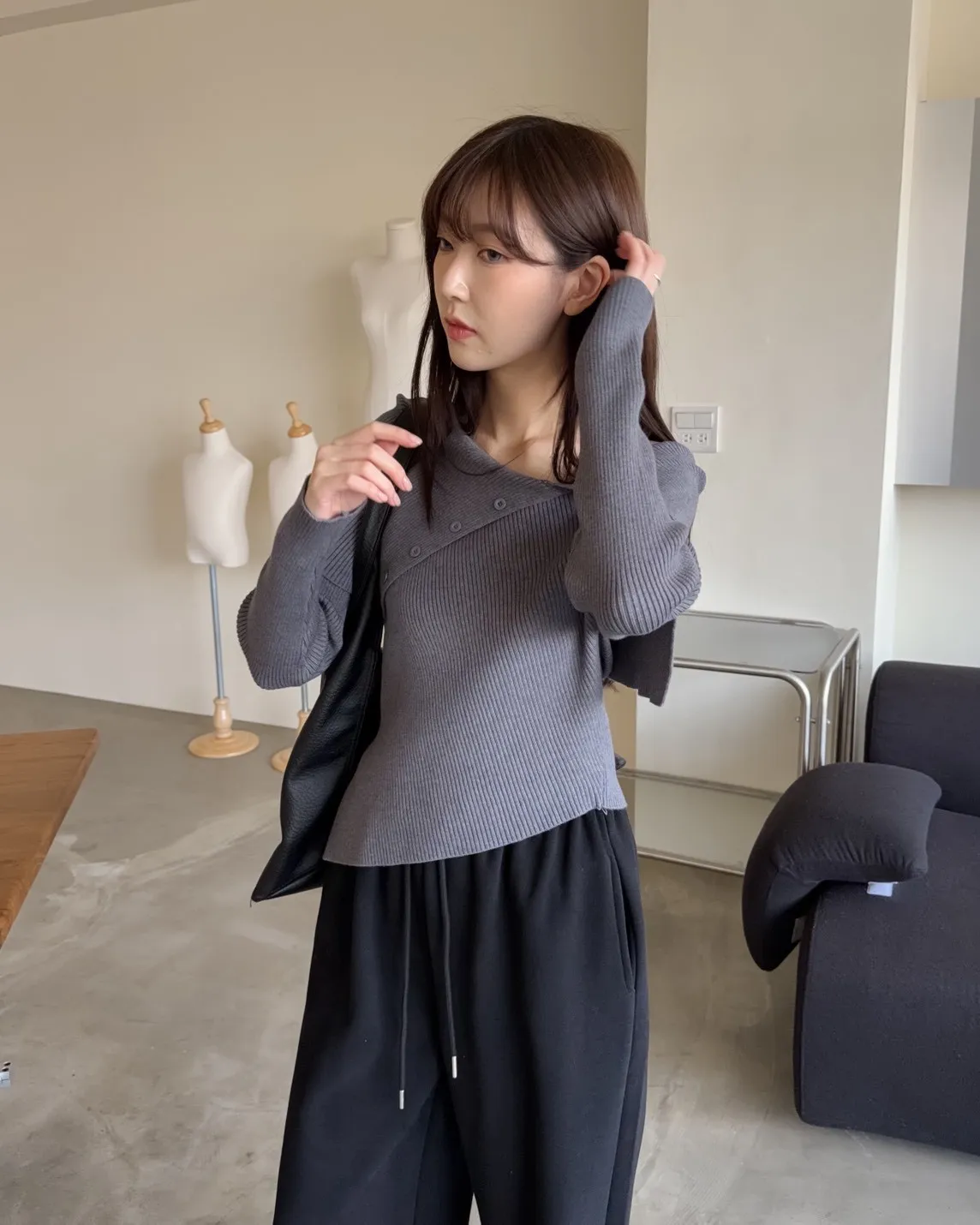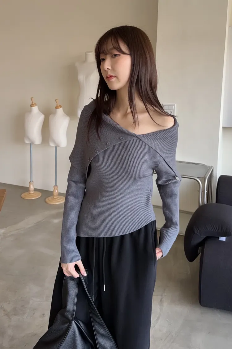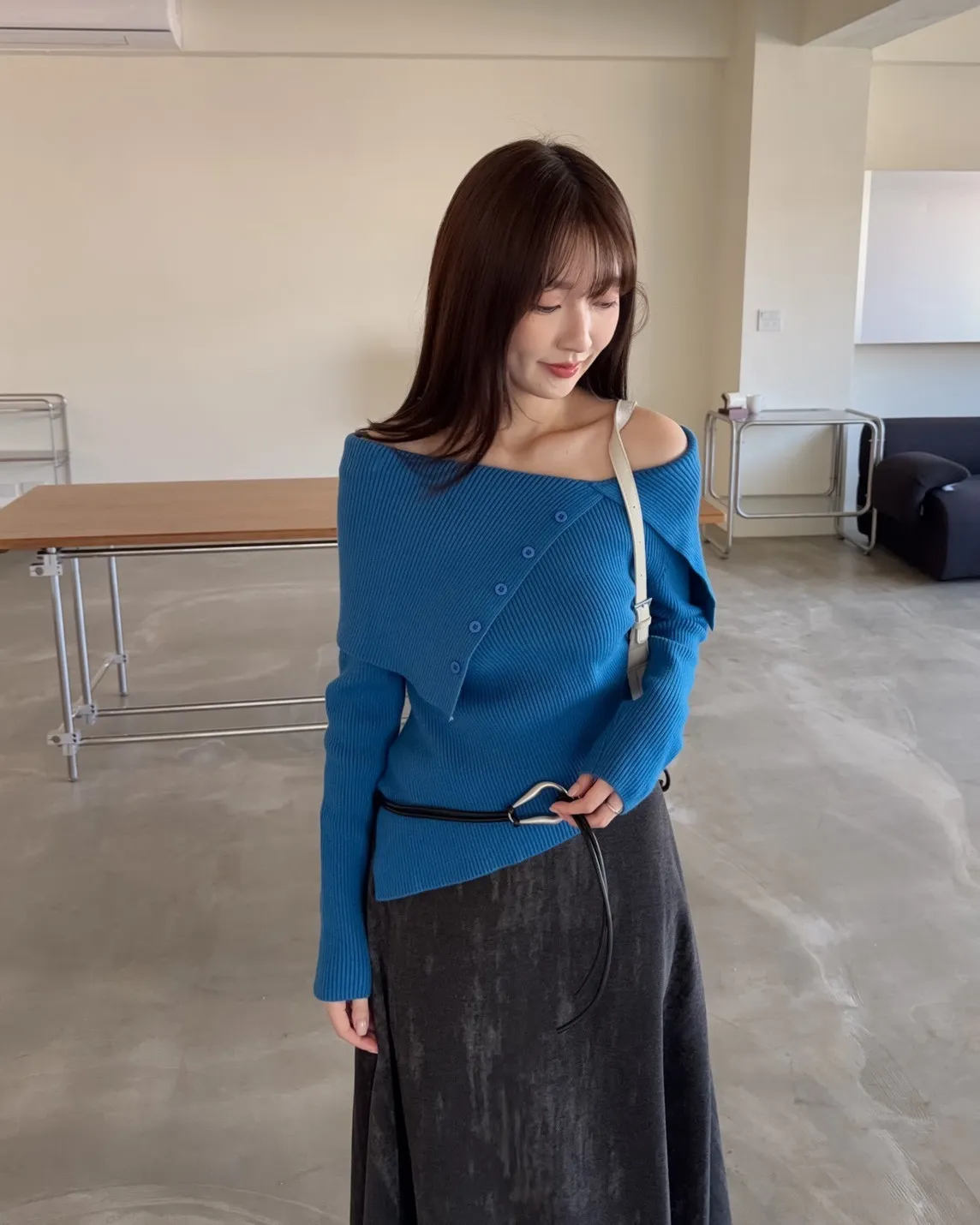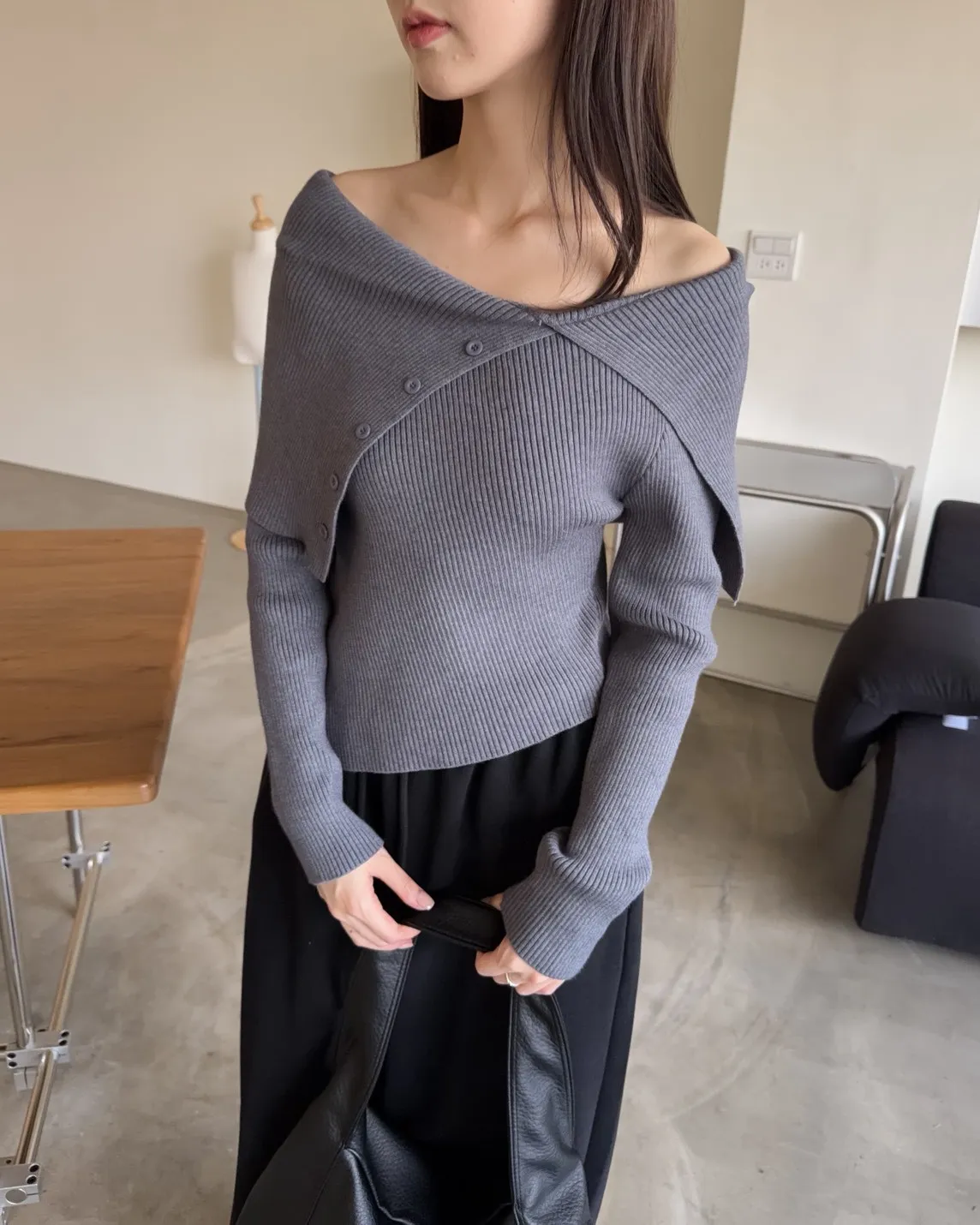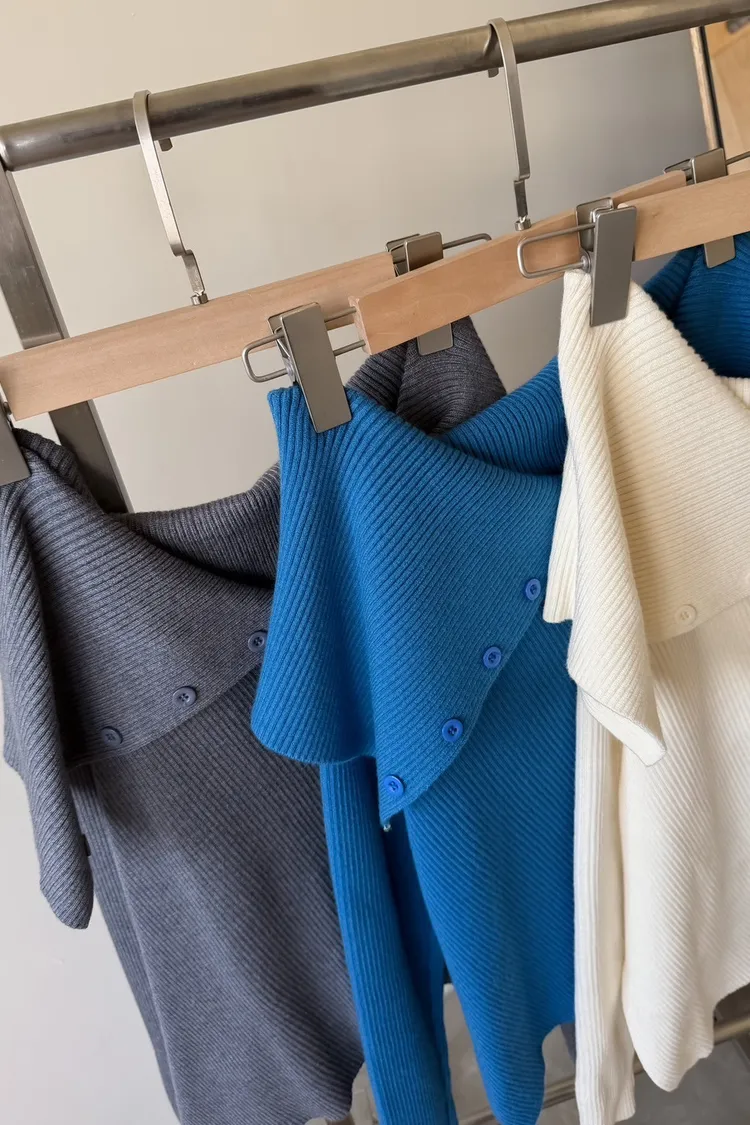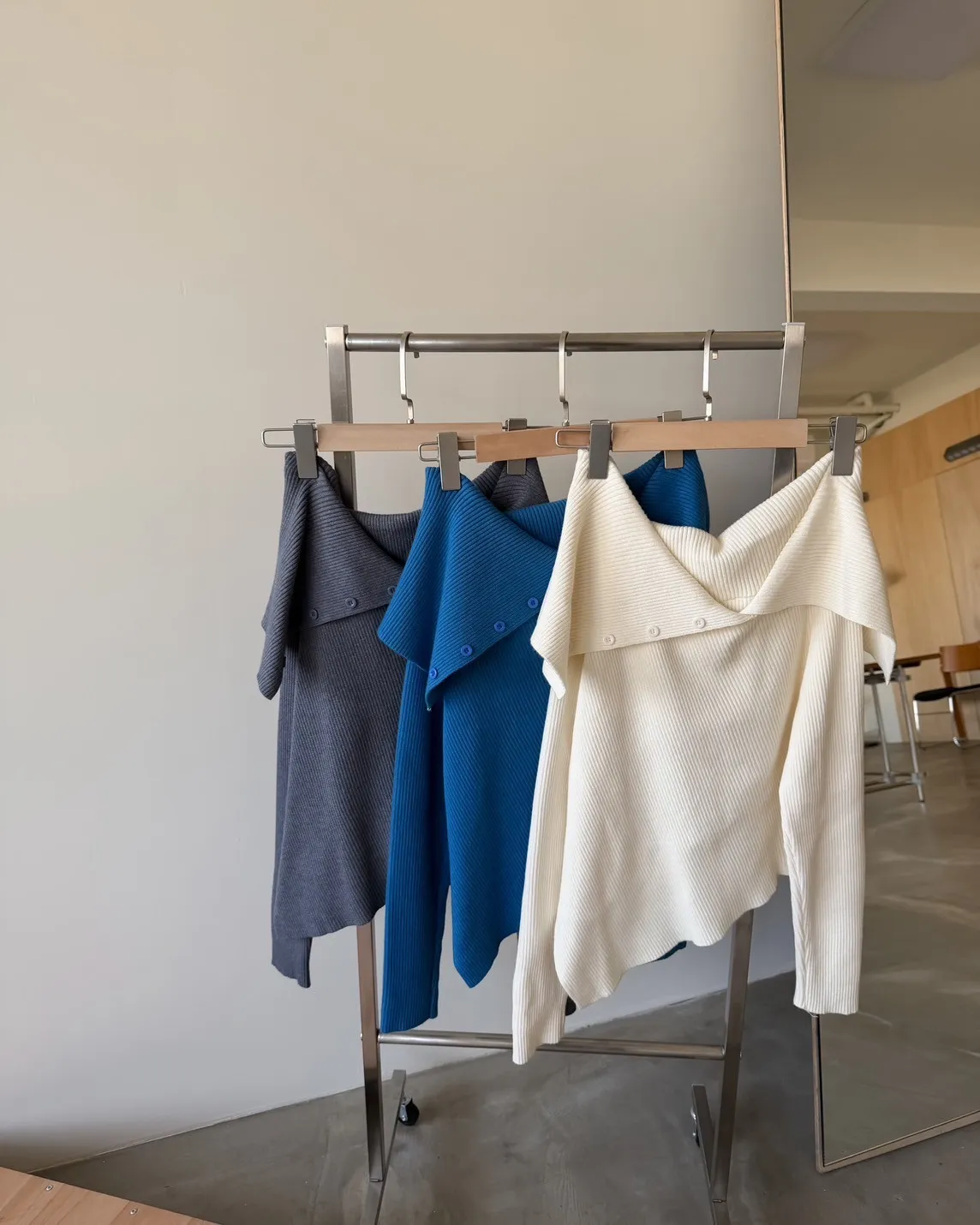 翻折一字領 斜扣裝飾 下擺斜口 坑紋針織