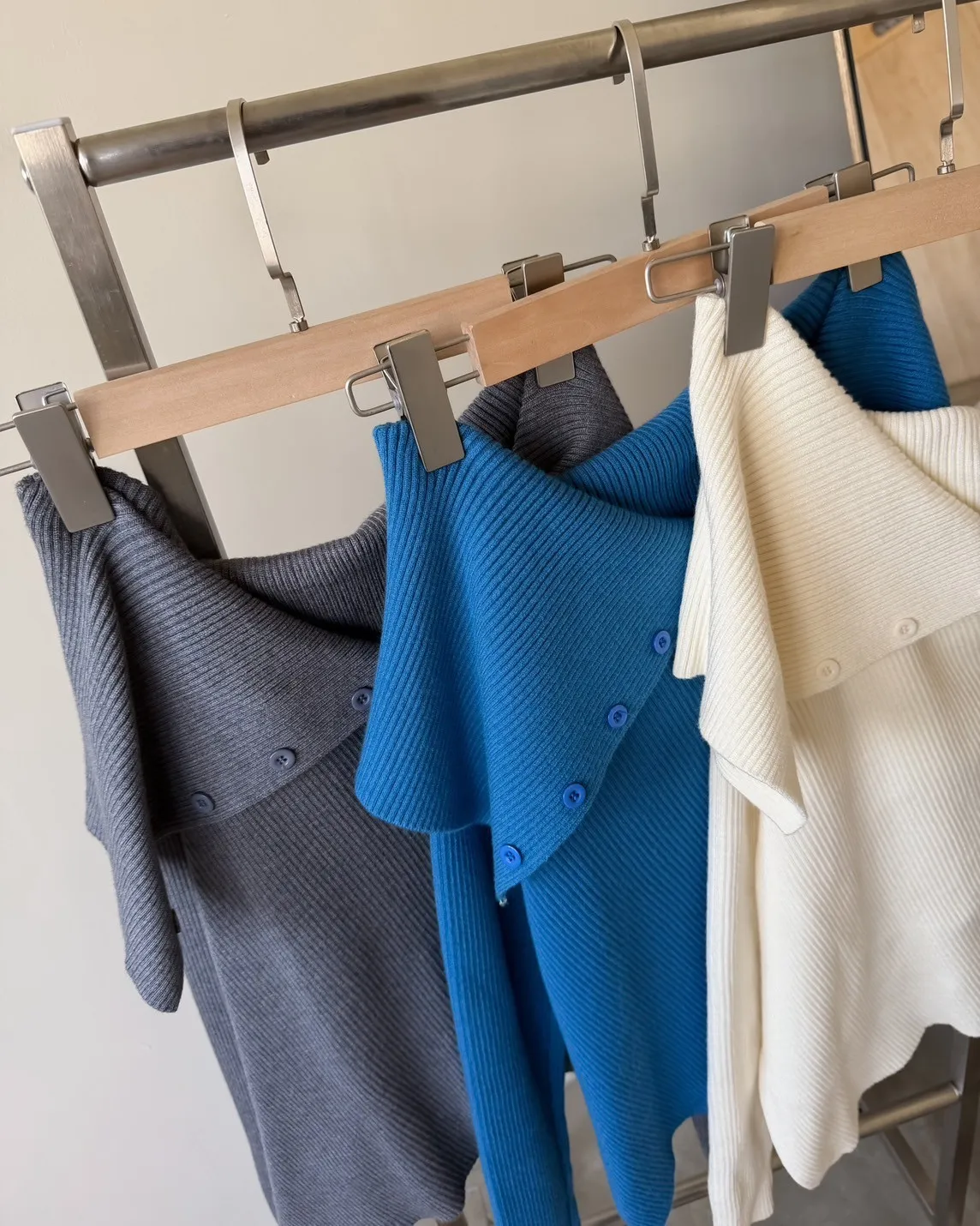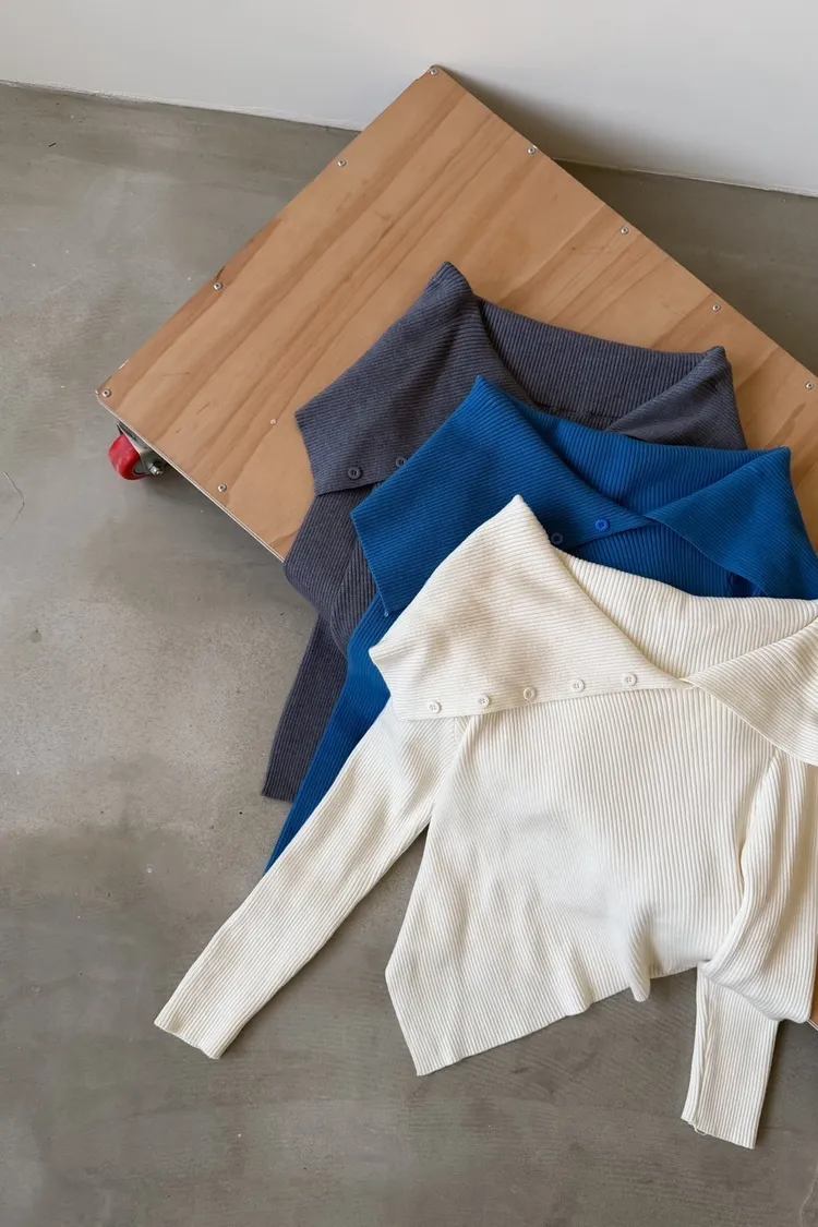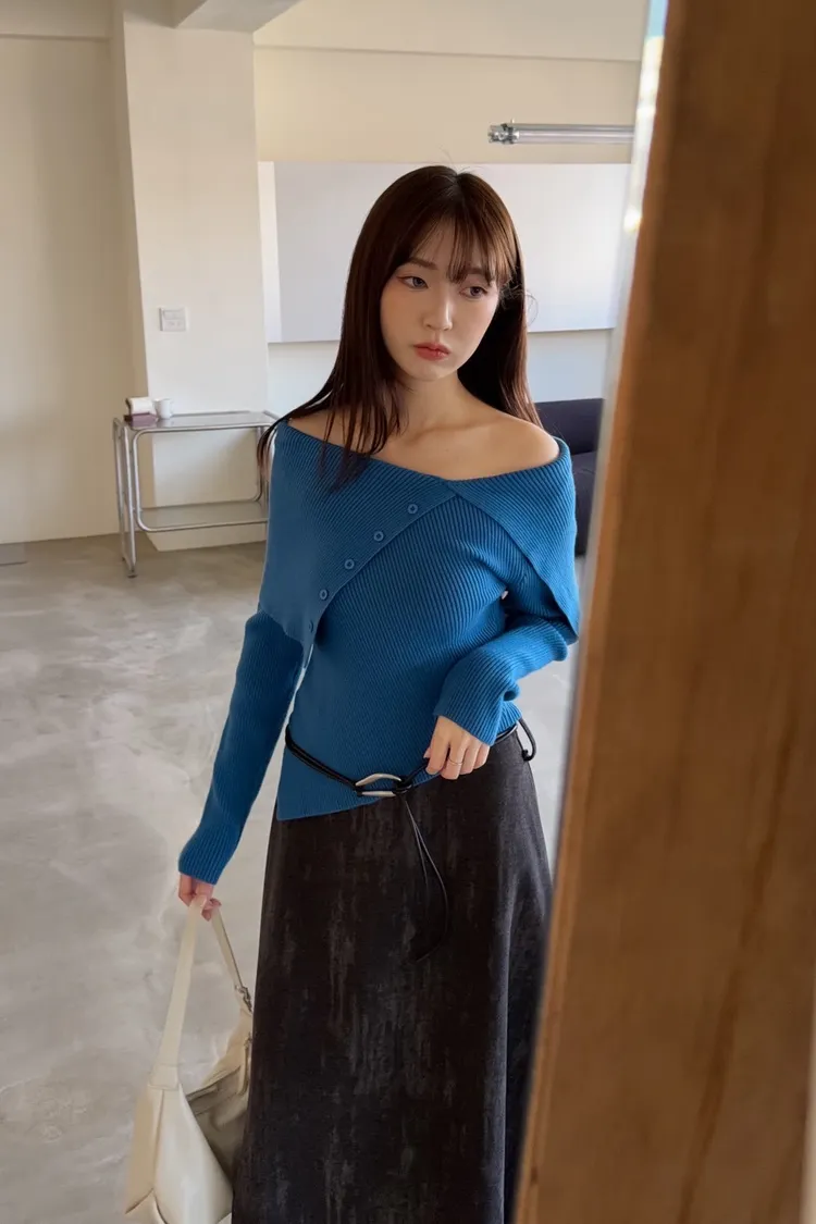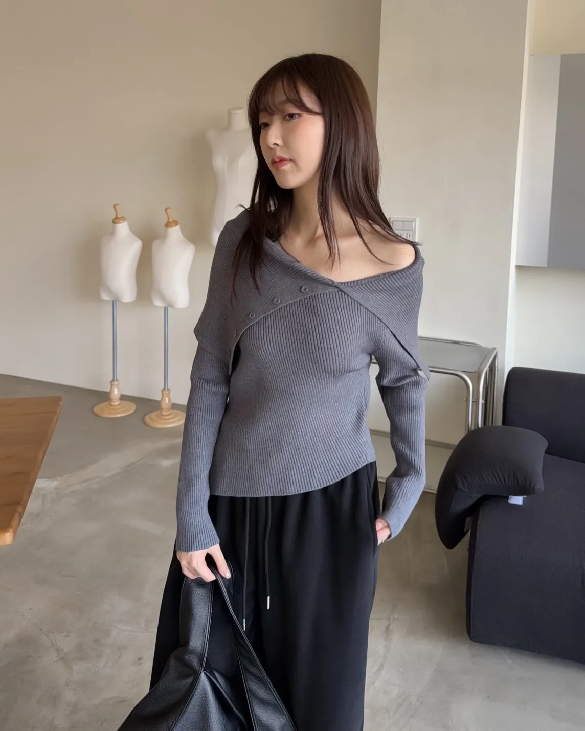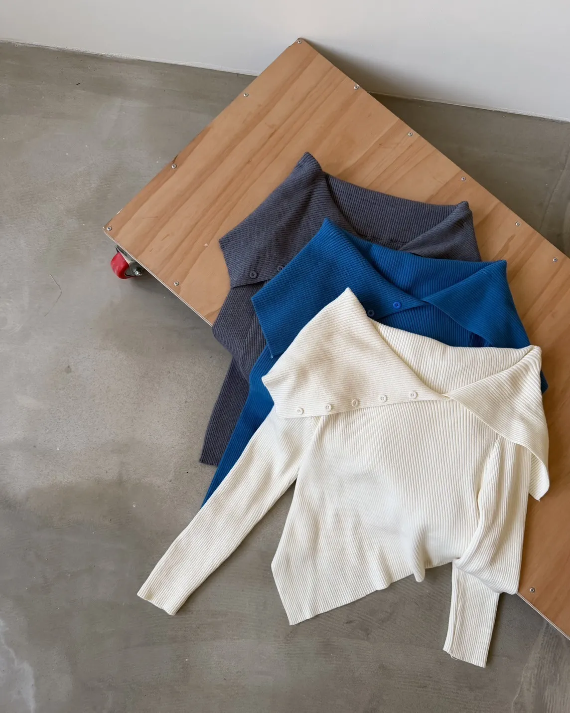 翻折一字領 斜扣裝飾 下擺斜口 坑紋針織