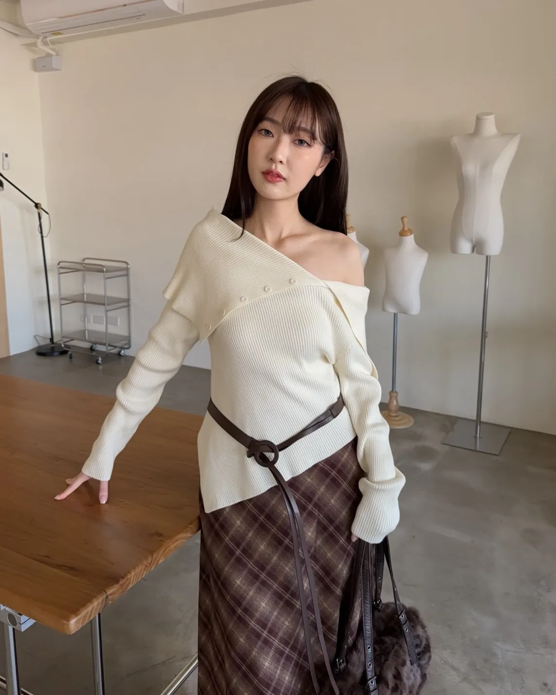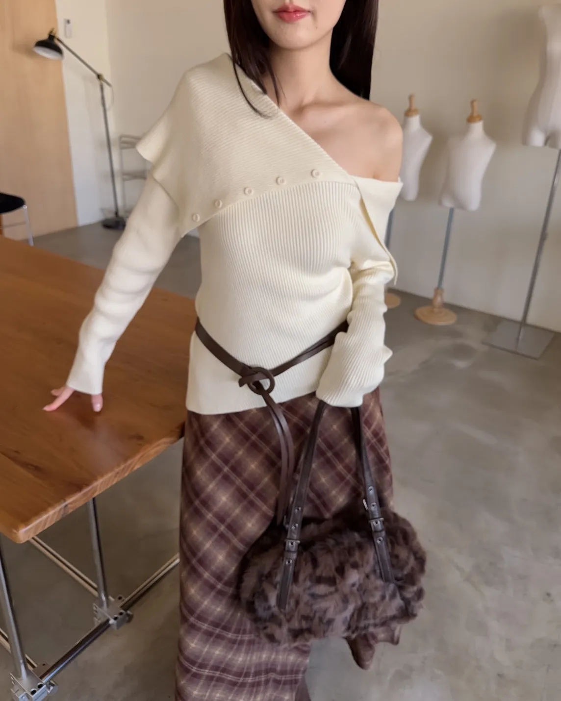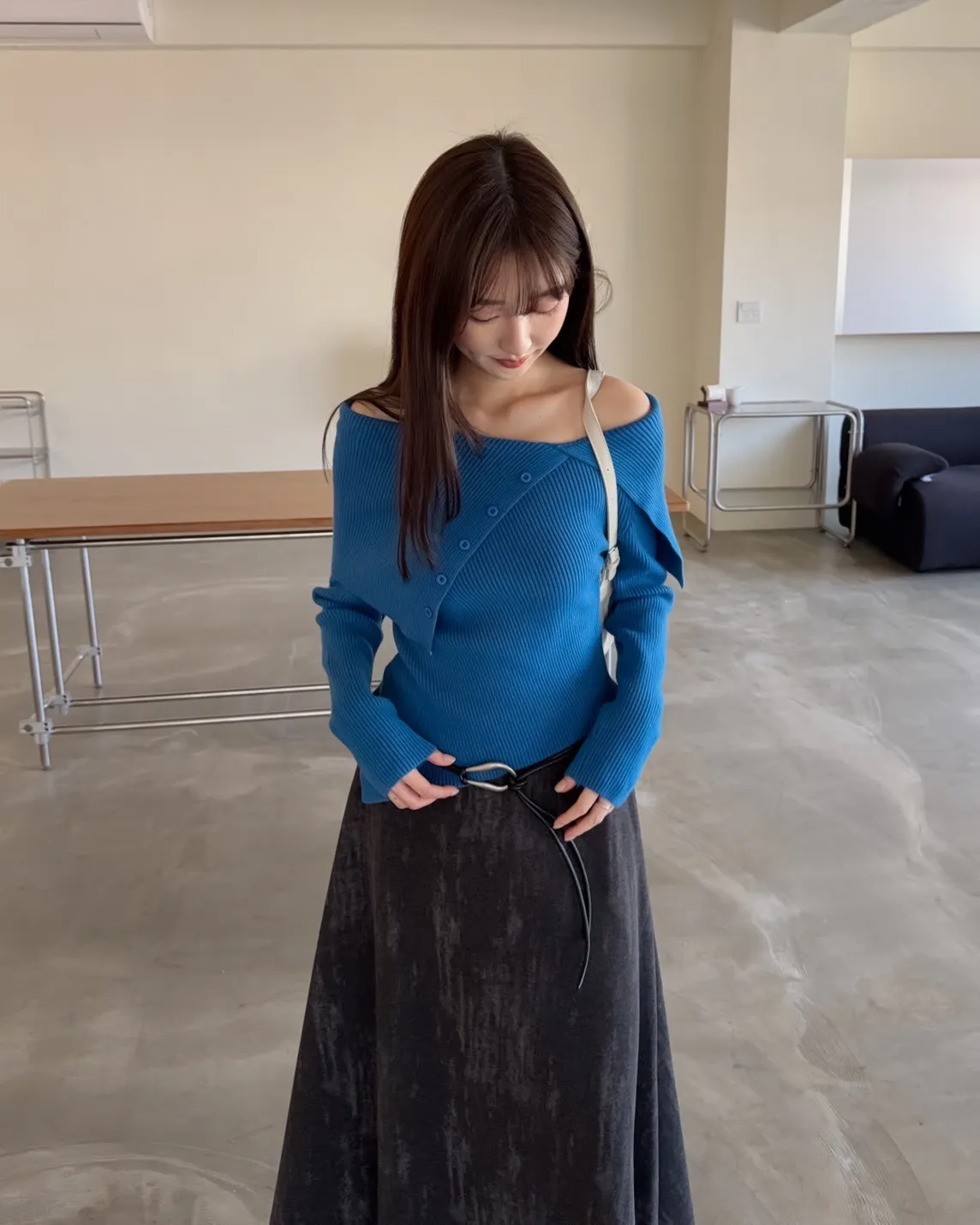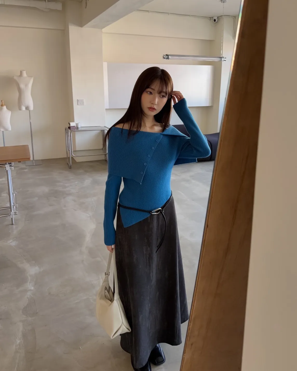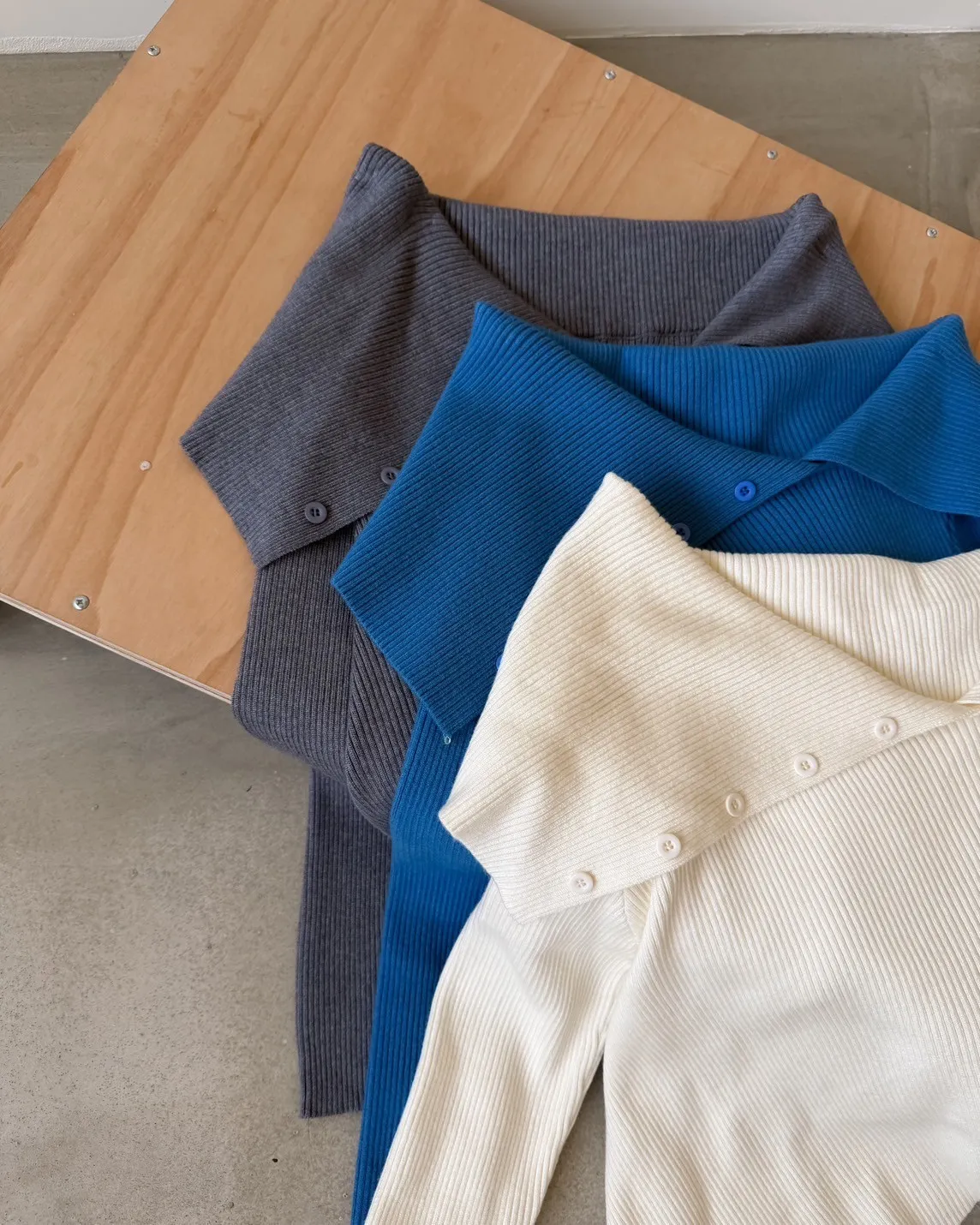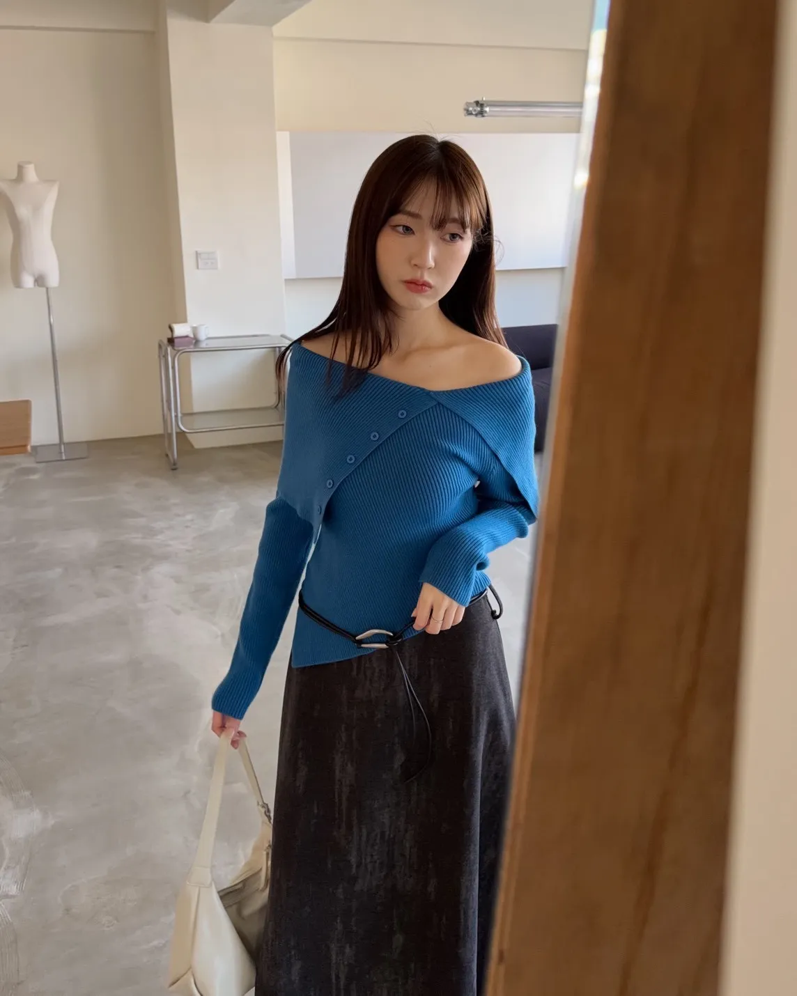 翻折一字領 斜扣裝飾 下擺斜口 坑紋針織