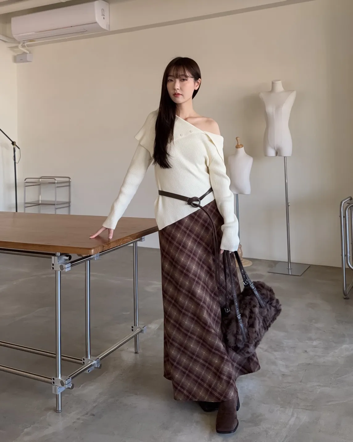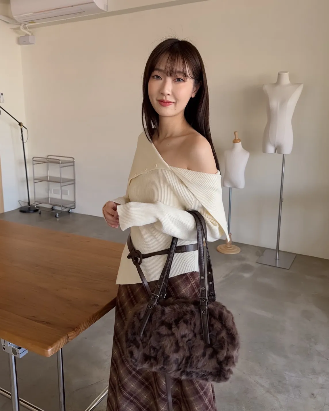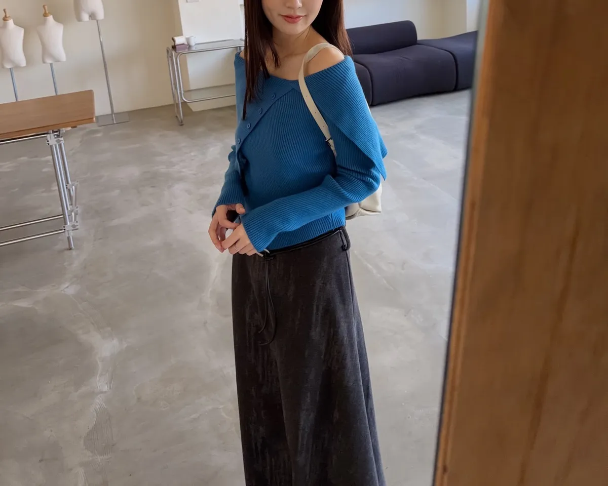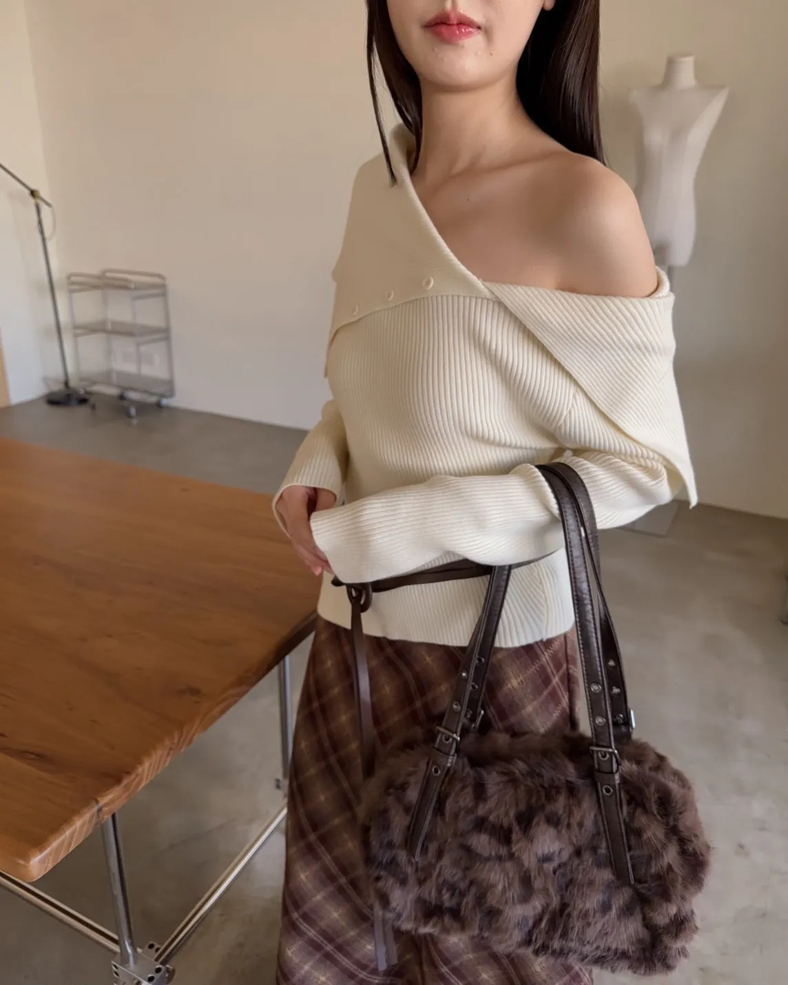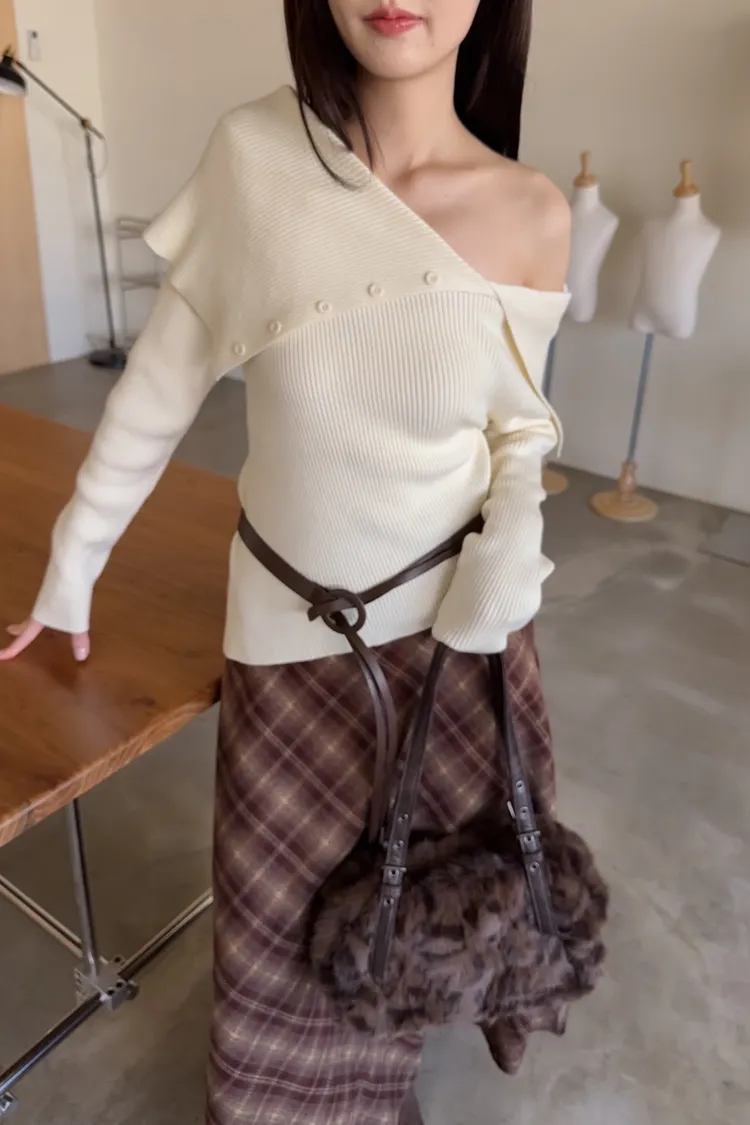 翻折一字領 斜扣裝飾 下擺斜口 坑紋針織