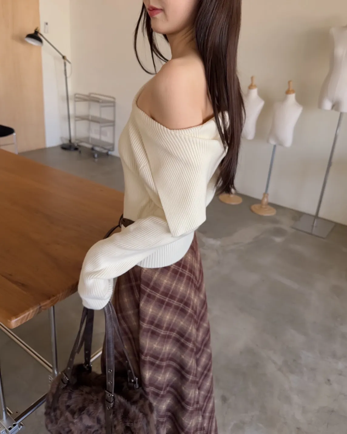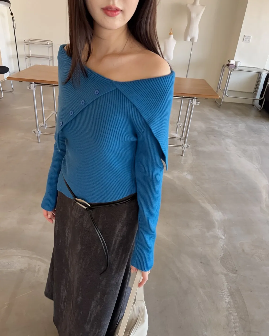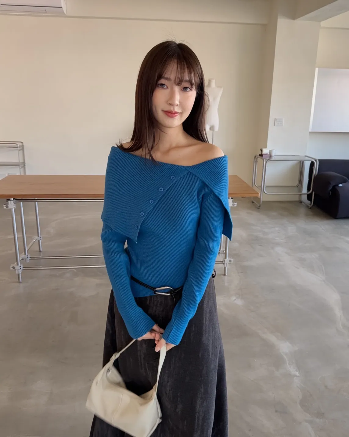 W0063翻折一字領斜口針織上衣(米/寶藍/深灰)