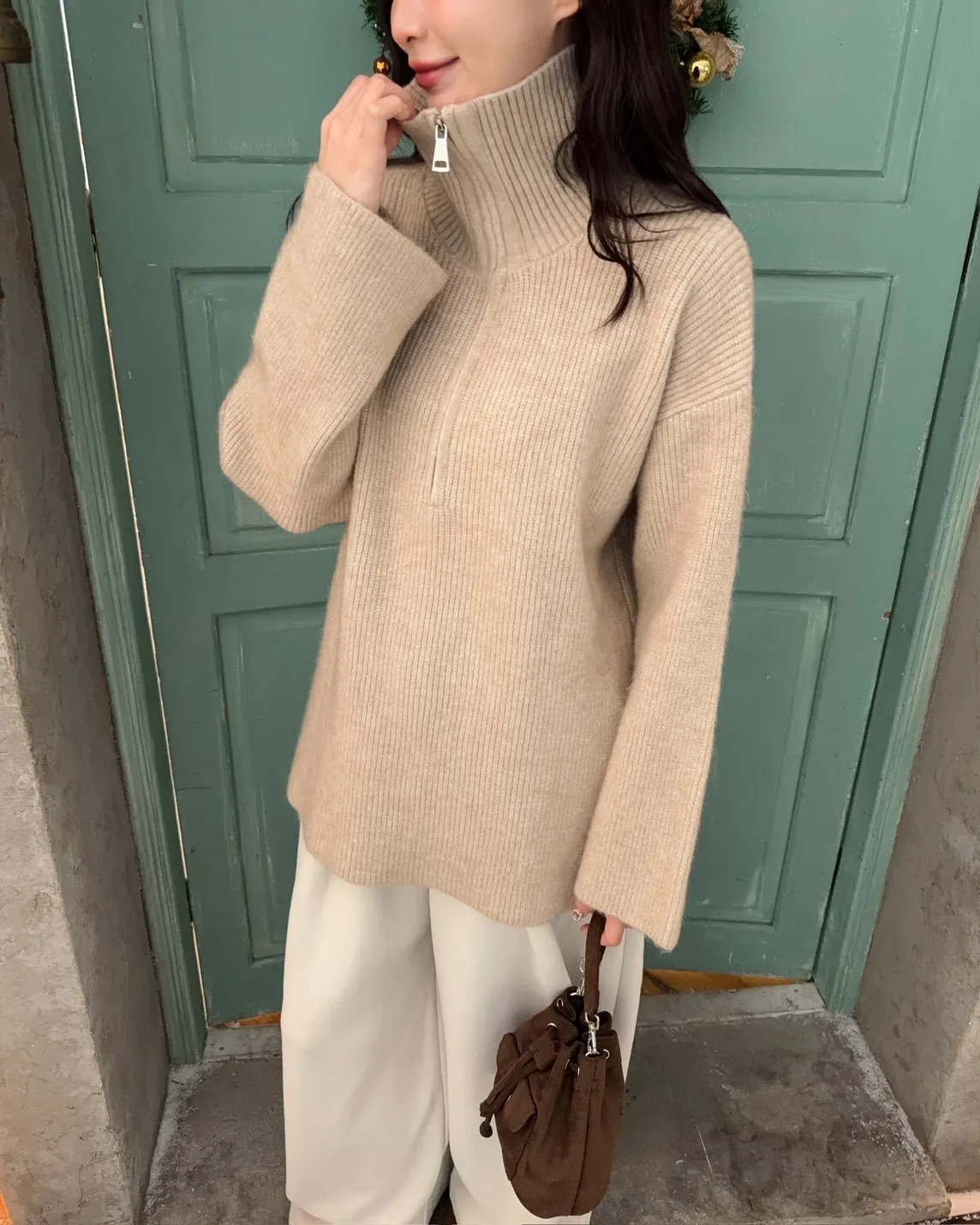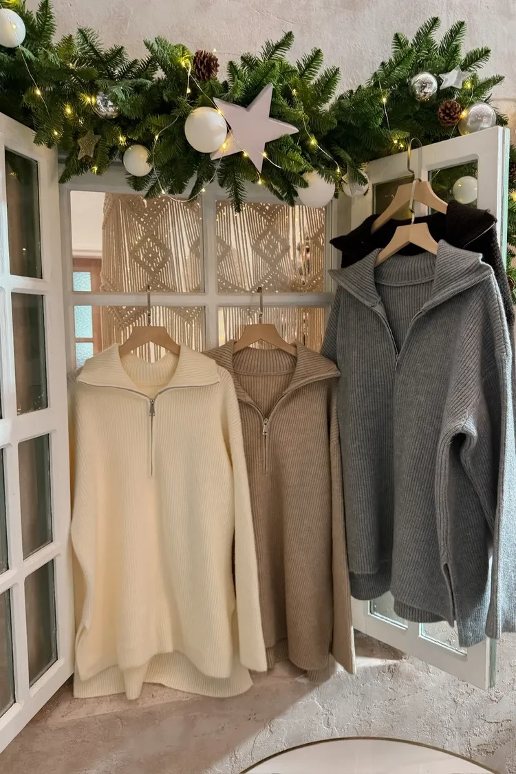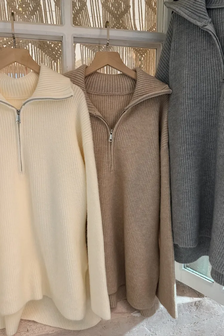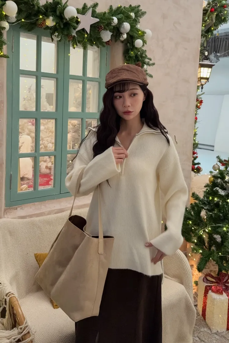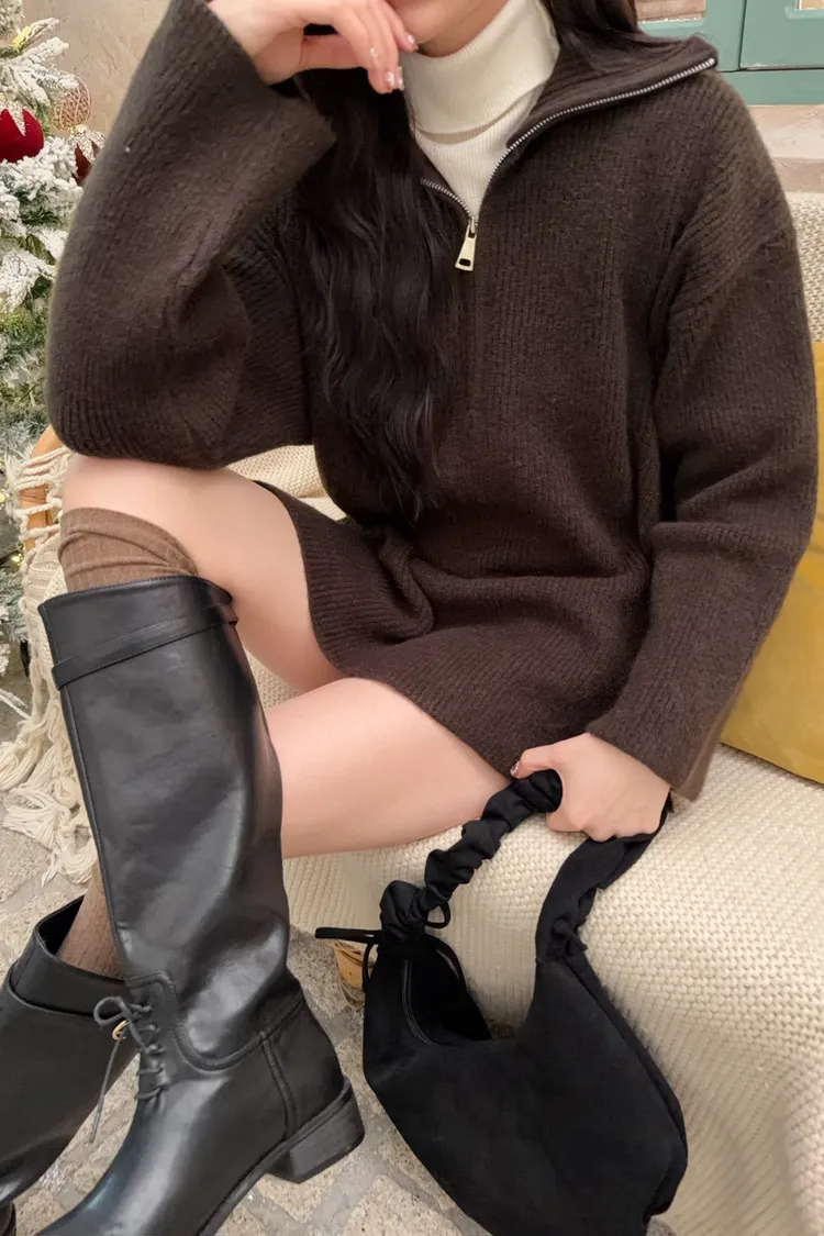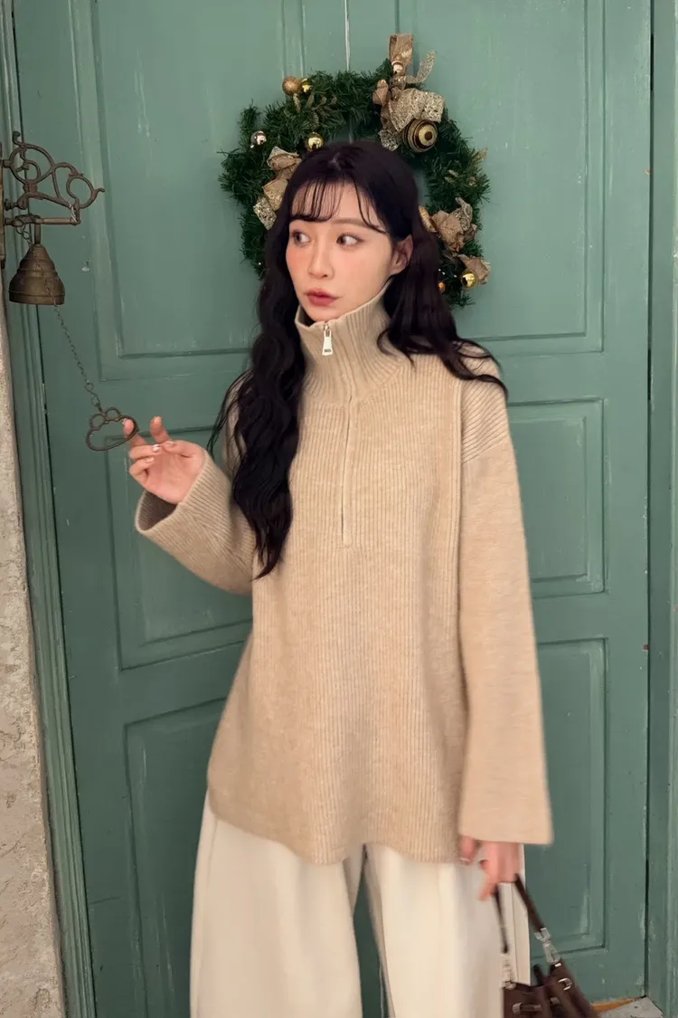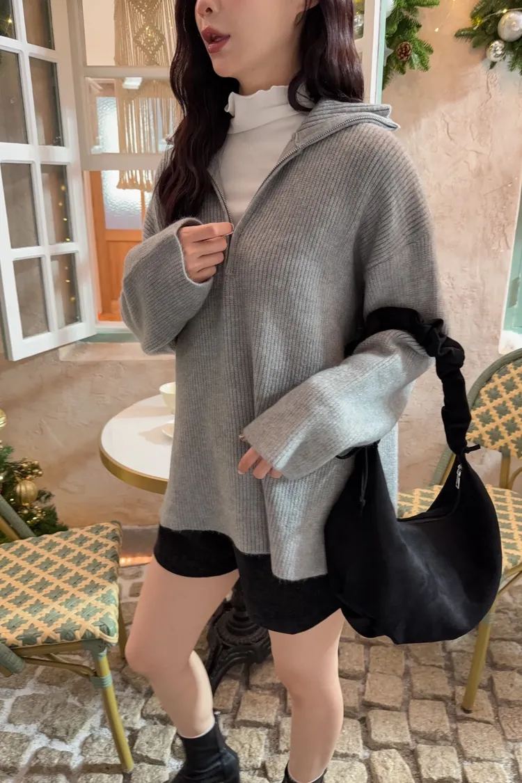 X0050遮屁屁前短後長拉鍊翻領毛衣(米白/深咖啡/奶杏/灰)