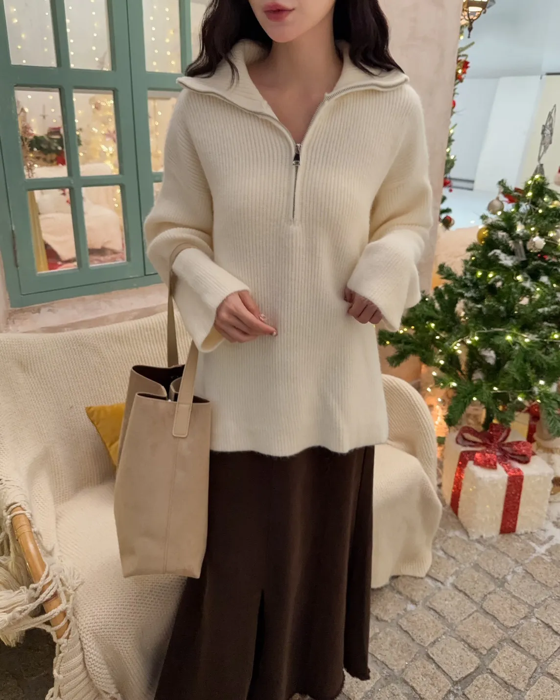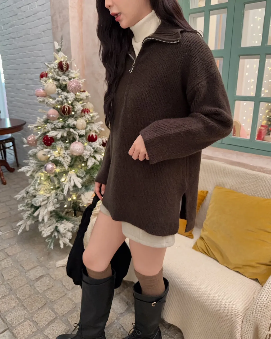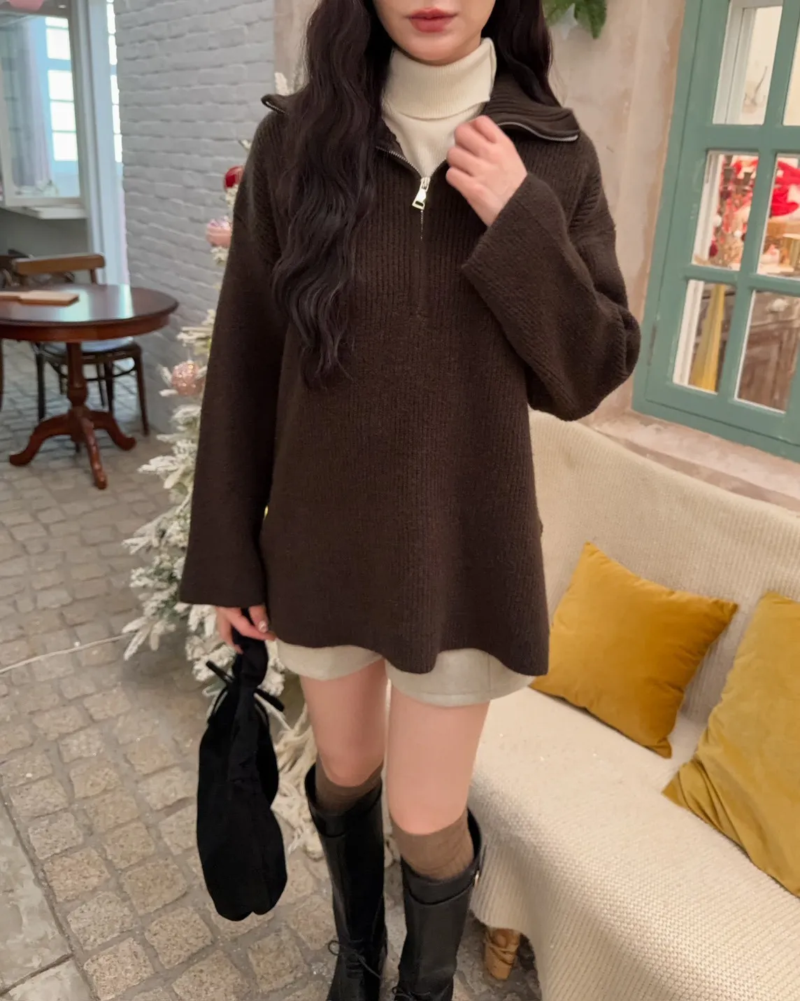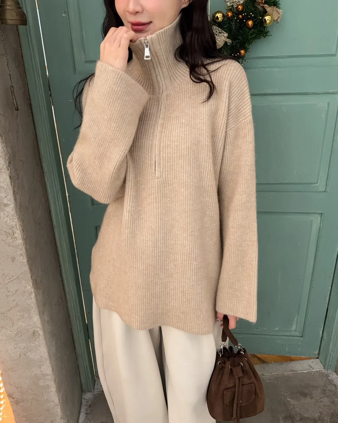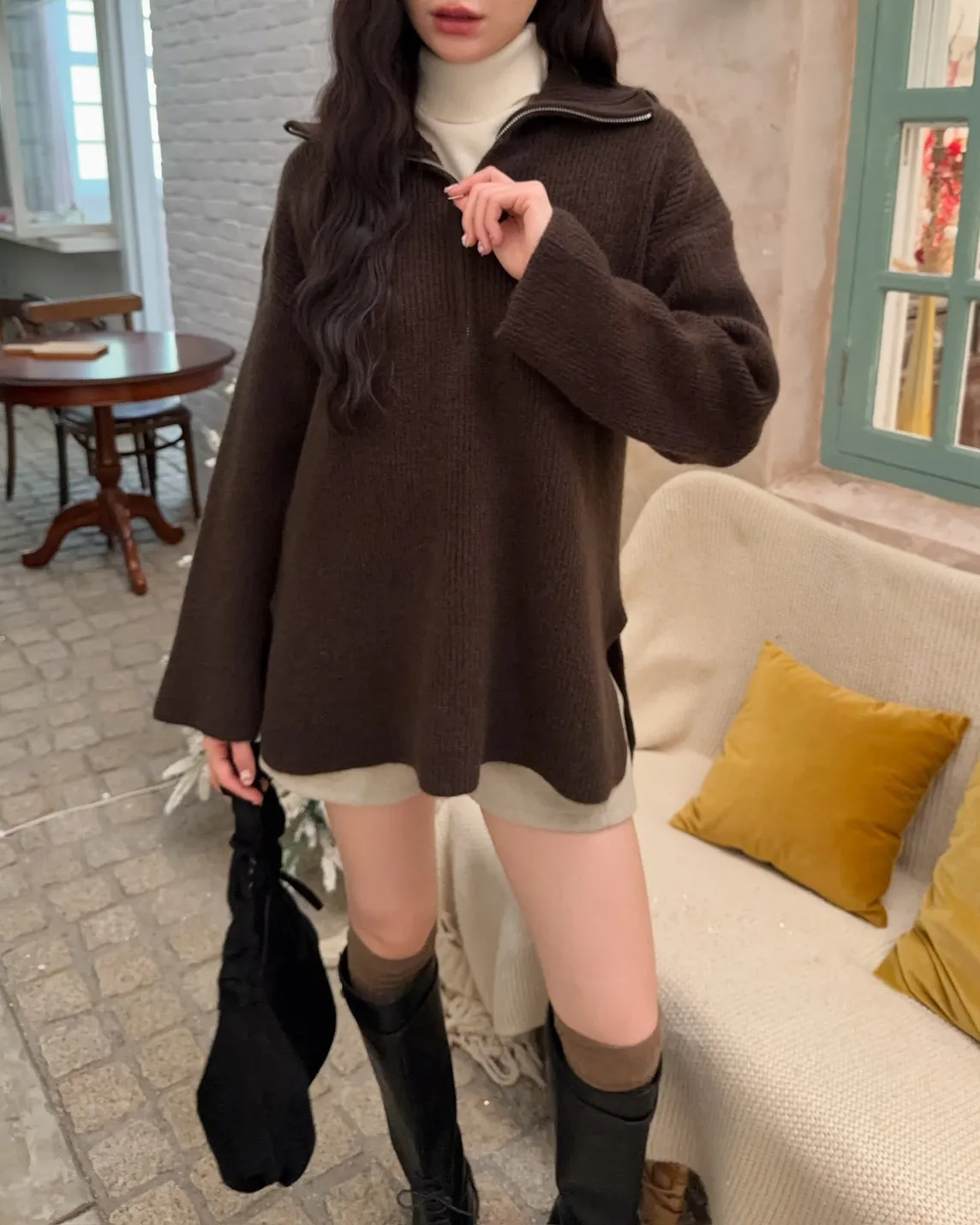 X0050遮屁屁前短後長拉鍊翻領毛衣(米白/深咖啡/奶杏/灰)