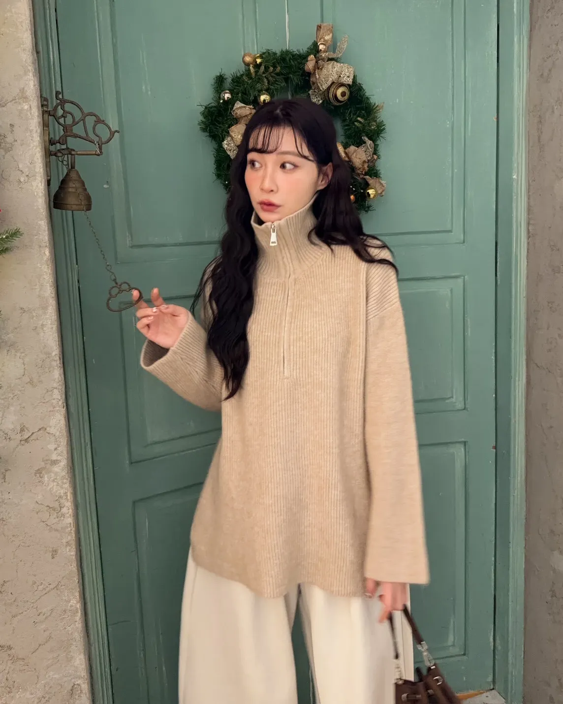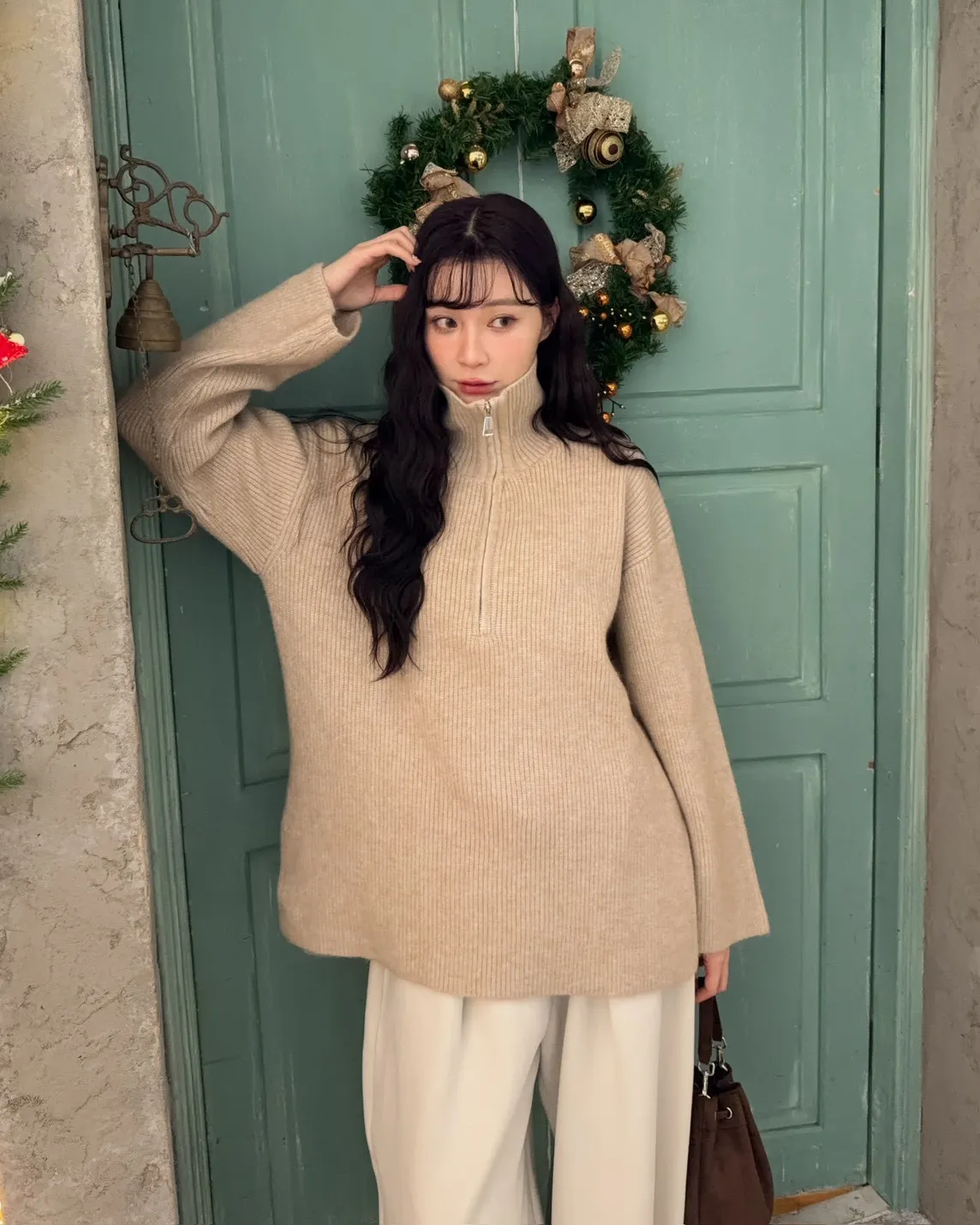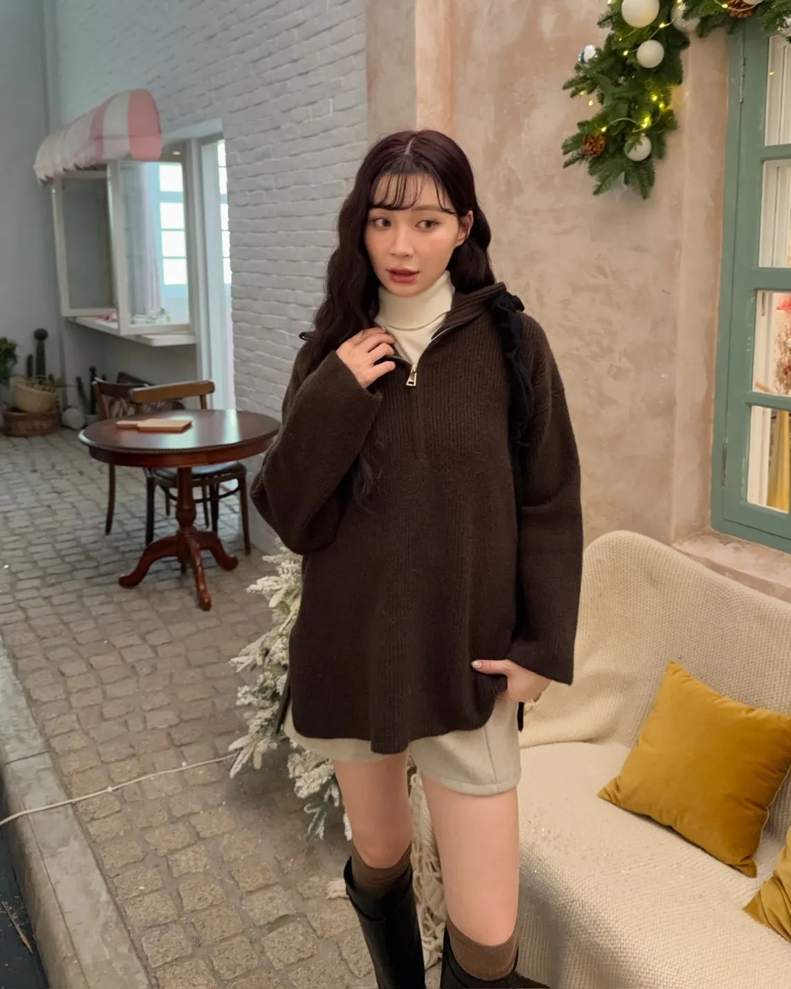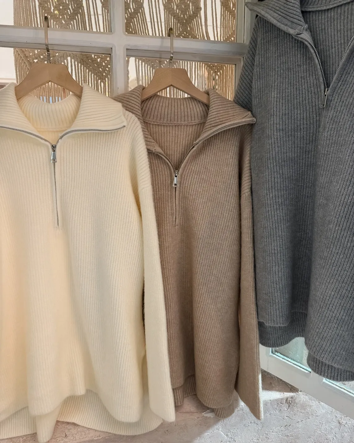 X0050遮屁屁前短後長拉鍊翻領毛衣(米白/深咖啡/奶杏/灰)