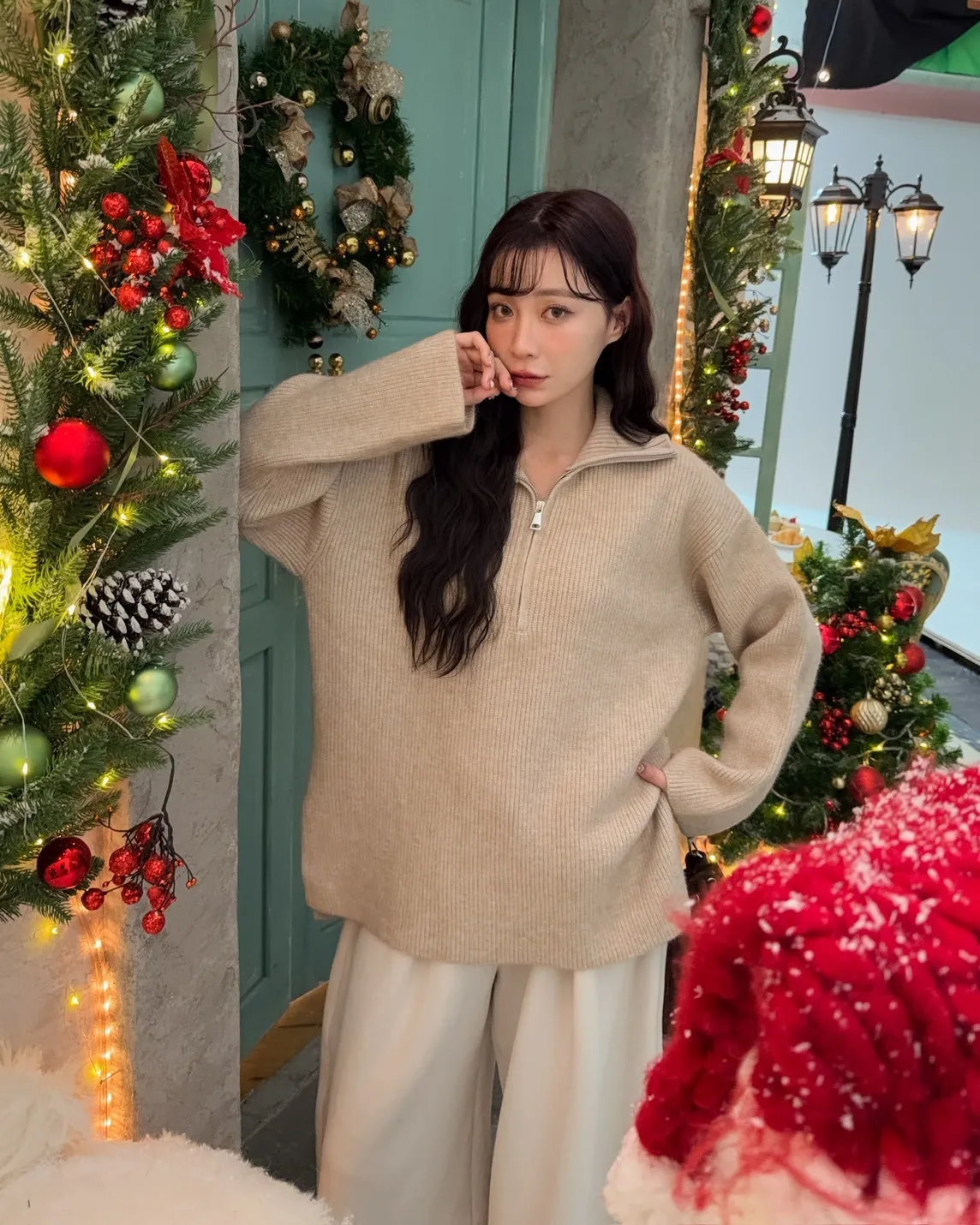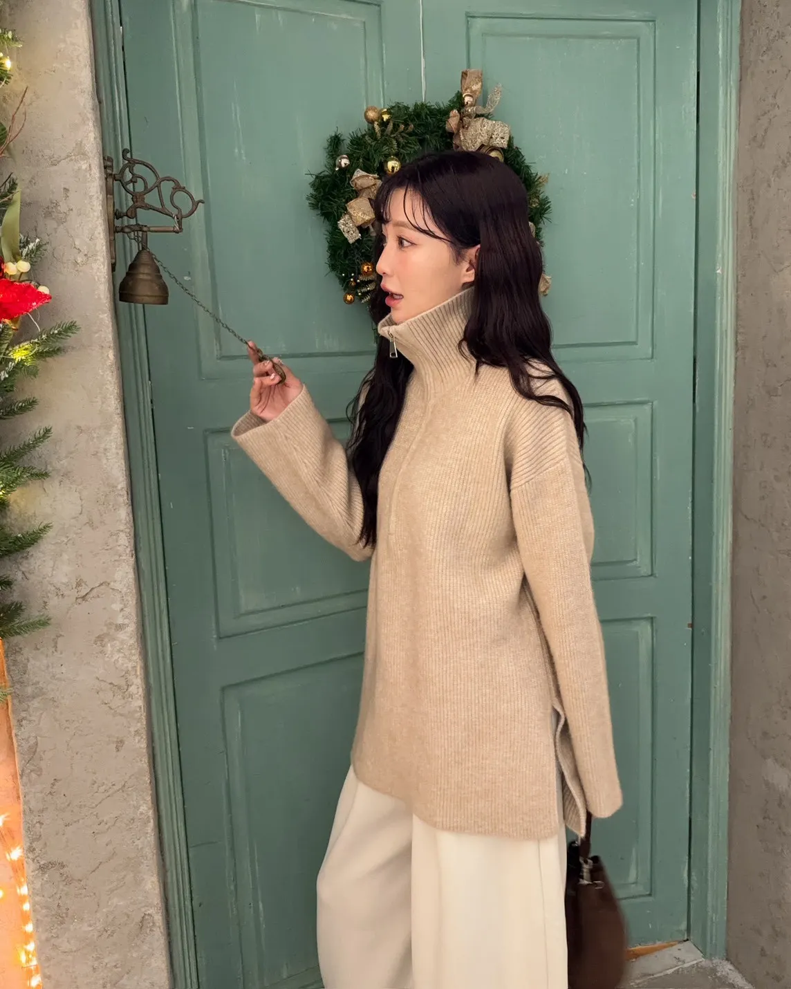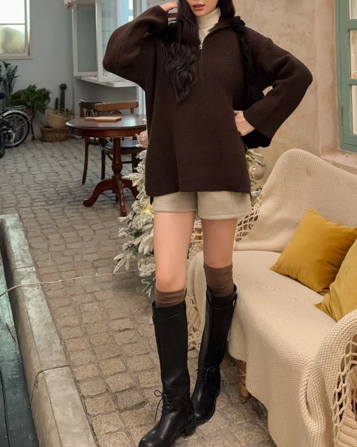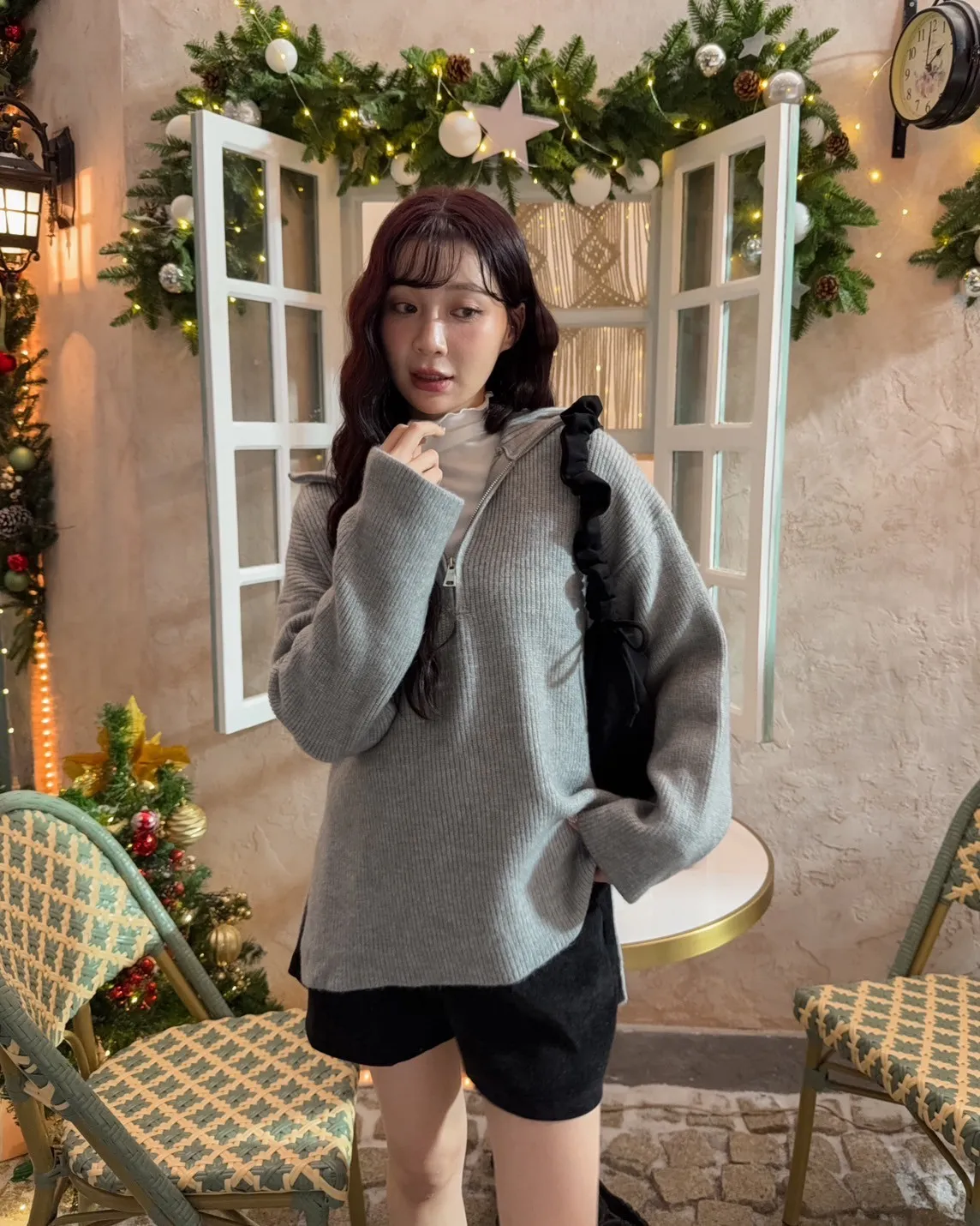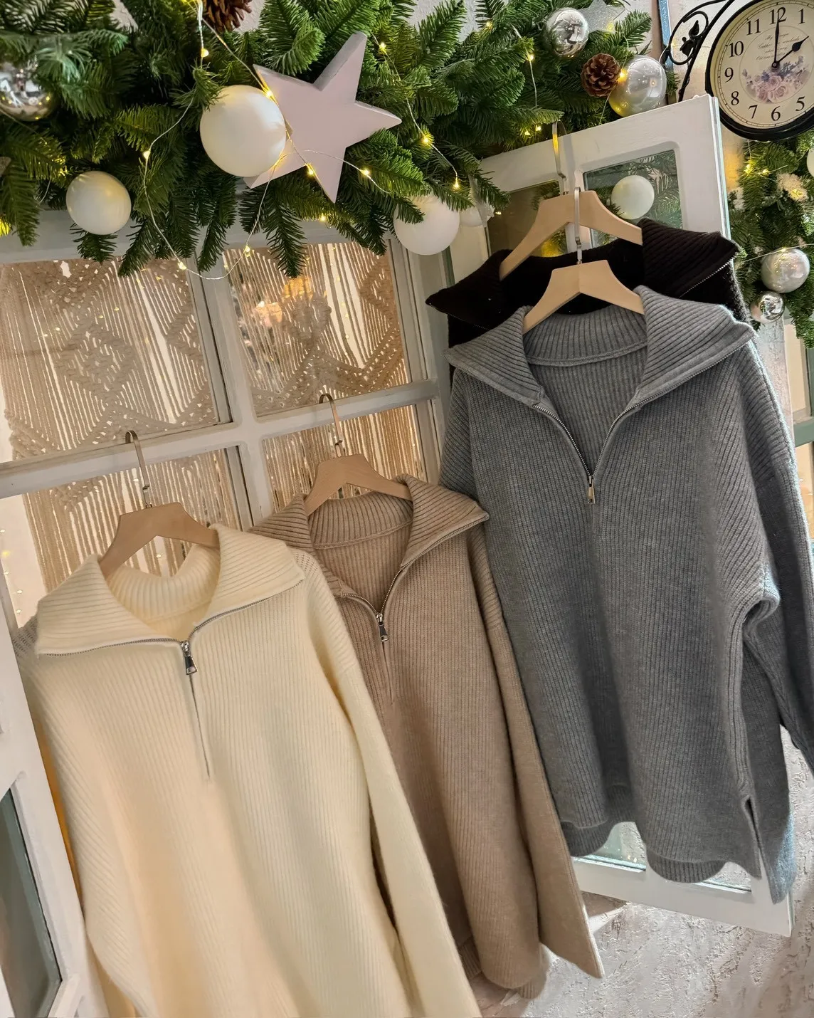 X0050遮屁屁前短後長拉鍊翻領毛衣(米白/深咖啡/奶杏/灰)