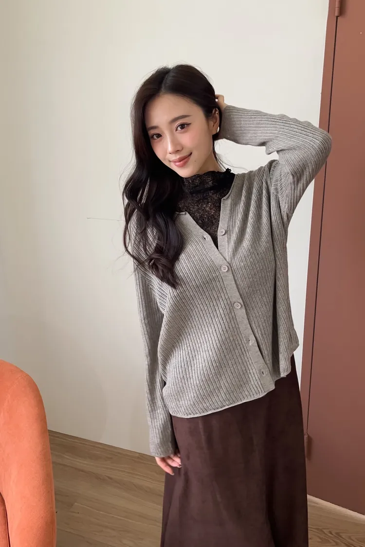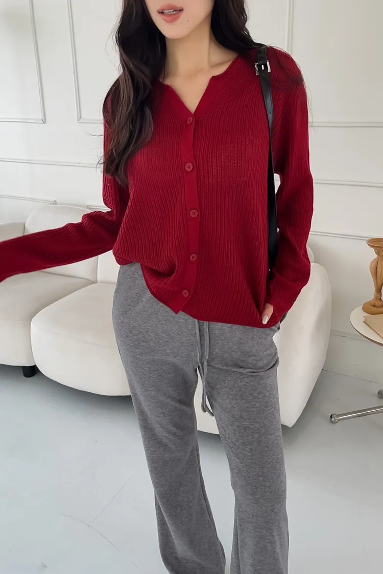 U0081手札情緣V領排扣薄針衣(杏/咖啡/紅/灰/深藍)