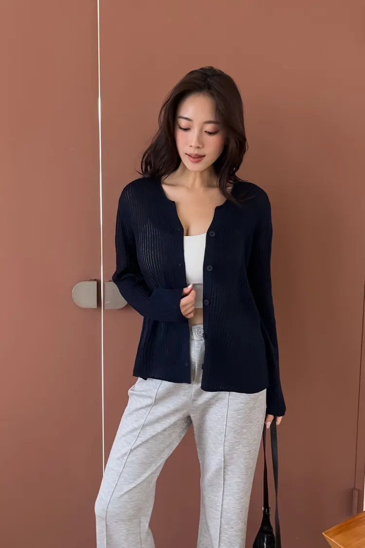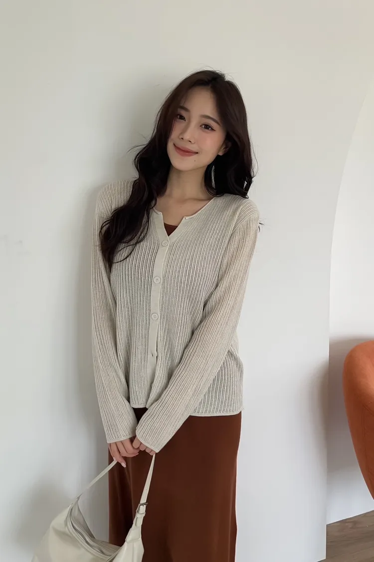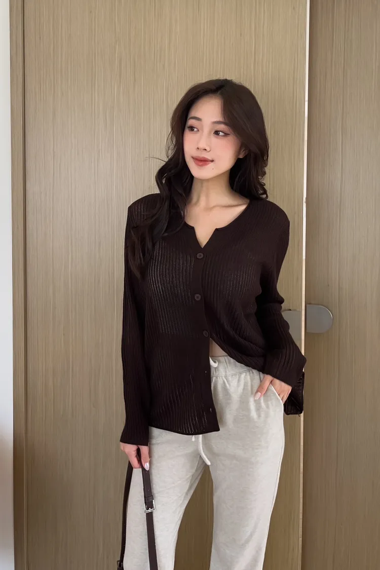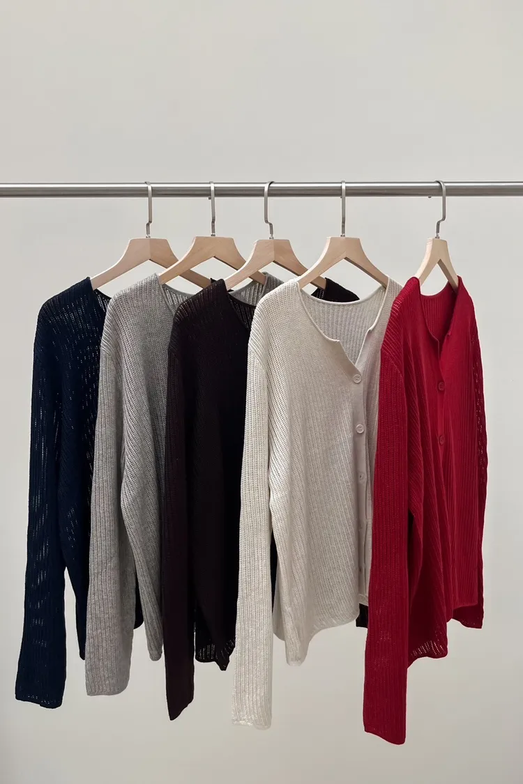 同色系鈕扣 小開襟V領 鬆軟洞洞針織 寬鬆落肩