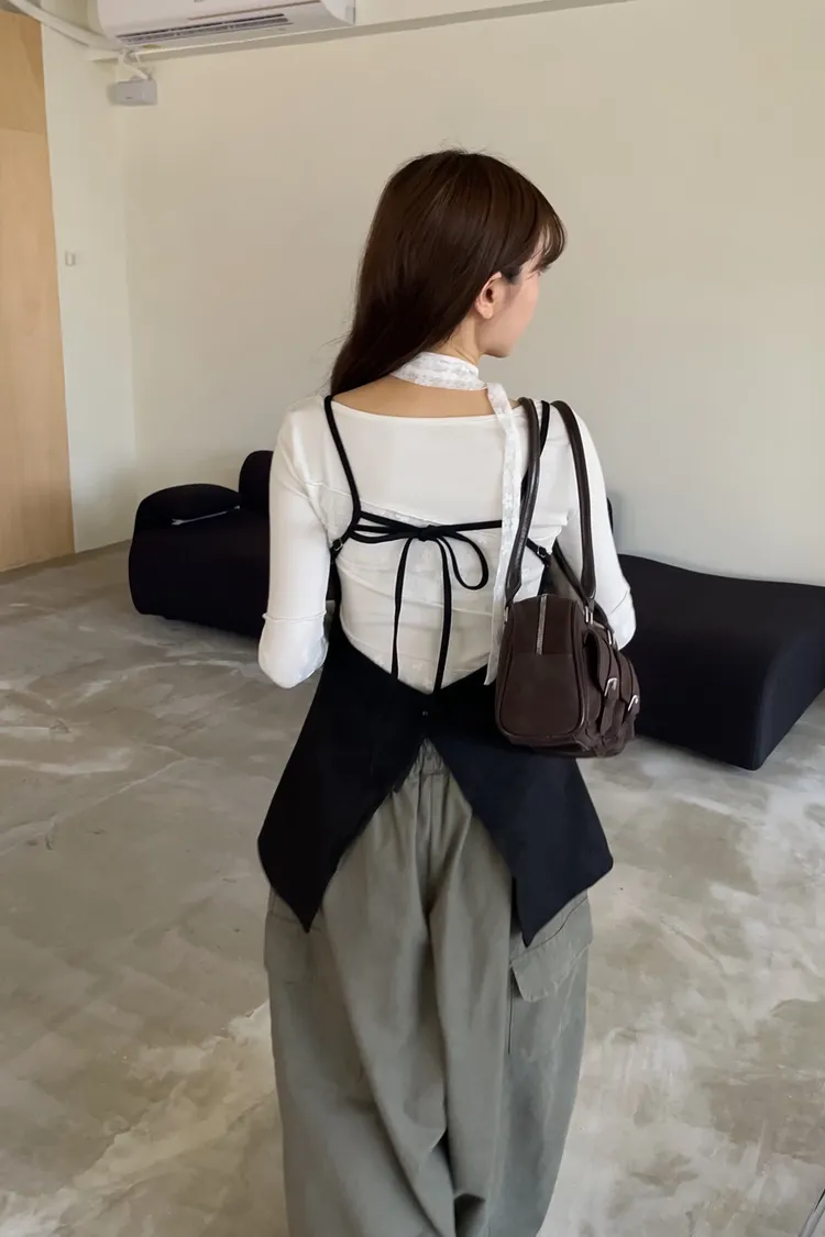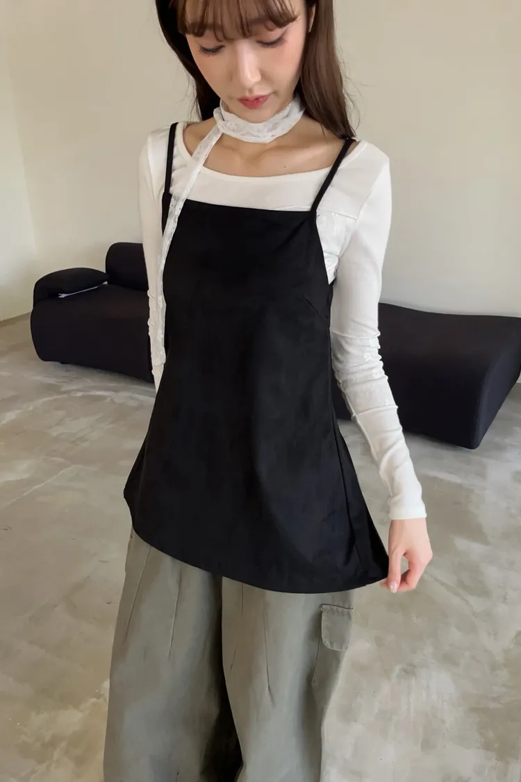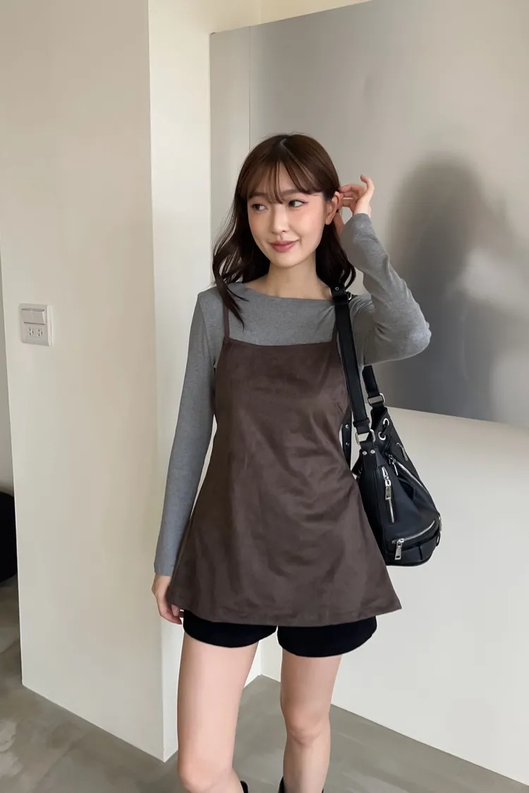 肩帶可調 後面大開岔(後綁帶+單顆鈕扣) 前面素面 麂皮無彈性