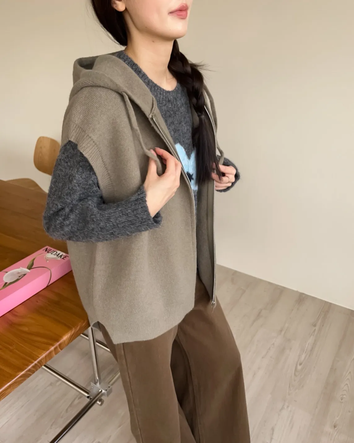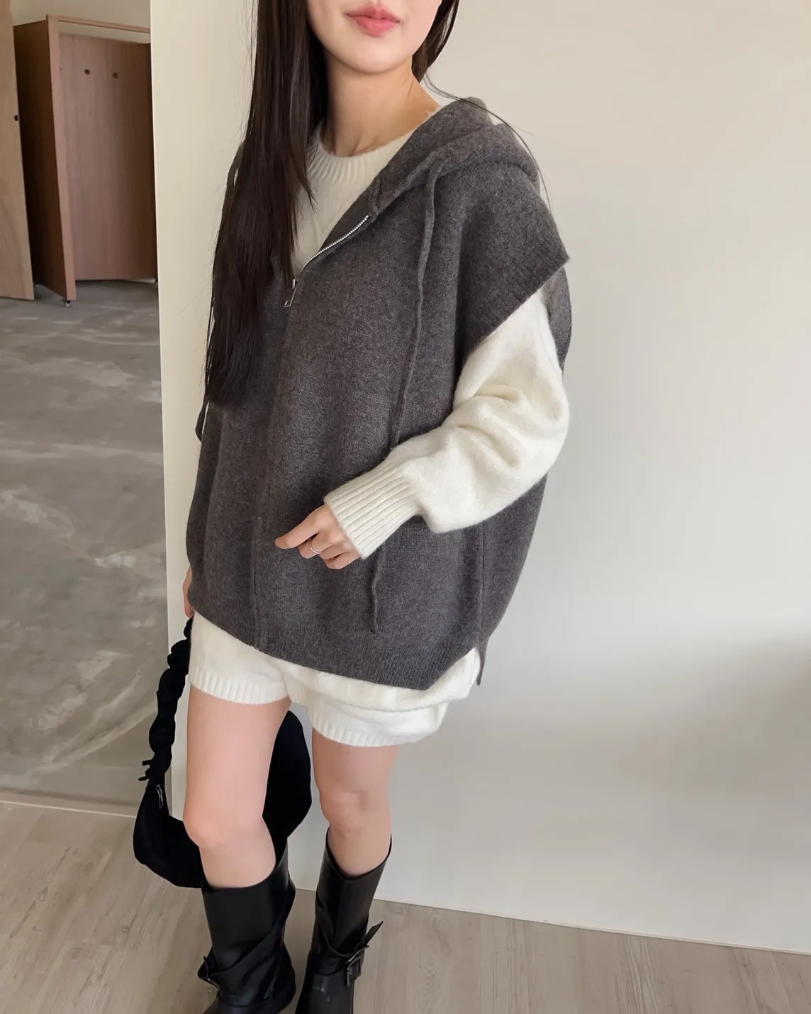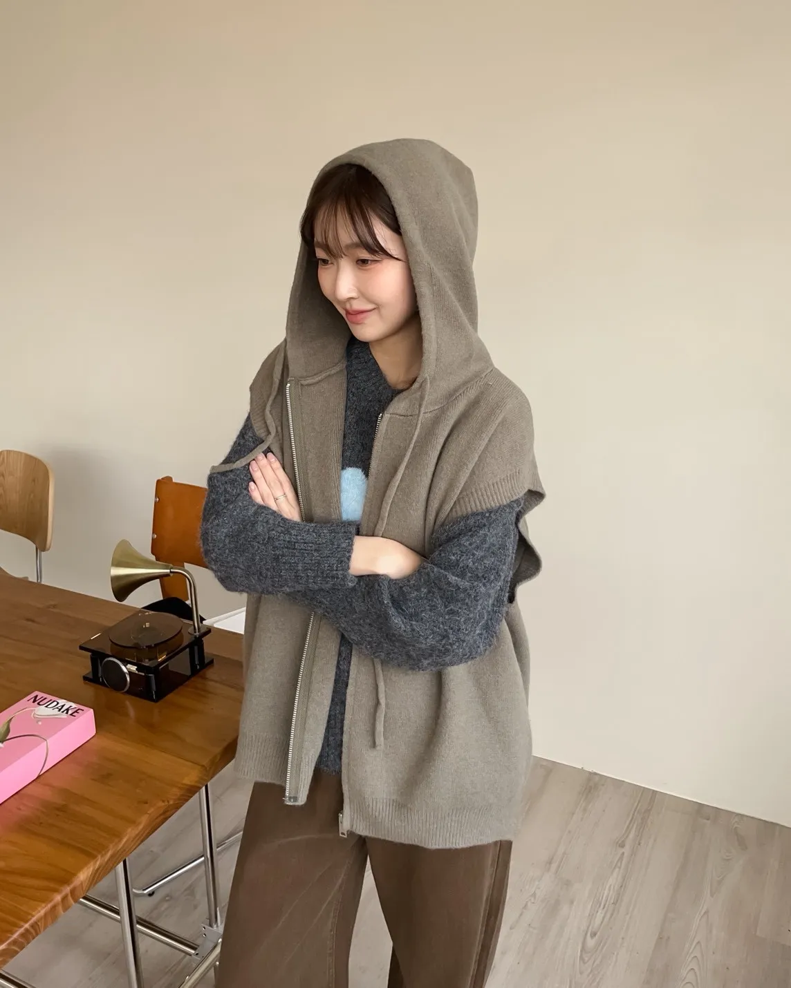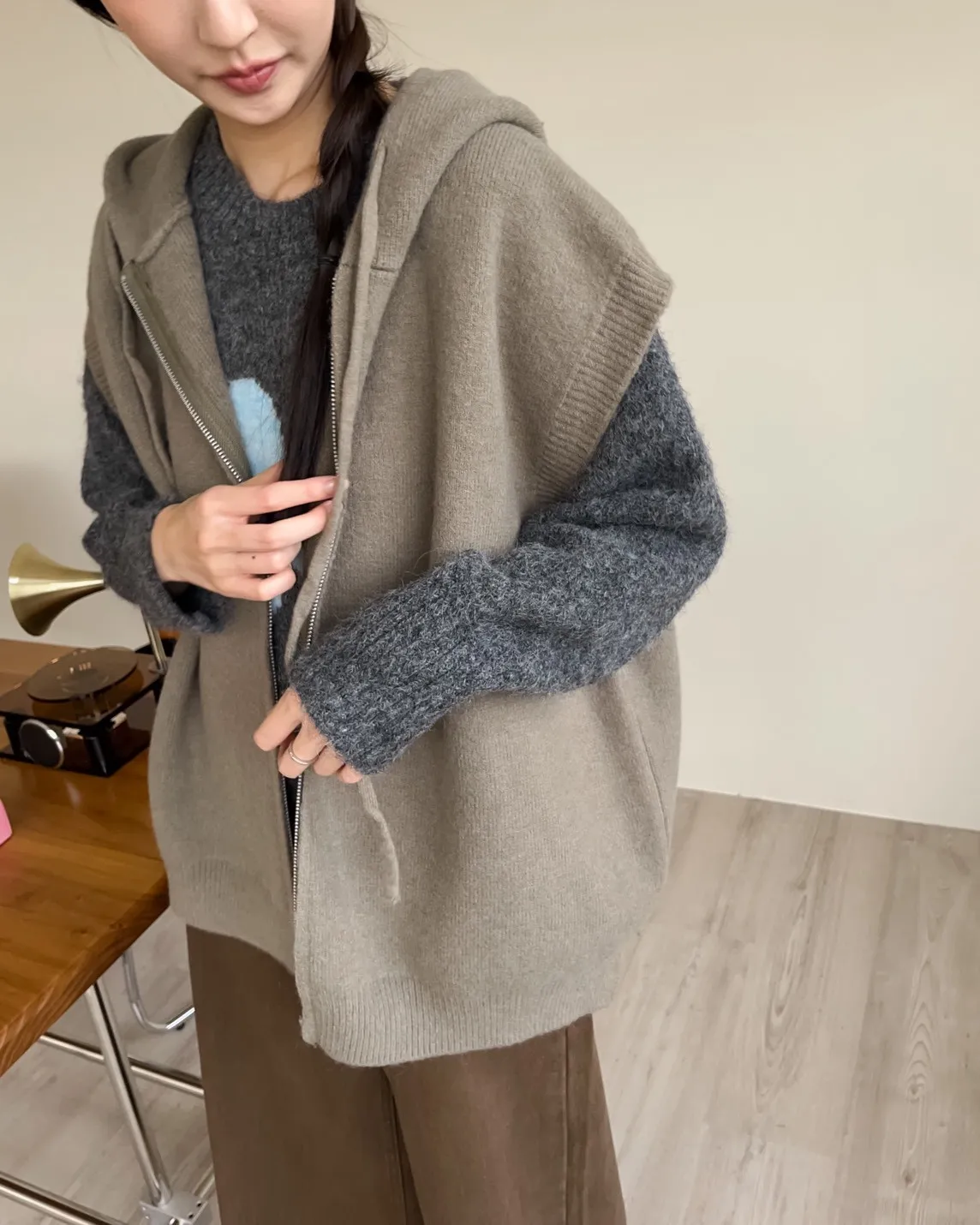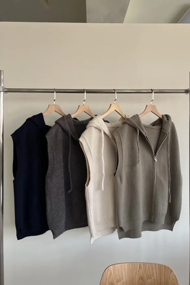 W0009隨性落肩有拉鍊連帽針織背心(杏/綠/灰/深藍)