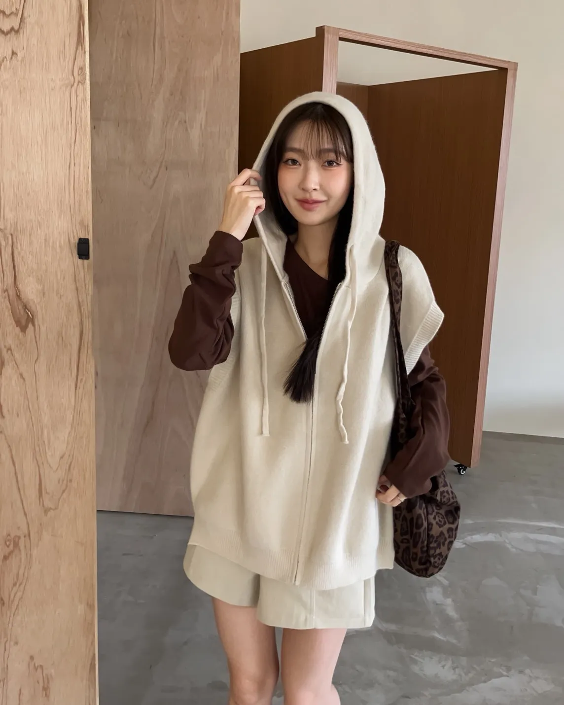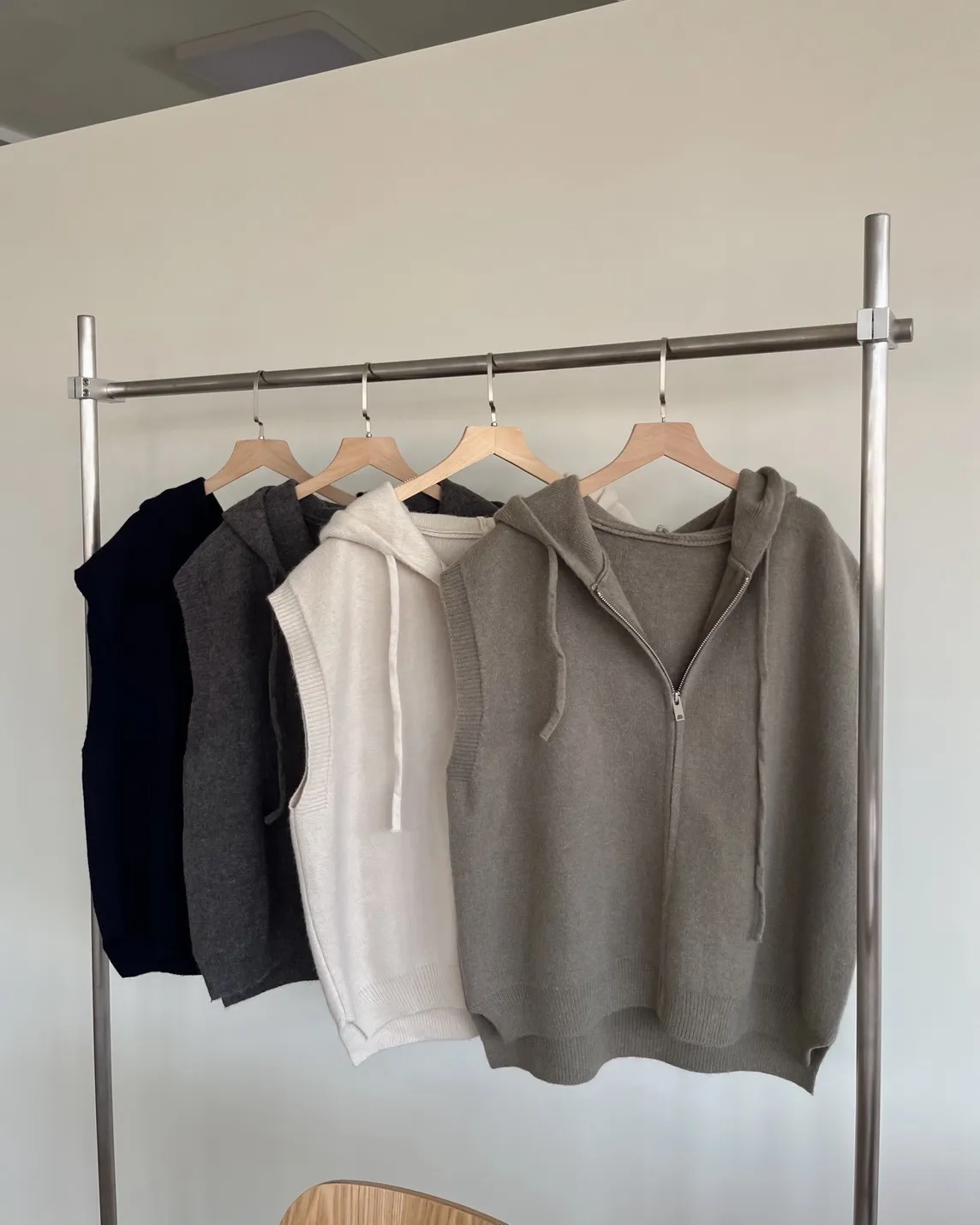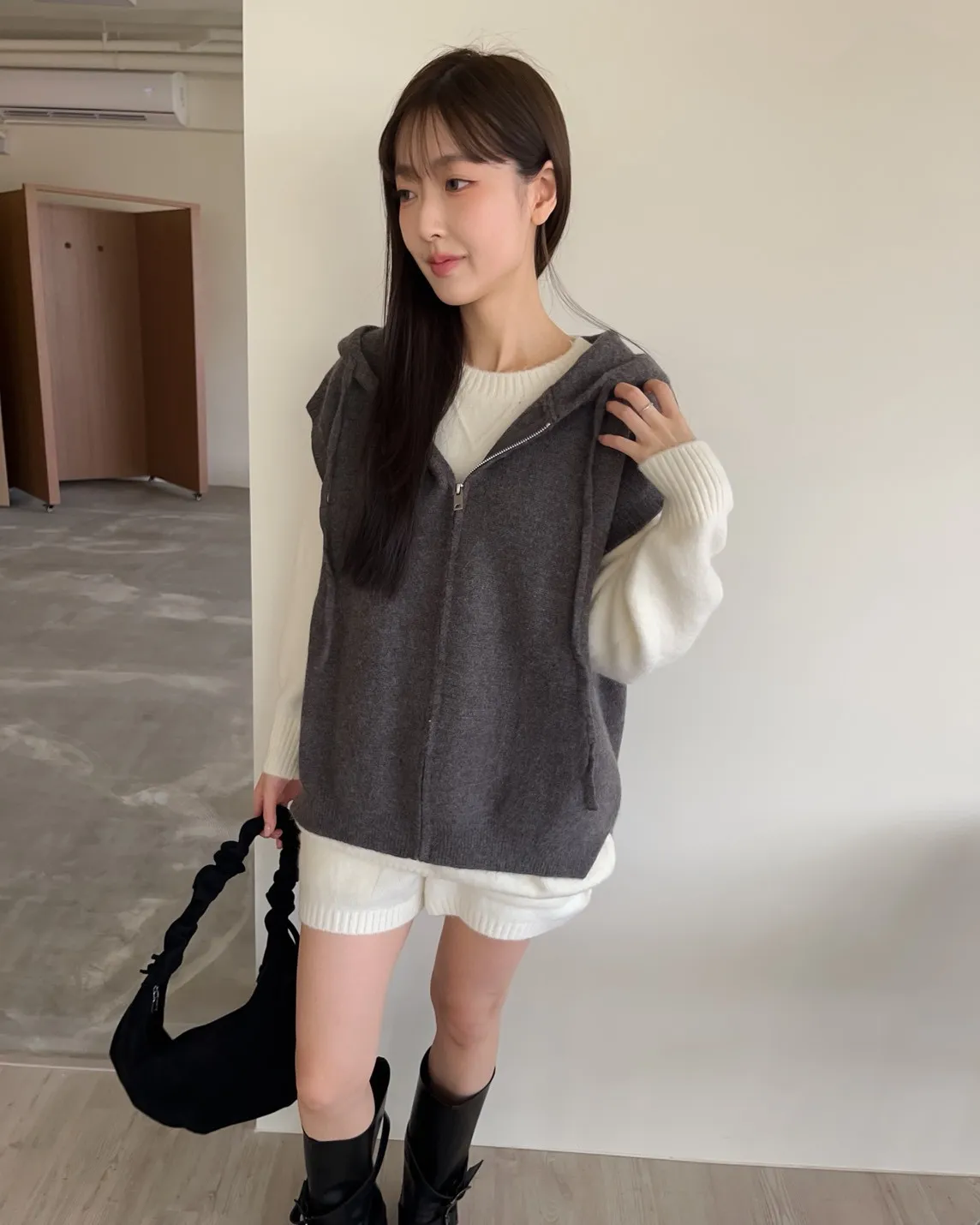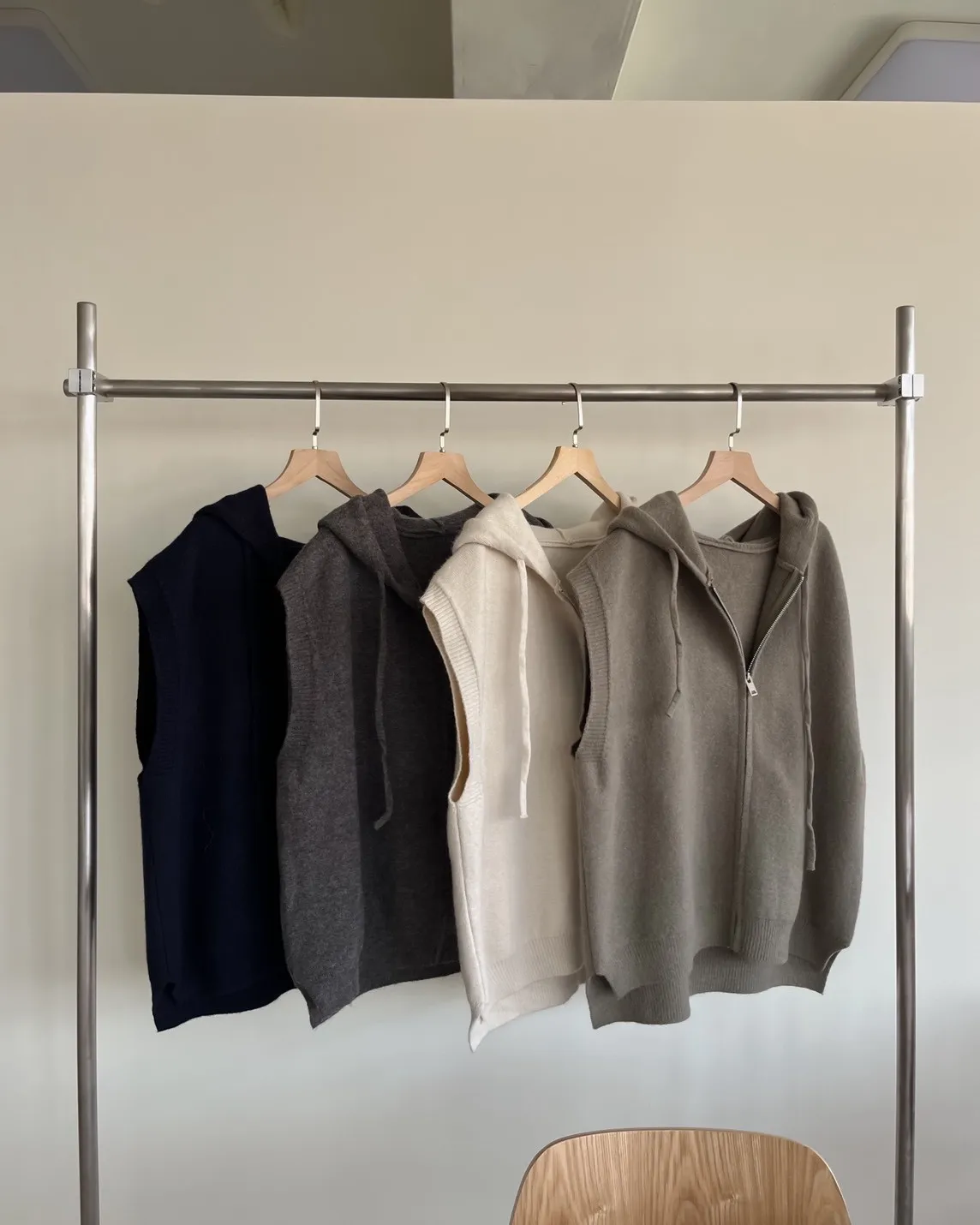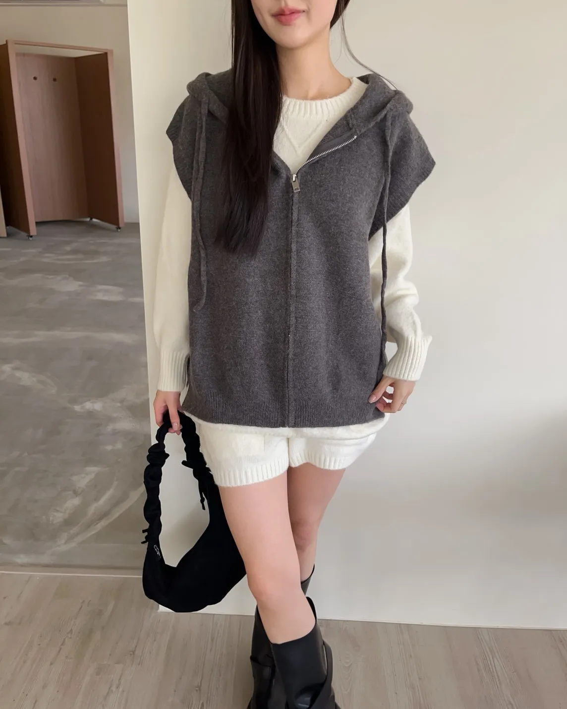 W0009隨性落肩有拉鍊連帽針織背心(杏/綠/灰/深藍)