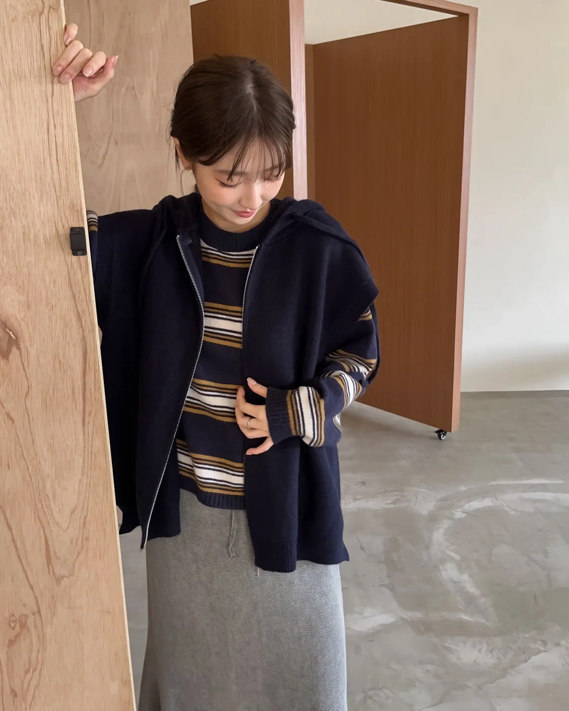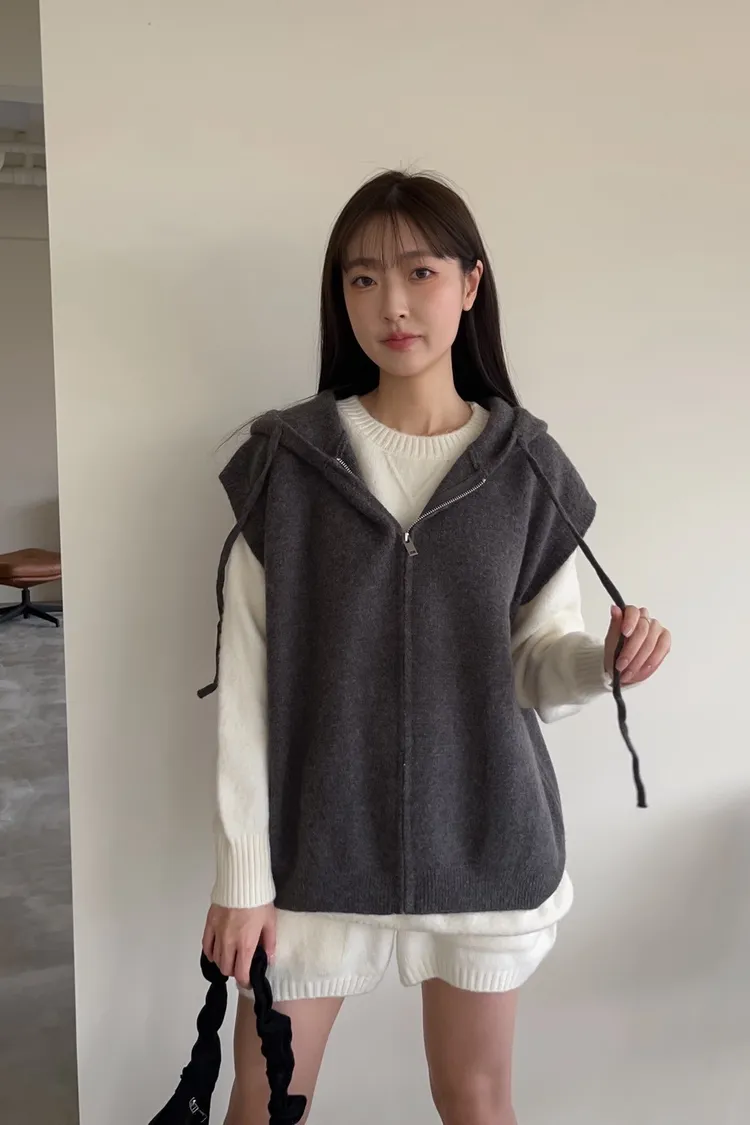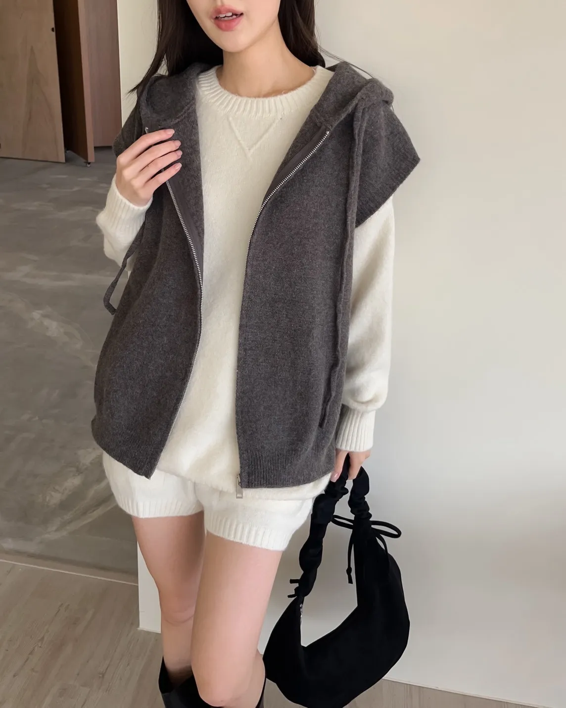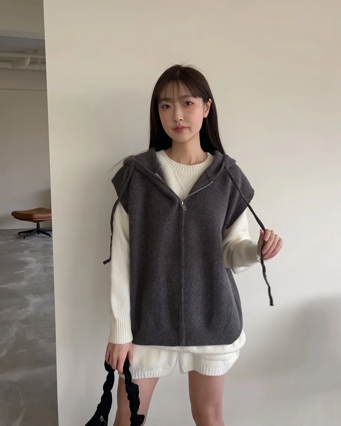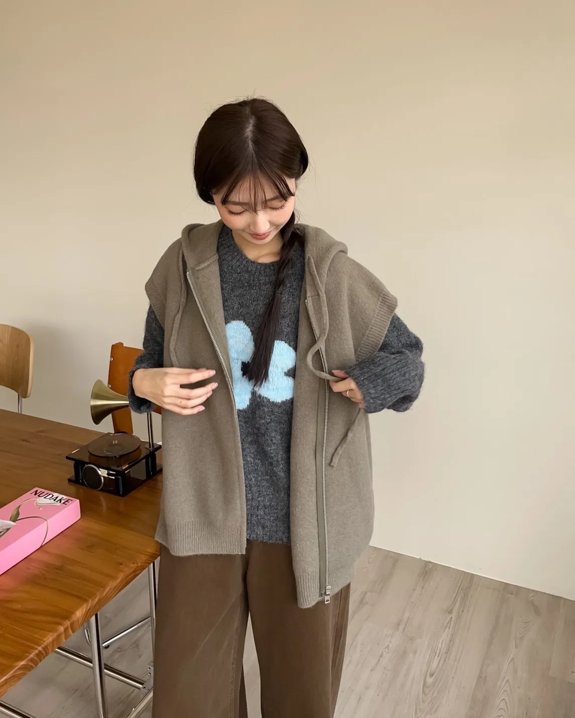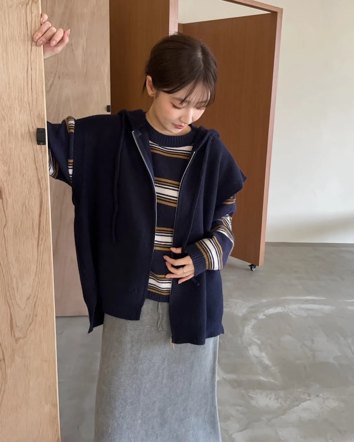 W0009隨性落肩有拉鍊連帽針織背心(杏/綠/灰/深藍)