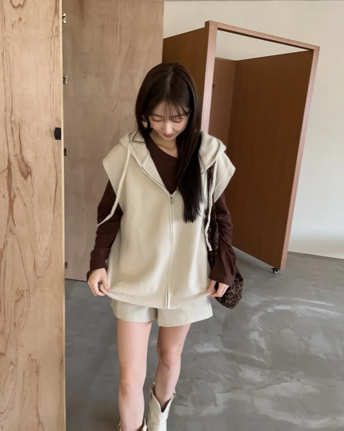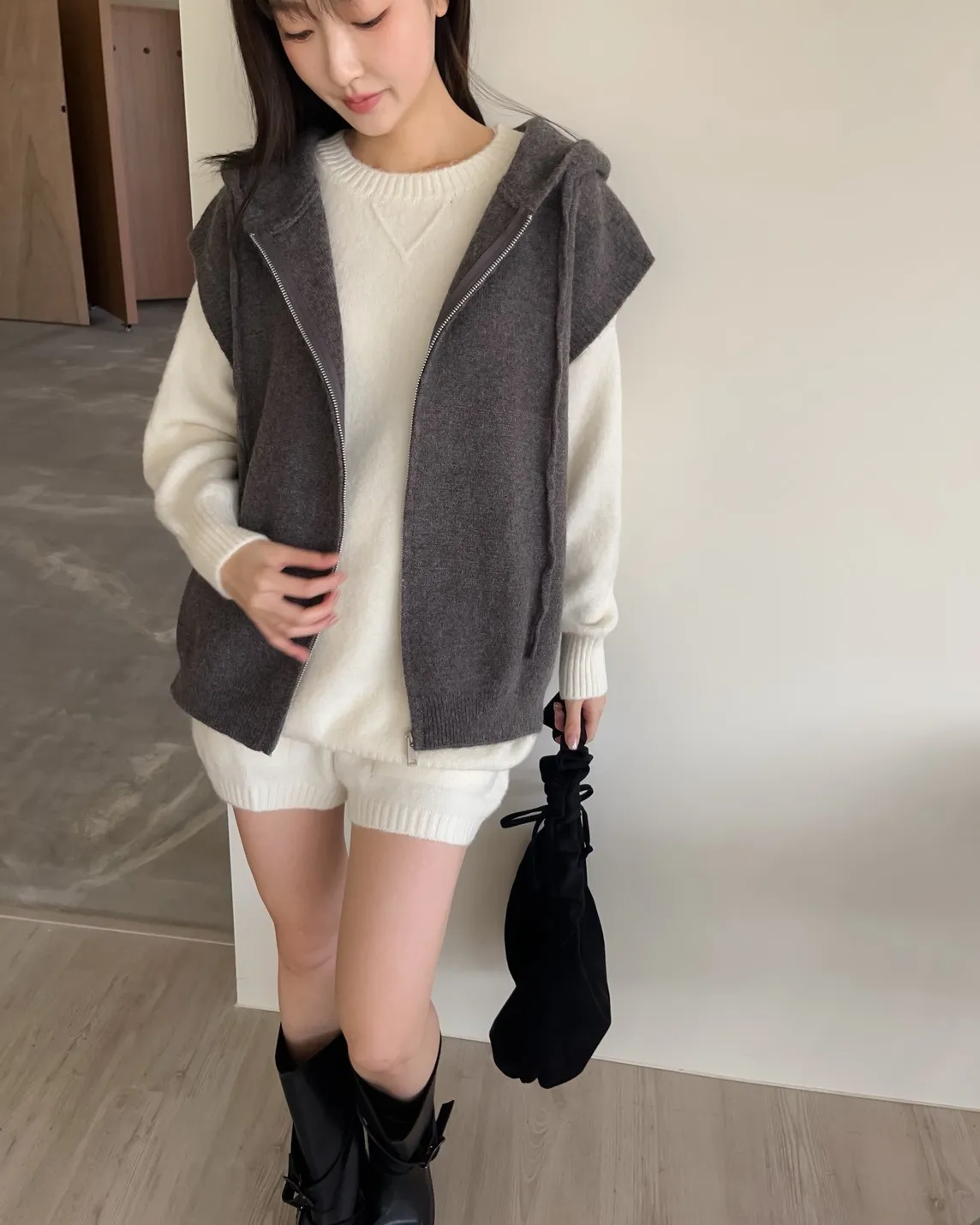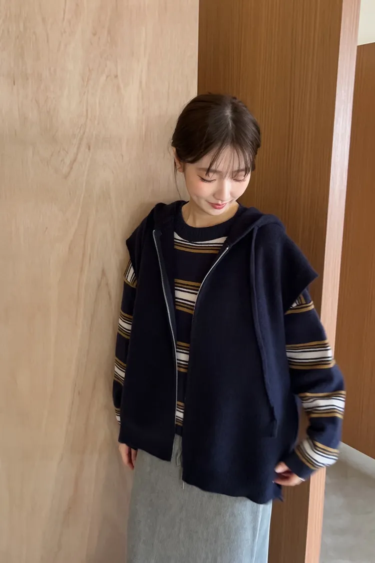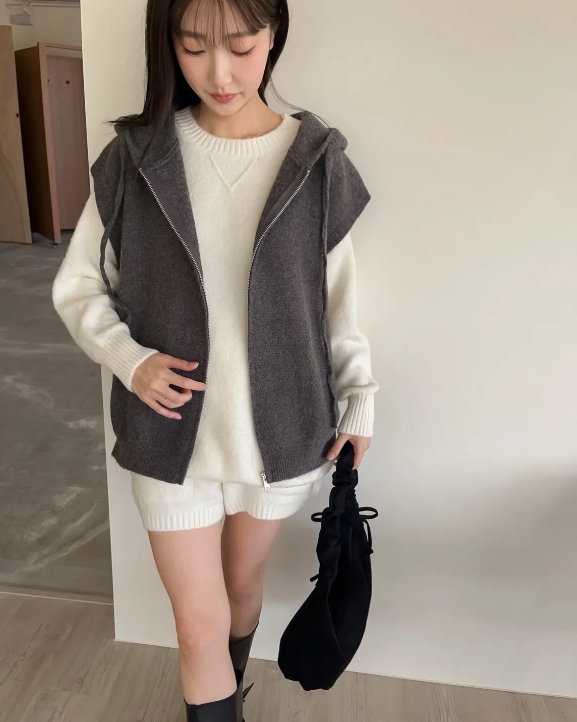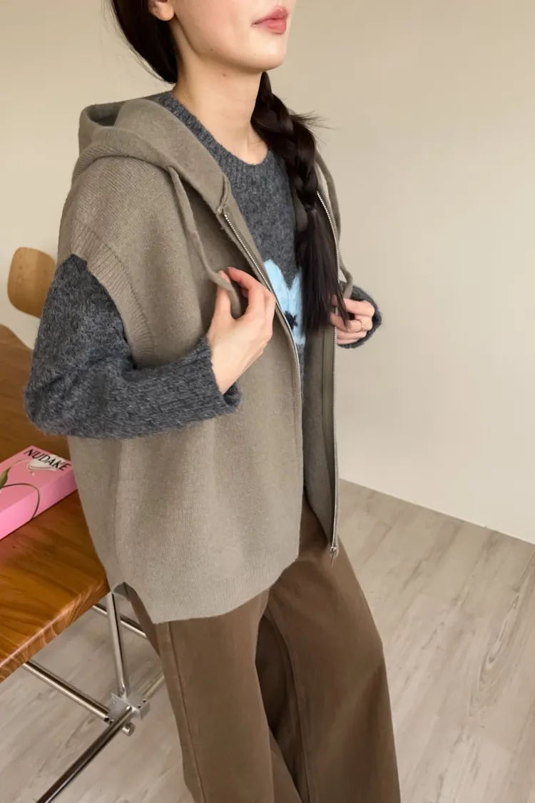 W0009隨性落肩有拉鍊連帽針織背心(杏/綠/灰/深藍)